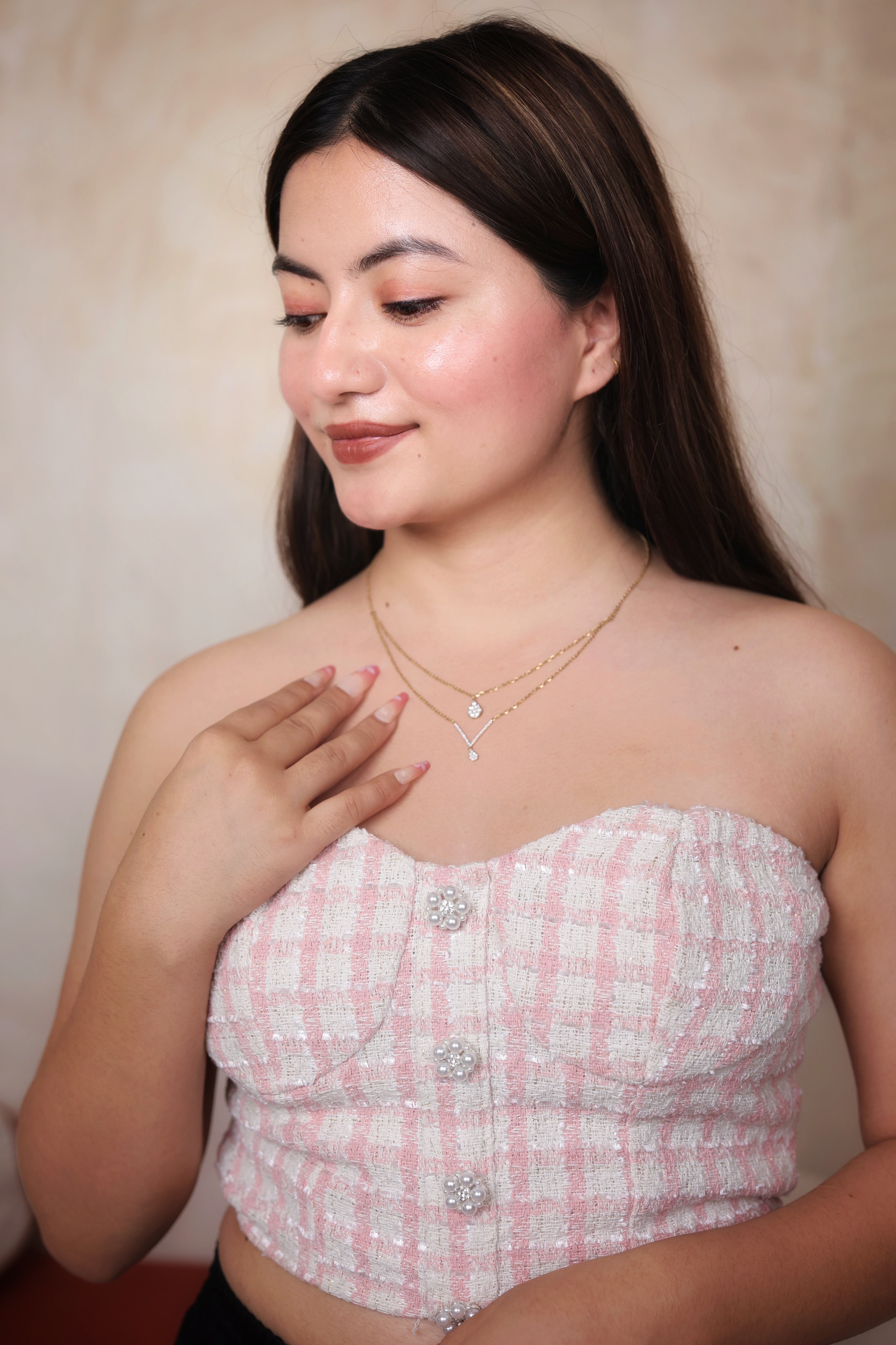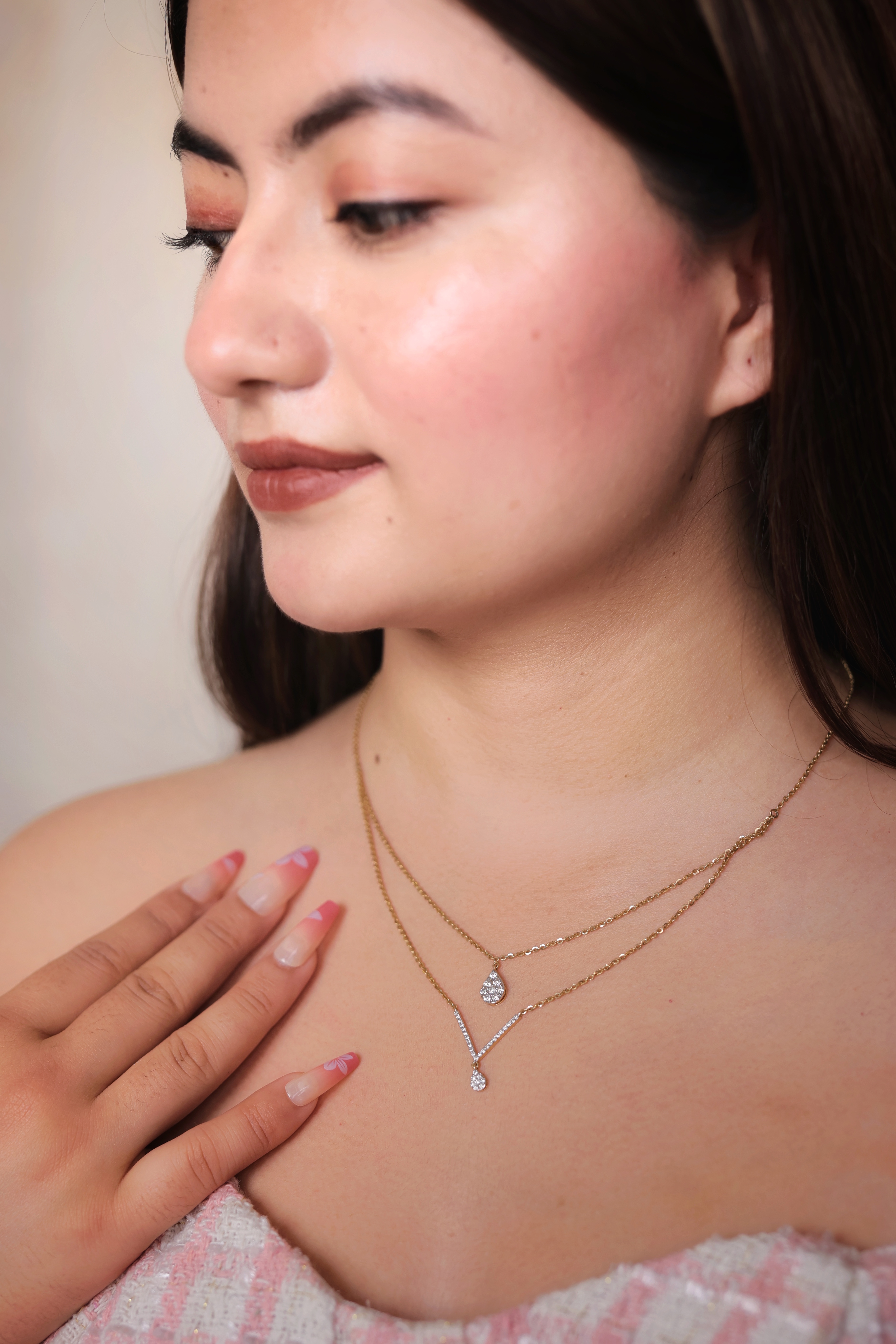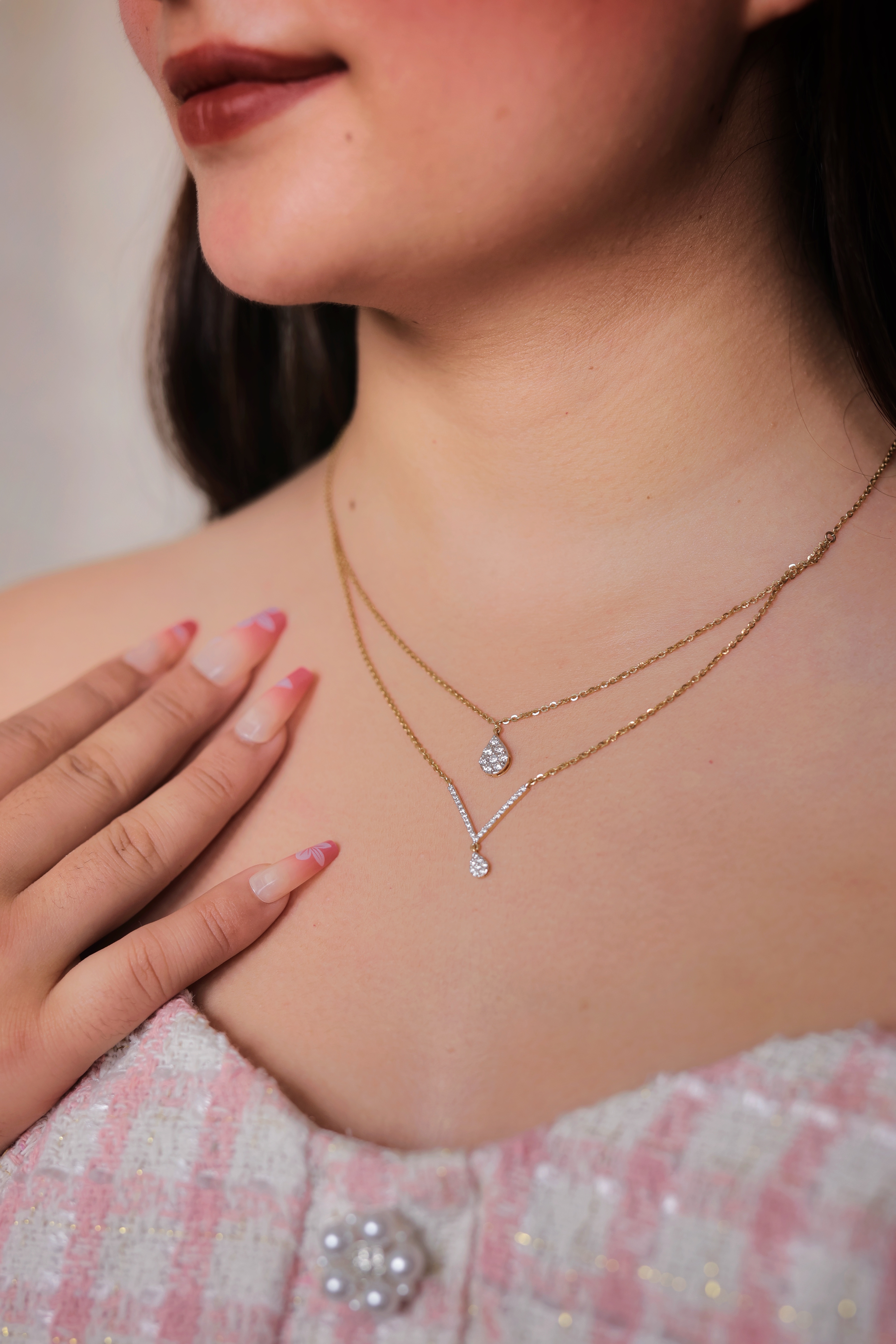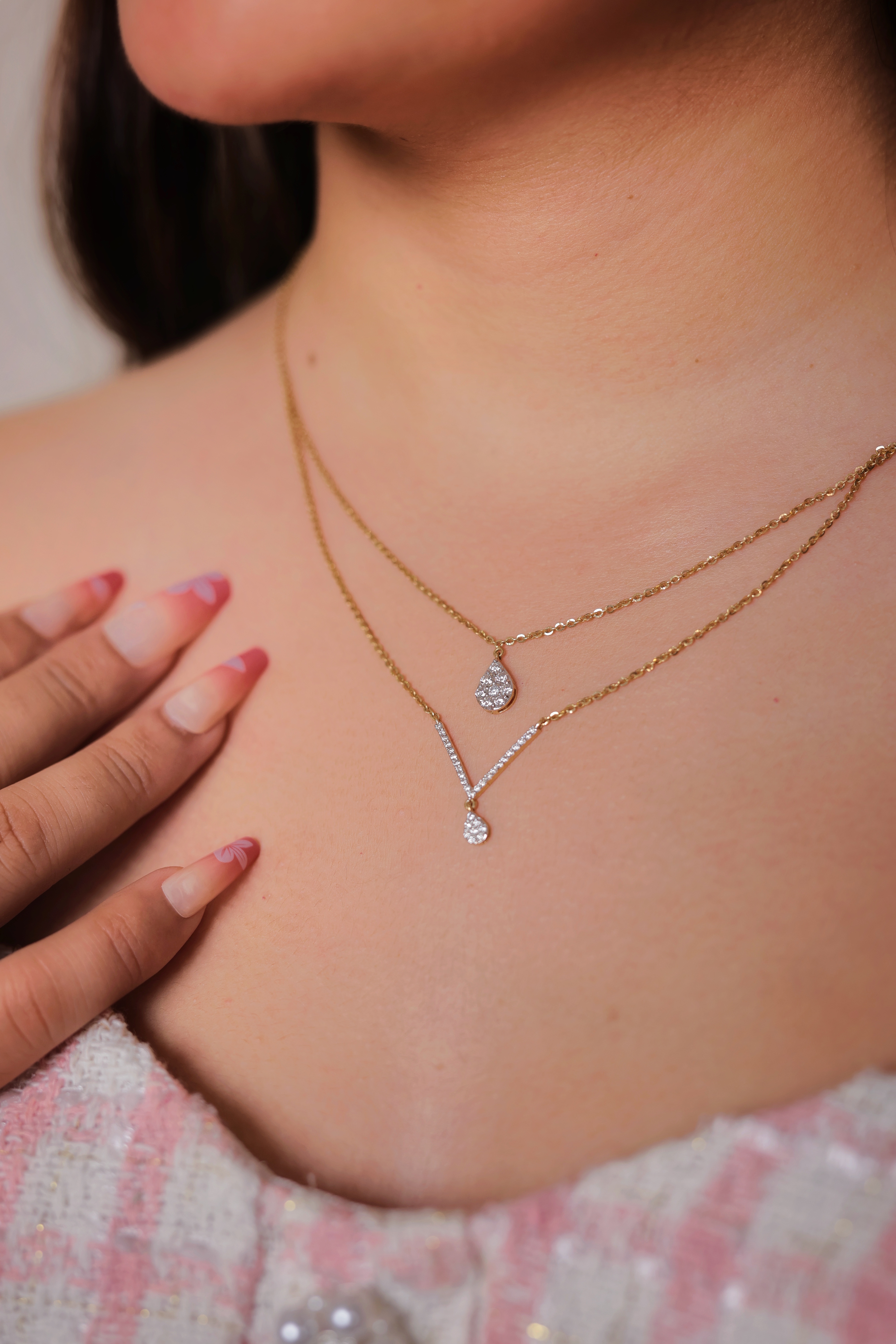 Elegant 22K gold layered chain featuring two shimmering diamond-style droplet pendants—perfect for modern, everyday and occasion wear.