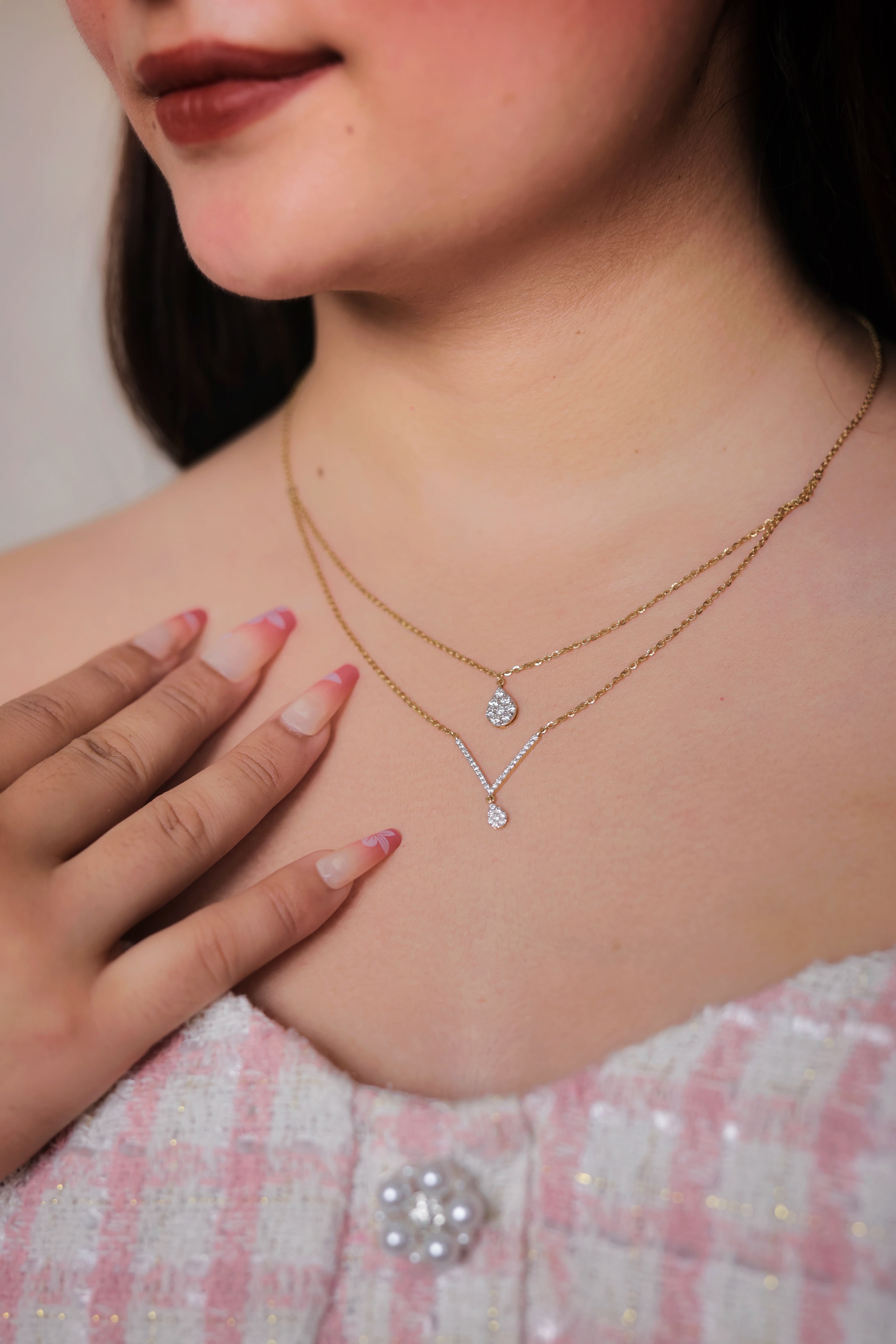 The first pendant highlights a classic teardrop shape, while the longer layer carries a V-shaped pendant with a matching droplet charm—enhancing the neckline with dimension and sophistication. Crafted in pure 22K gold, the chain offers exceptional shine, premium finish, and long-lasting durability.