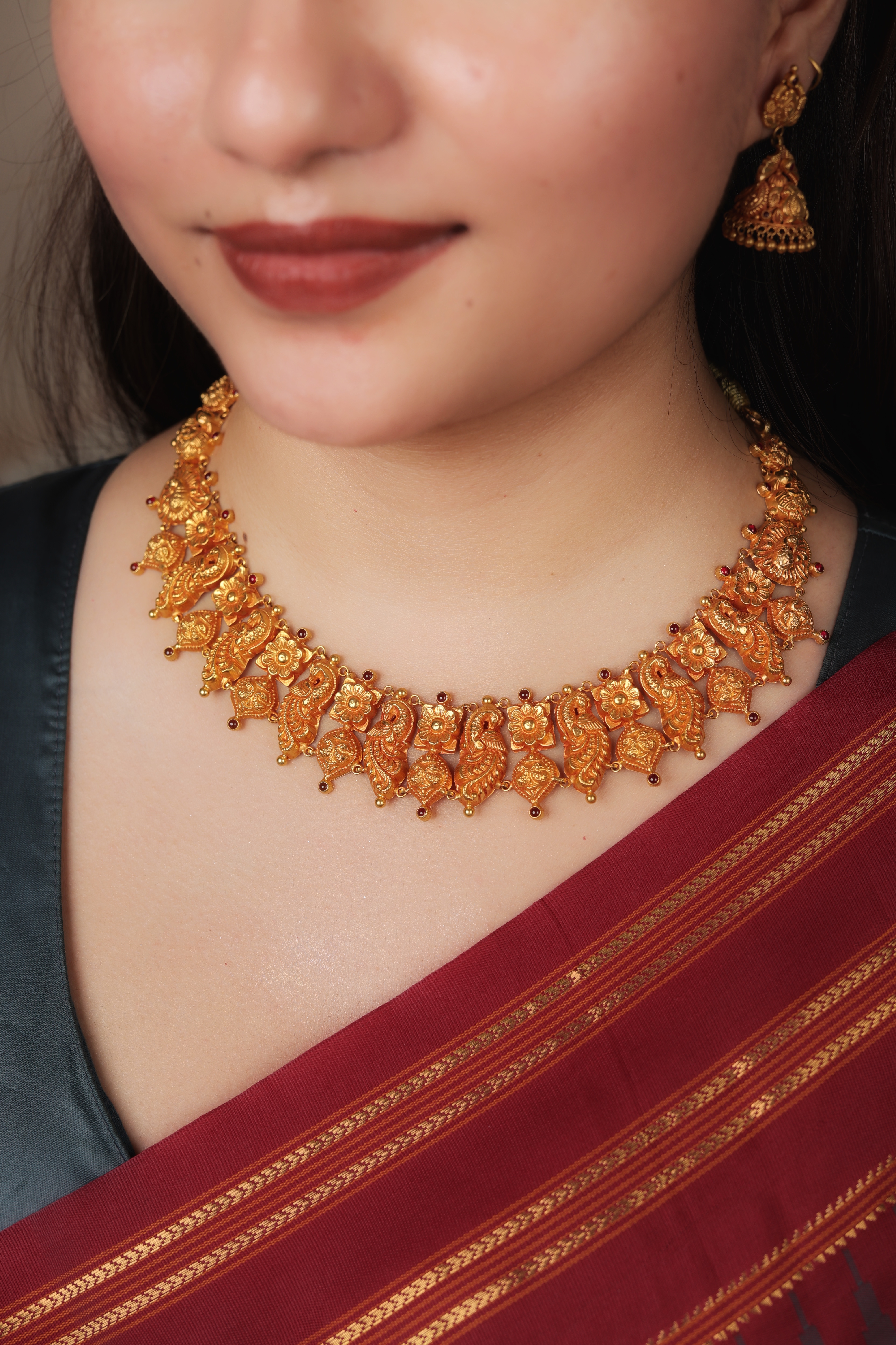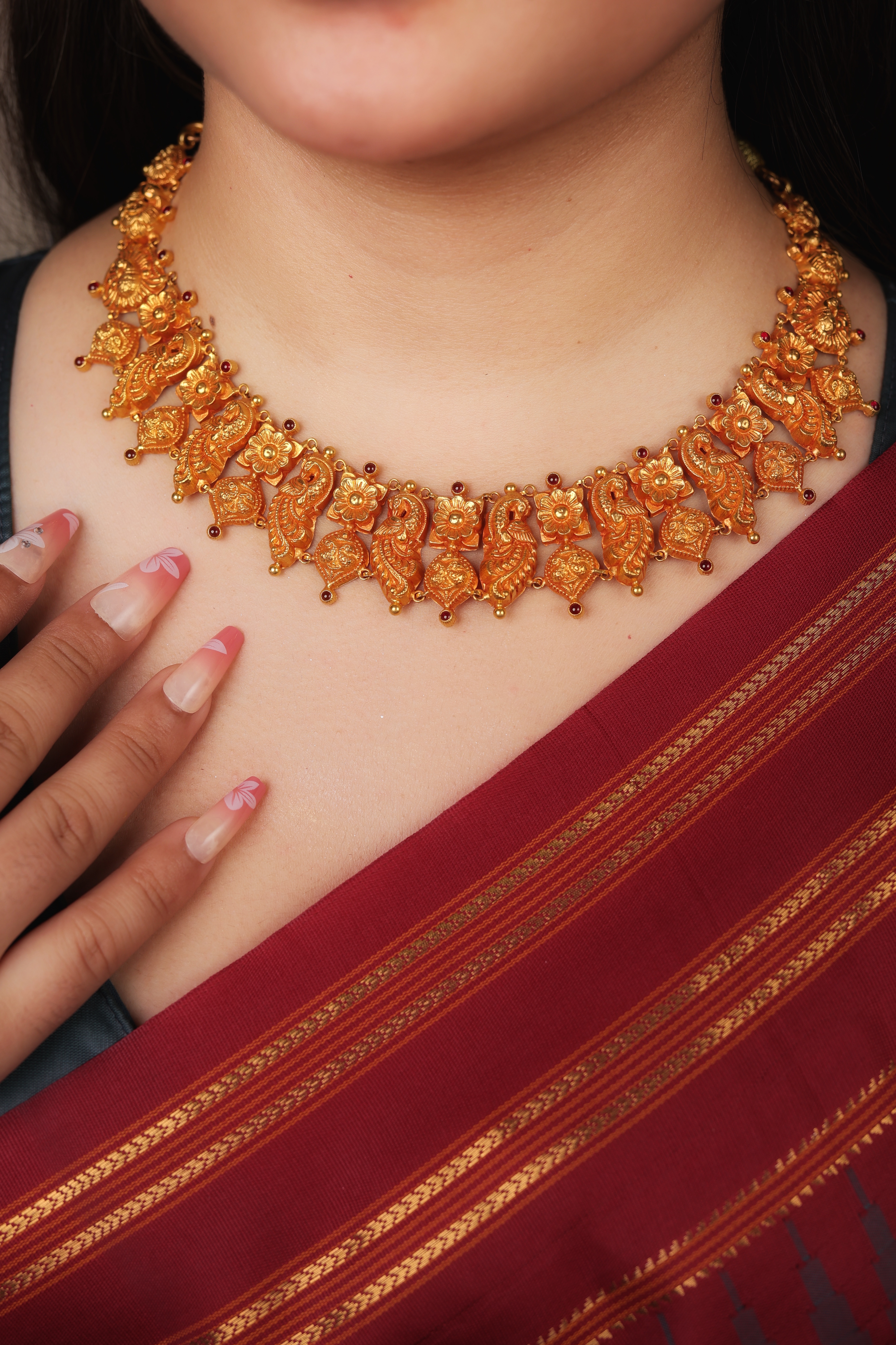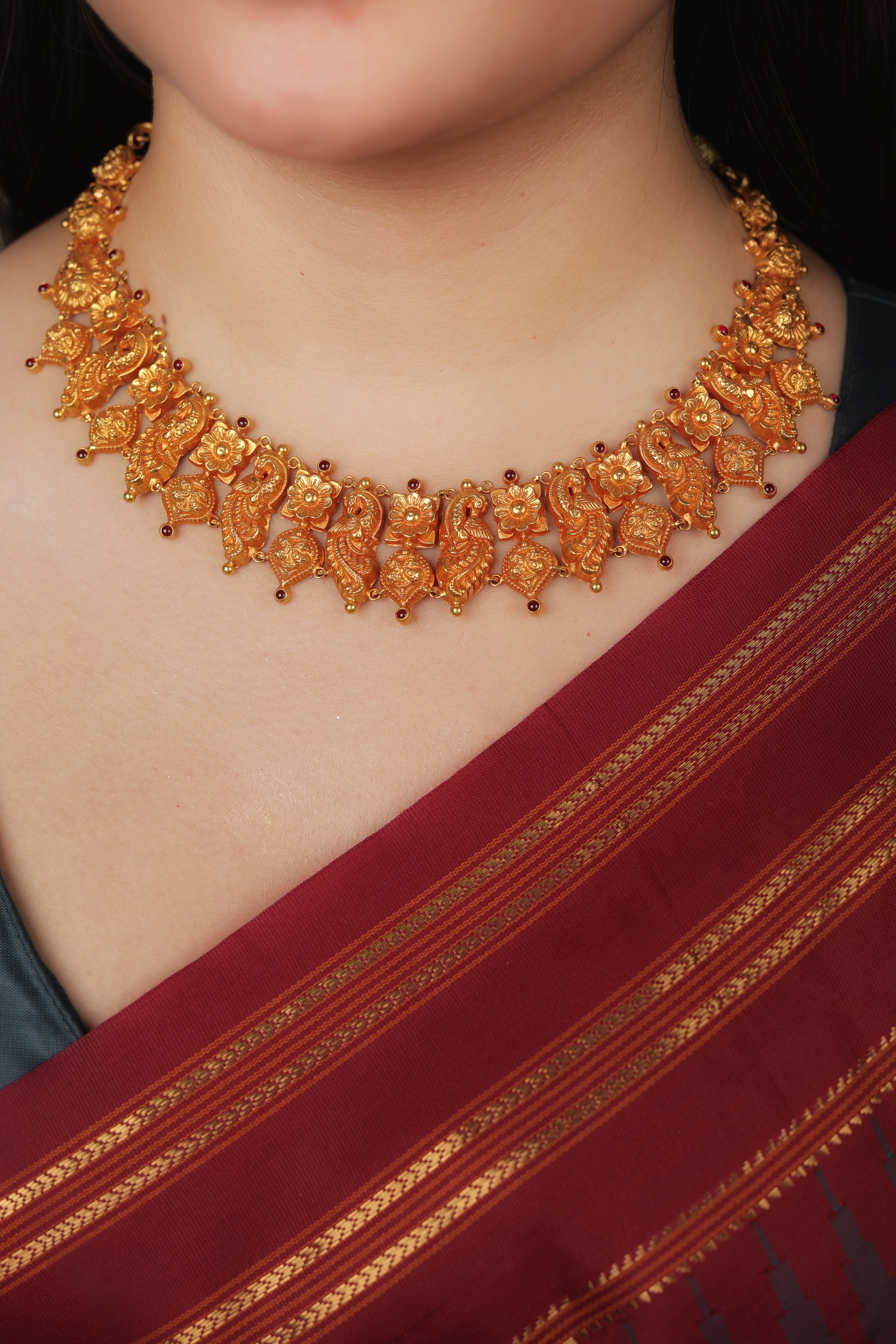 The necklace showcases finely detailed temple motifs, floral patterns, and peacock-inspired elements, reflecting skilled craftsmanship and cultural richness.