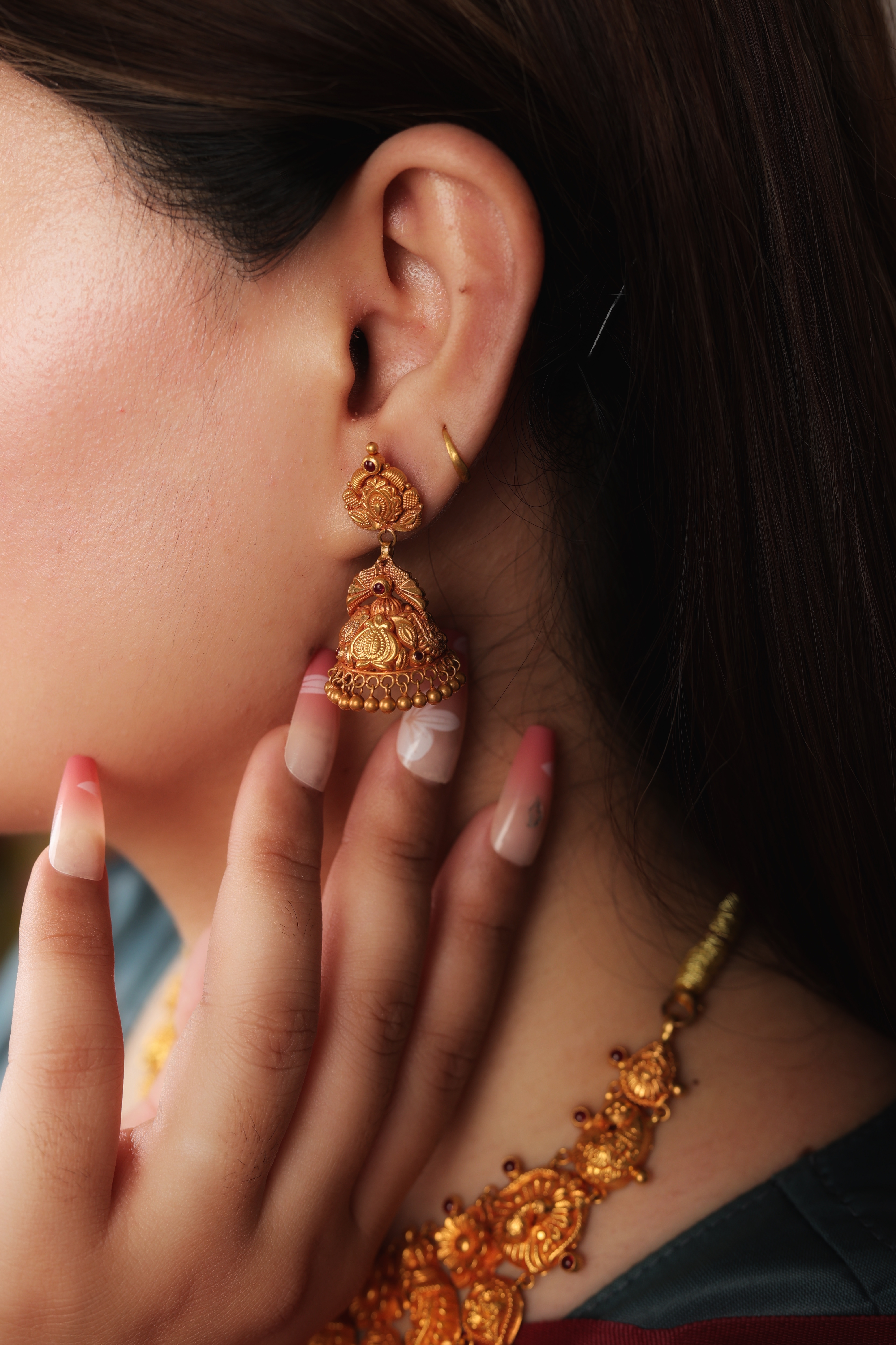 Design: Traditional South Indian temple jewellery Includes: Necklace & matching jhumka earrings Finish: High-polish antique gold look Style: Classic, ethnic & festive Ideal For: Weddings, festivals, pooja, bridal wear & gifting