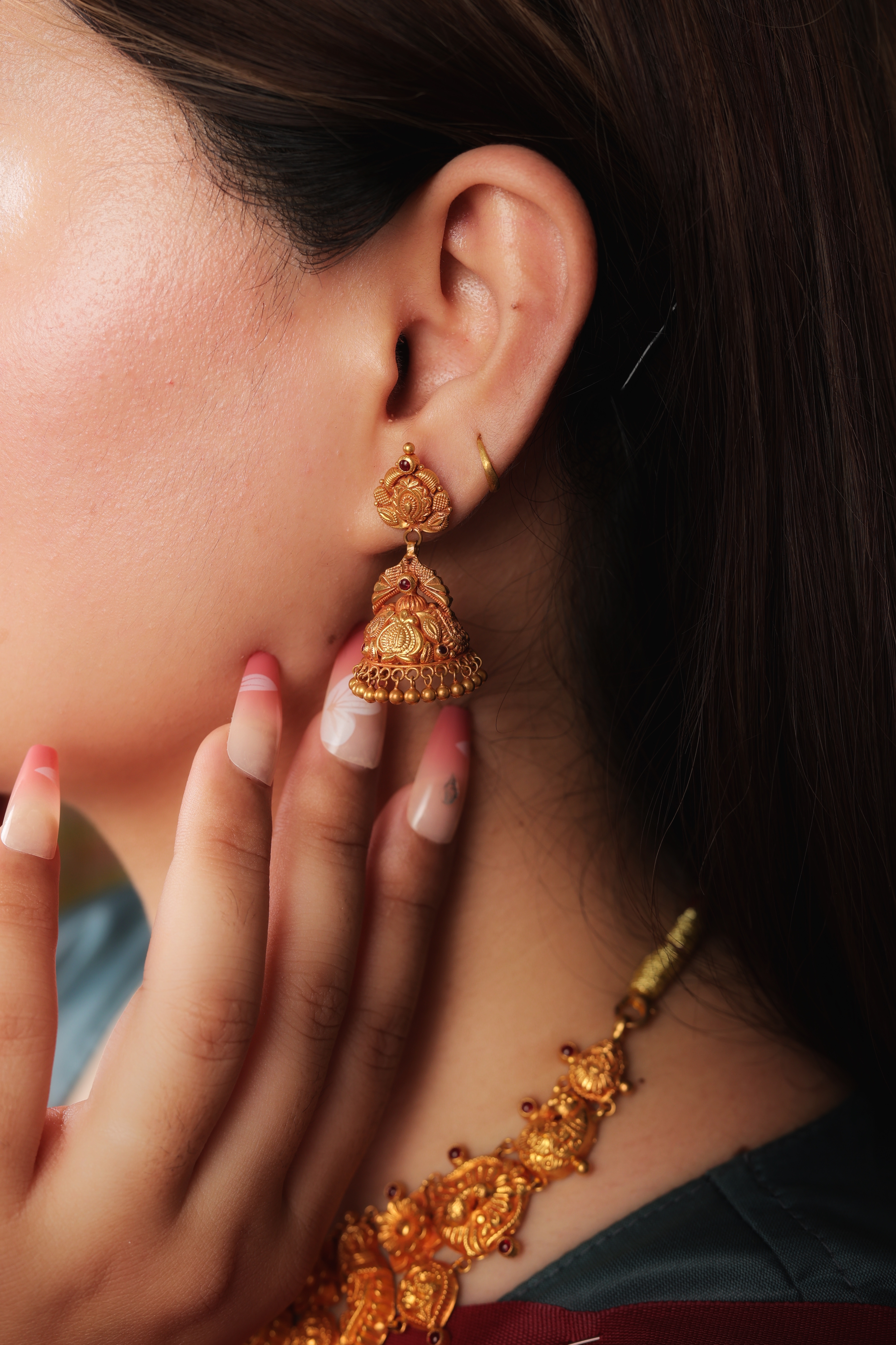 Traditional Temple Jewellery Gold Necklace Set with Jhumka Earrings