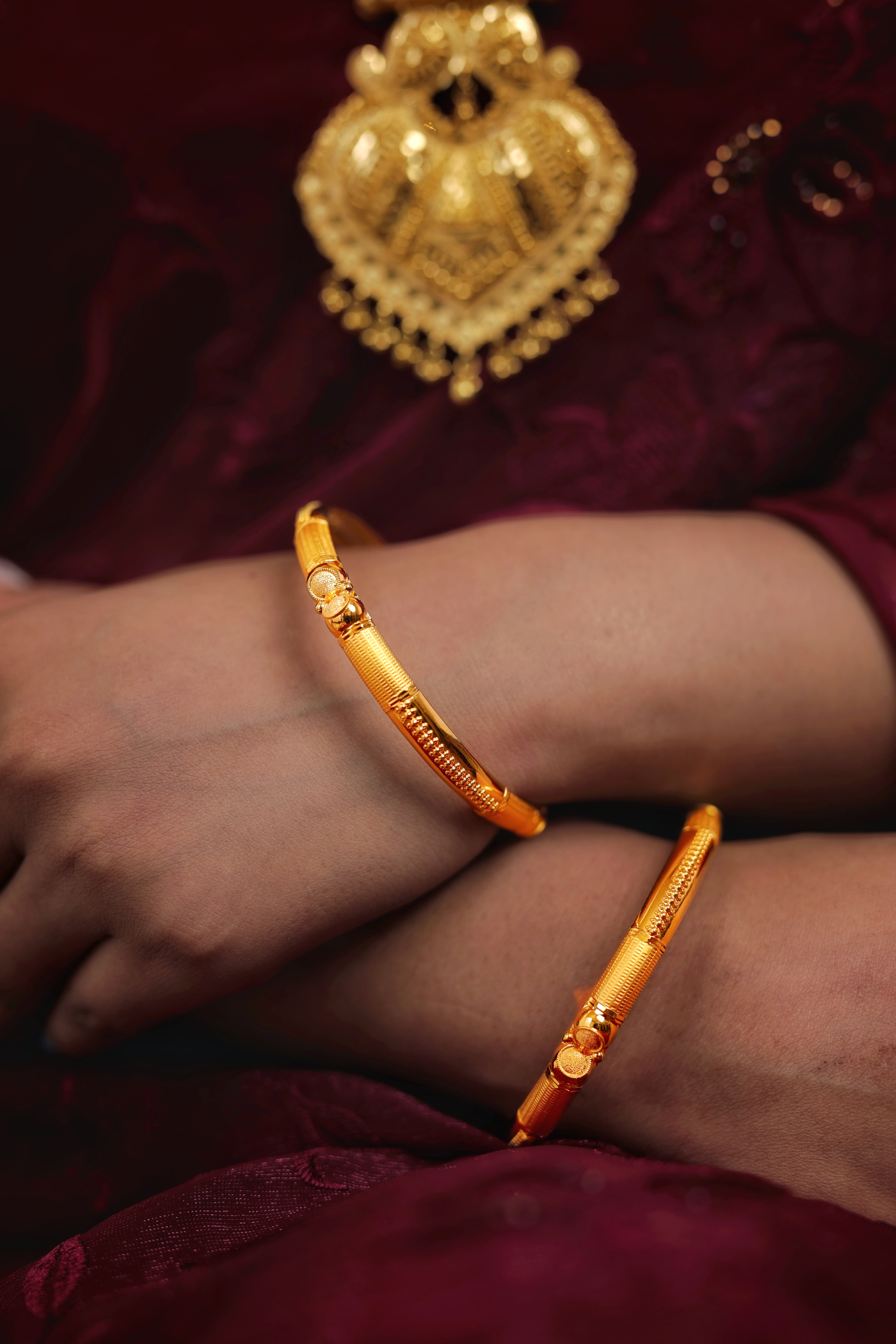 Elegant classic gold bangles featuring fine textured detailing, perfect for traditional wear, festive occasions, and daily styling.