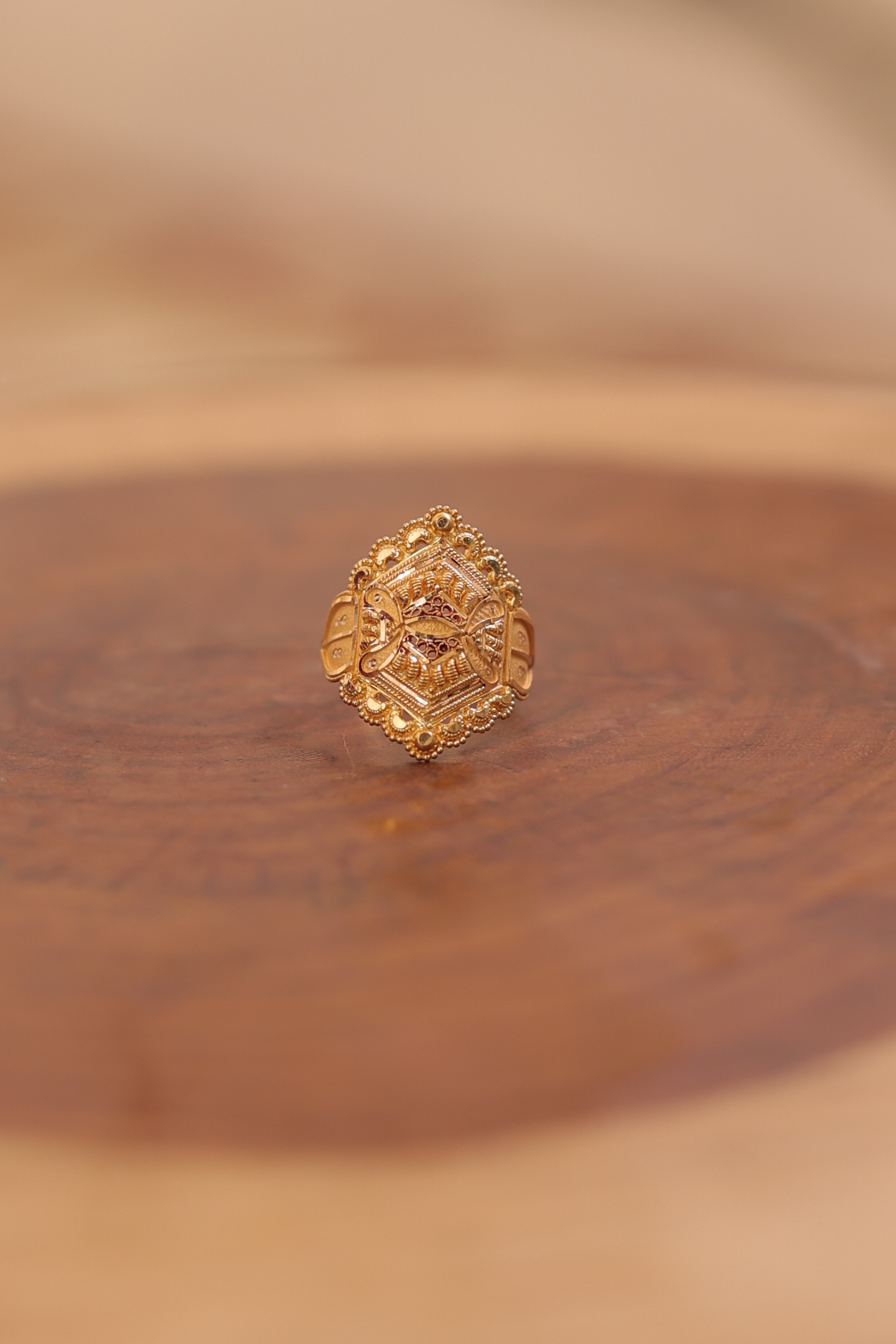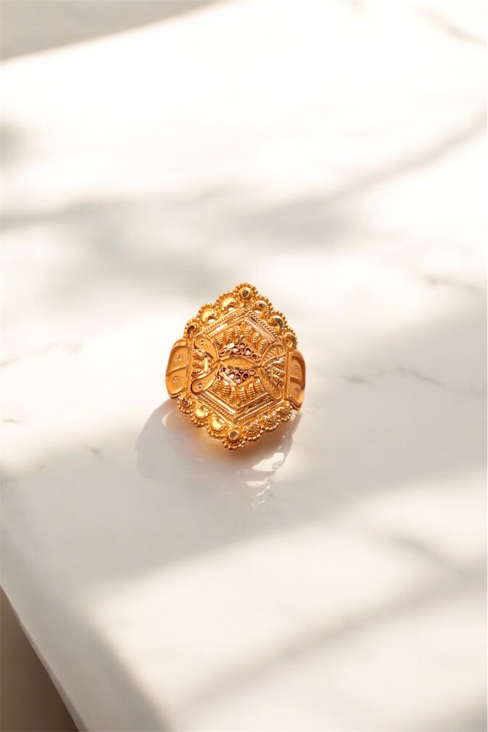 A beautifully detailed 22K gold ladies ring featuring a traditional hexagonal filigree design with intricate textures and floral edges. Perfect for festive, bridal, and daily traditional wear.