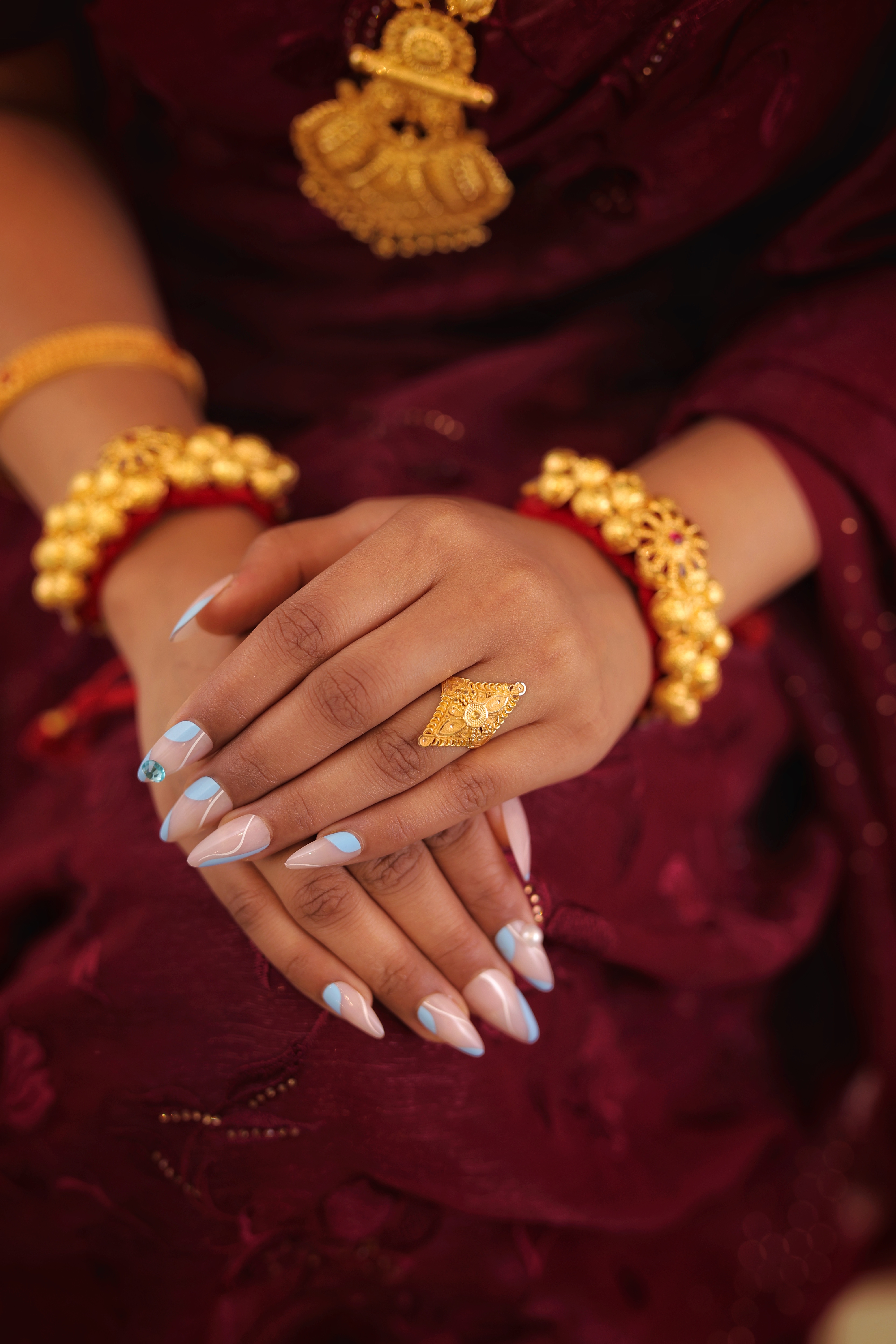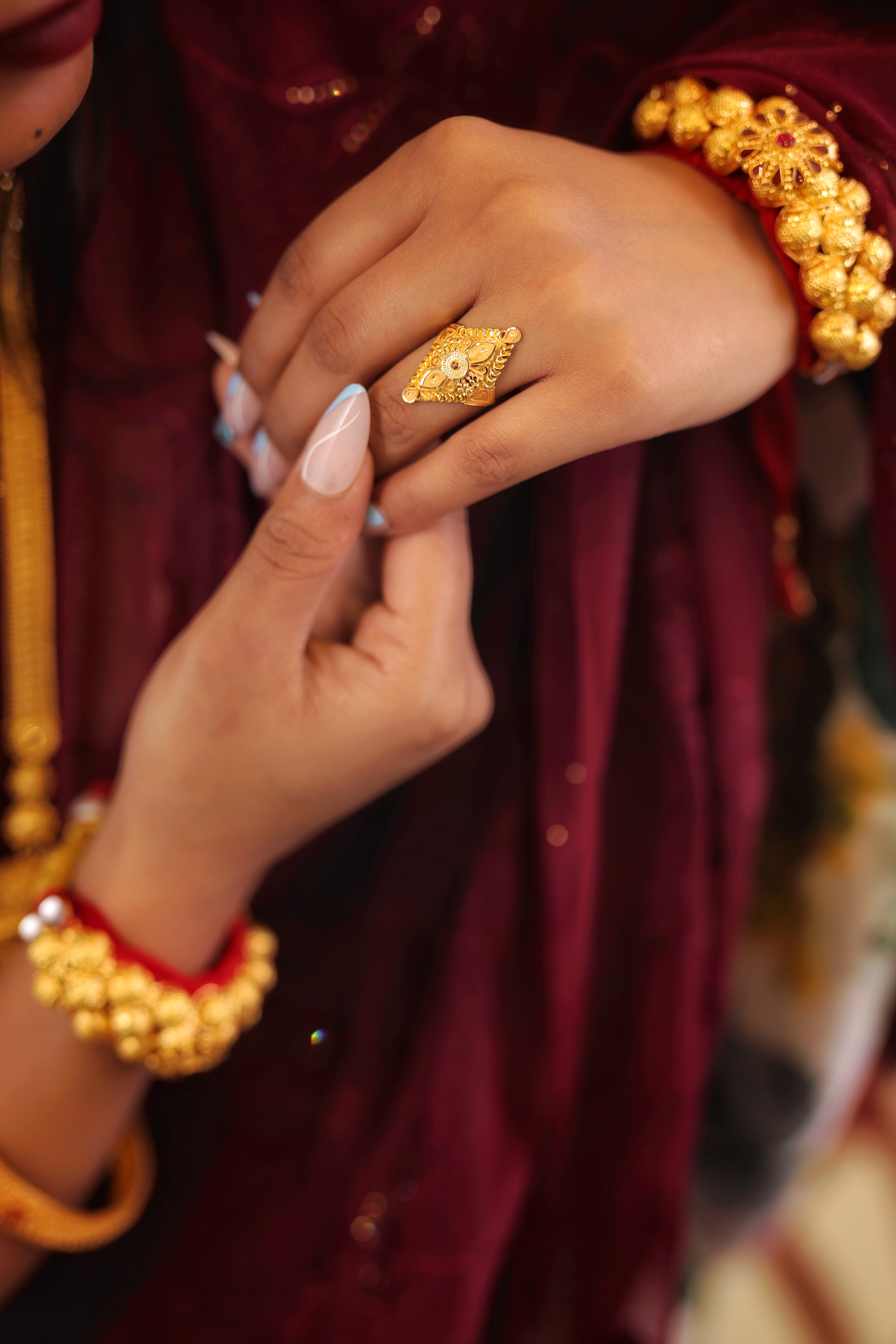 Design Highlights:Shape: Unique, elongated diamond or kite motif. Craftsmanship: Fine filigree work, granulation, and chased patterns create a luxurious texture. Metal Purity: 22 Carat Yellow Gold (Unverified, based on common traditional jewelry). Usage: Ideal for special occasions, cultural events, or as a magnificent cocktail ring.