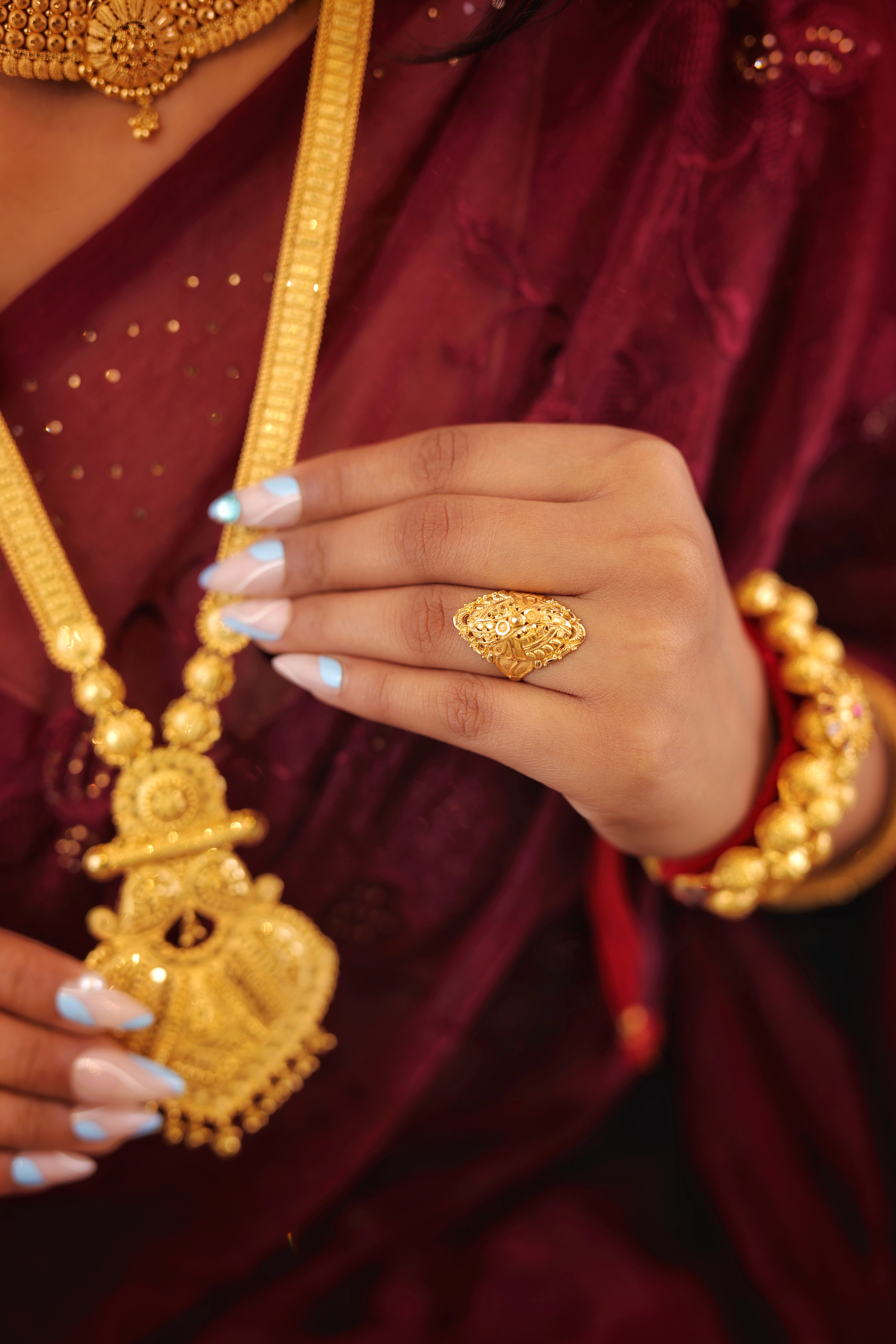 Shape: Large, elaborate oblong or navette face. Craftsmanship: Intricate layering of filigree and fine granulation creates significant texture and volume. Metal Purity: 22 Carat Yellow Gold (Assumed based on previous rings). Usage: Ideal as a grand cocktail ring or for special cultural occasions.