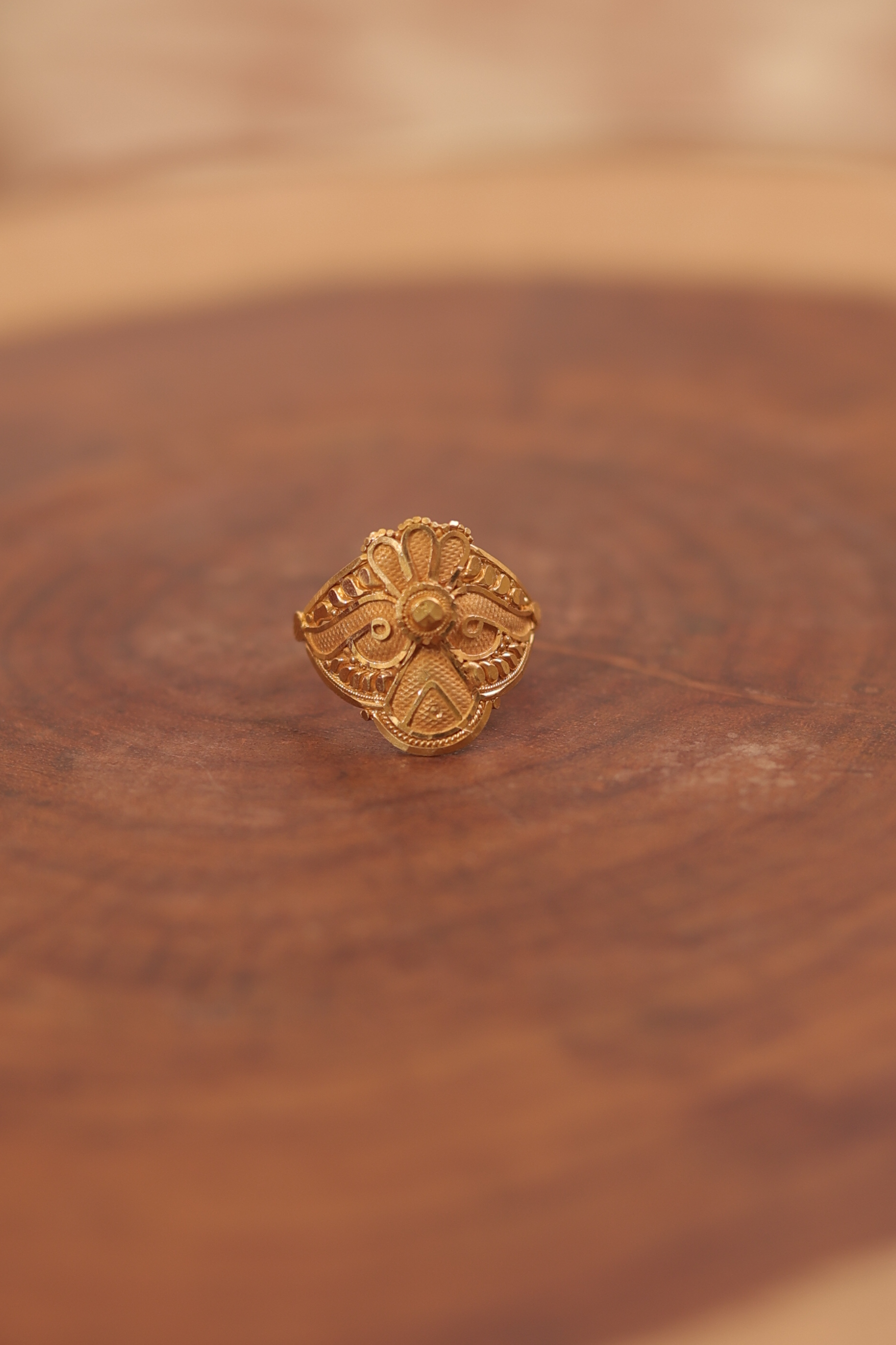 Shape: Unique, elongated diamond or kite motif. Craftsmanship: Fine filigree work, granulation, and chased patterns create a luxurious texture. Metal Purity: 22 Carat Yellow Gold (Assumed 916 purity). Usage: Ideal for special occasions, cultural events, or as a magnificent cocktail ring.