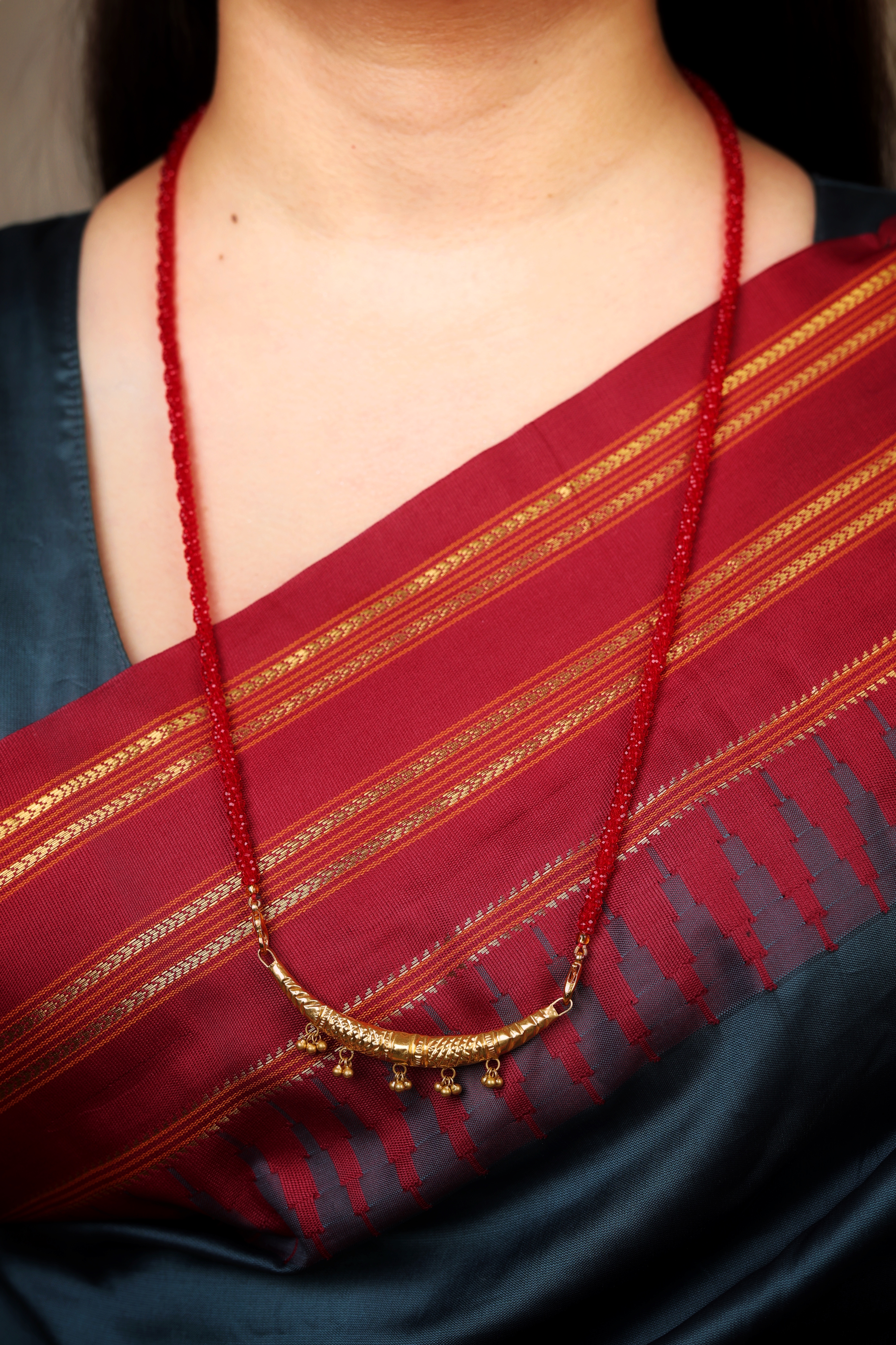 The combination of rich gold detailing and vibrant red beads makes it a perfect symbol of love, tradition, and grace.Made from pure 22K gold for lasting shine and value Intricately carved central gold bar with traditional patterns Beautiful hanging ghungroo-style charms for added elegance Red beaded chain enhances the ethnic appeal Lightweight, comfortable, and ideal for daily wear Perfect for weddings, festivals, and traditional outfits