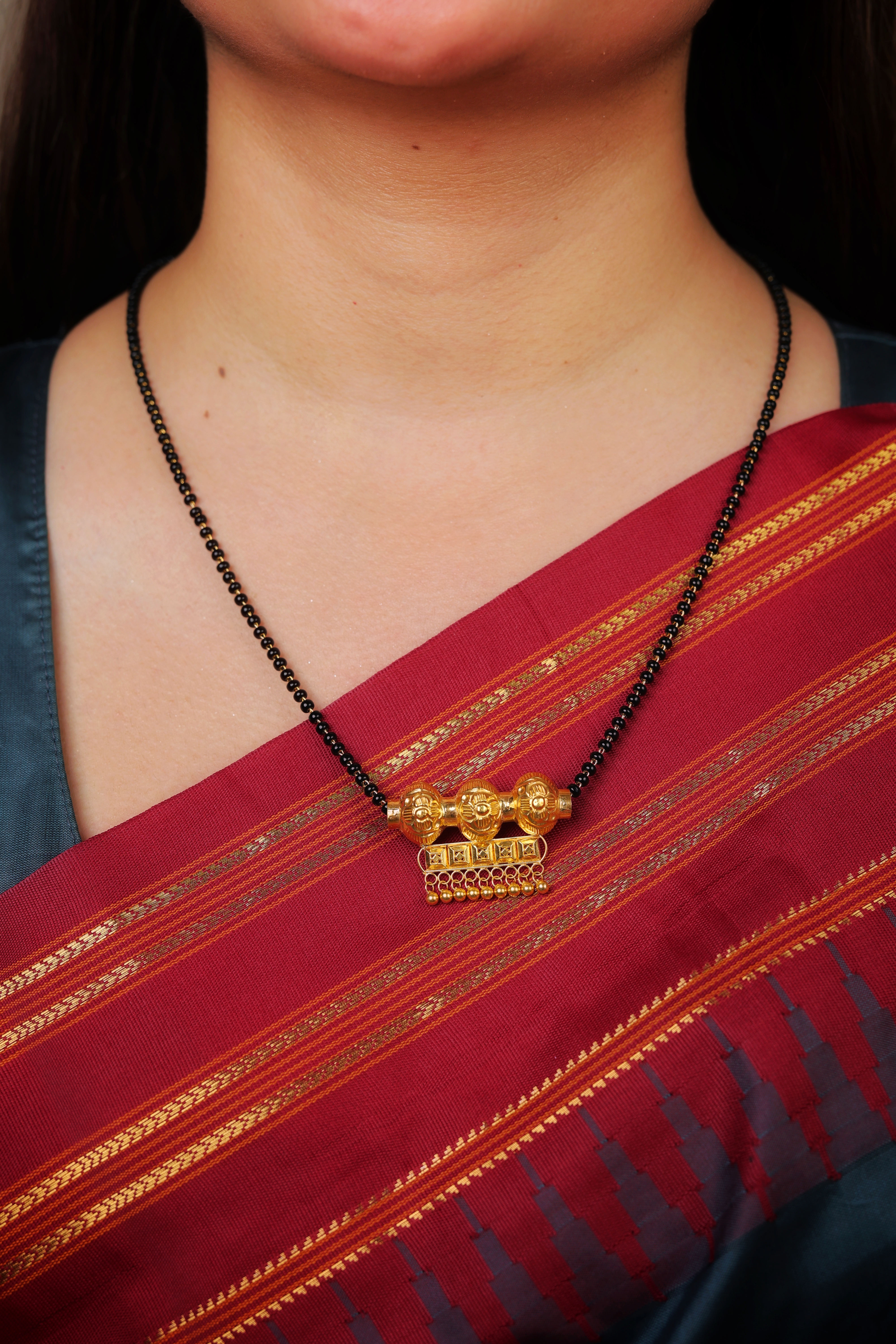 The intricate detailing, polished finish, and graceful hanging drops make it a perfect symbol of love, tradition, and everlasting beauty.Crafted in pure 22K gold with high-quality detailing Unique triple-ball centerpiece for a bold traditional look Decorative hanging gold drops enhancing overall elegance Classic black-bead chain symbolizing purity and protection Lightweight, comfortable, and ideal for daily wear A meaningful gift for brides, weddings, or anniversaries