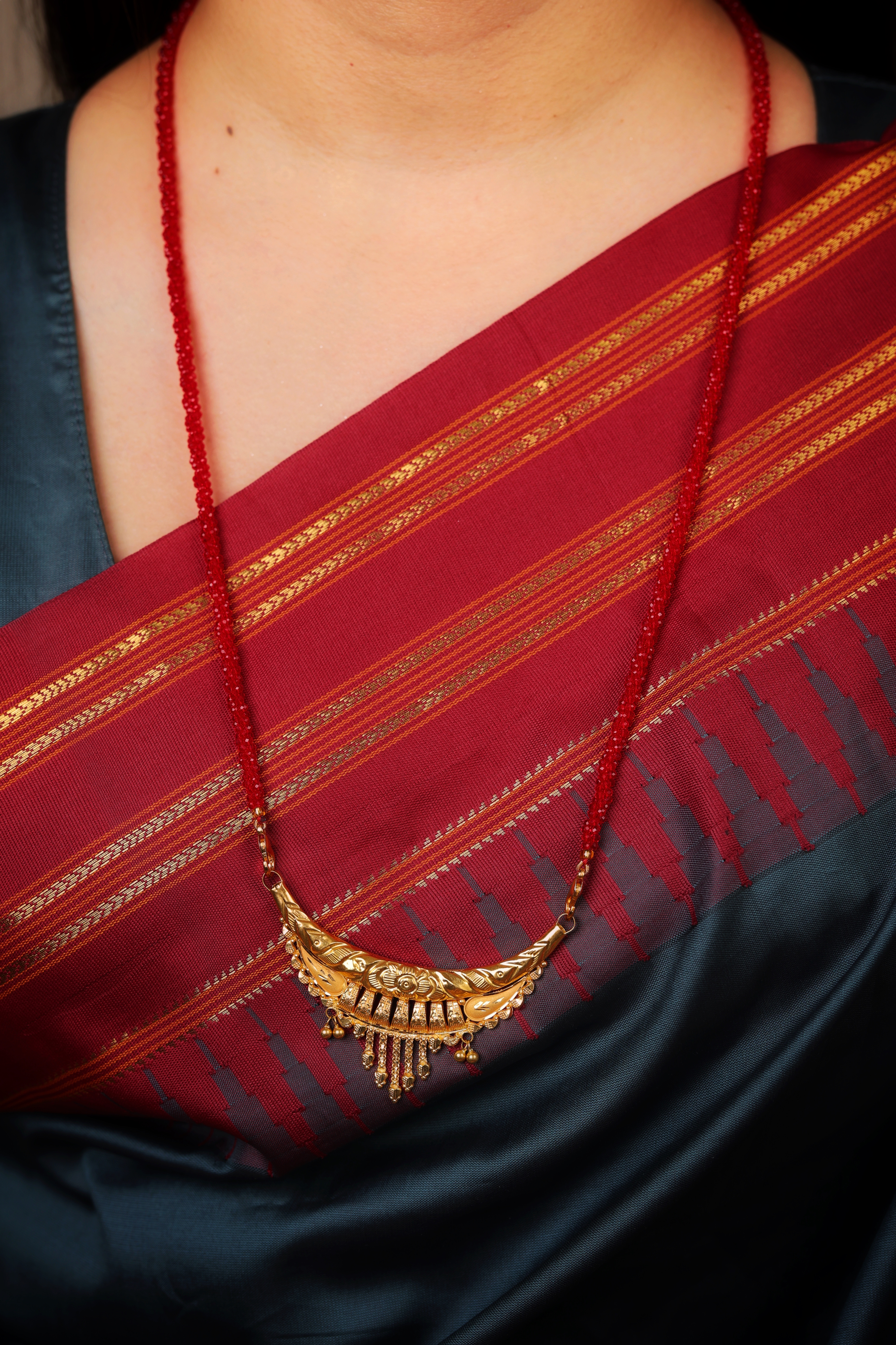 The curved leaf-pattern pendant, enhanced with delicate gold hangings and a rich red-bead chain, makes it a perfect accessory for both festive and bridal wear.Crafted in pure 22K gold with fine hand-carved detailing Elegant leaf-inspired design offering a graceful look Dangling gold drops add a beautiful traditional touch Red-bead mangalsutra chain for a bold and vibrant appearance Lightweight, durable, and comfortable for daily or occasional wear A perfect choice for brides, gifting, and cultural celebrations