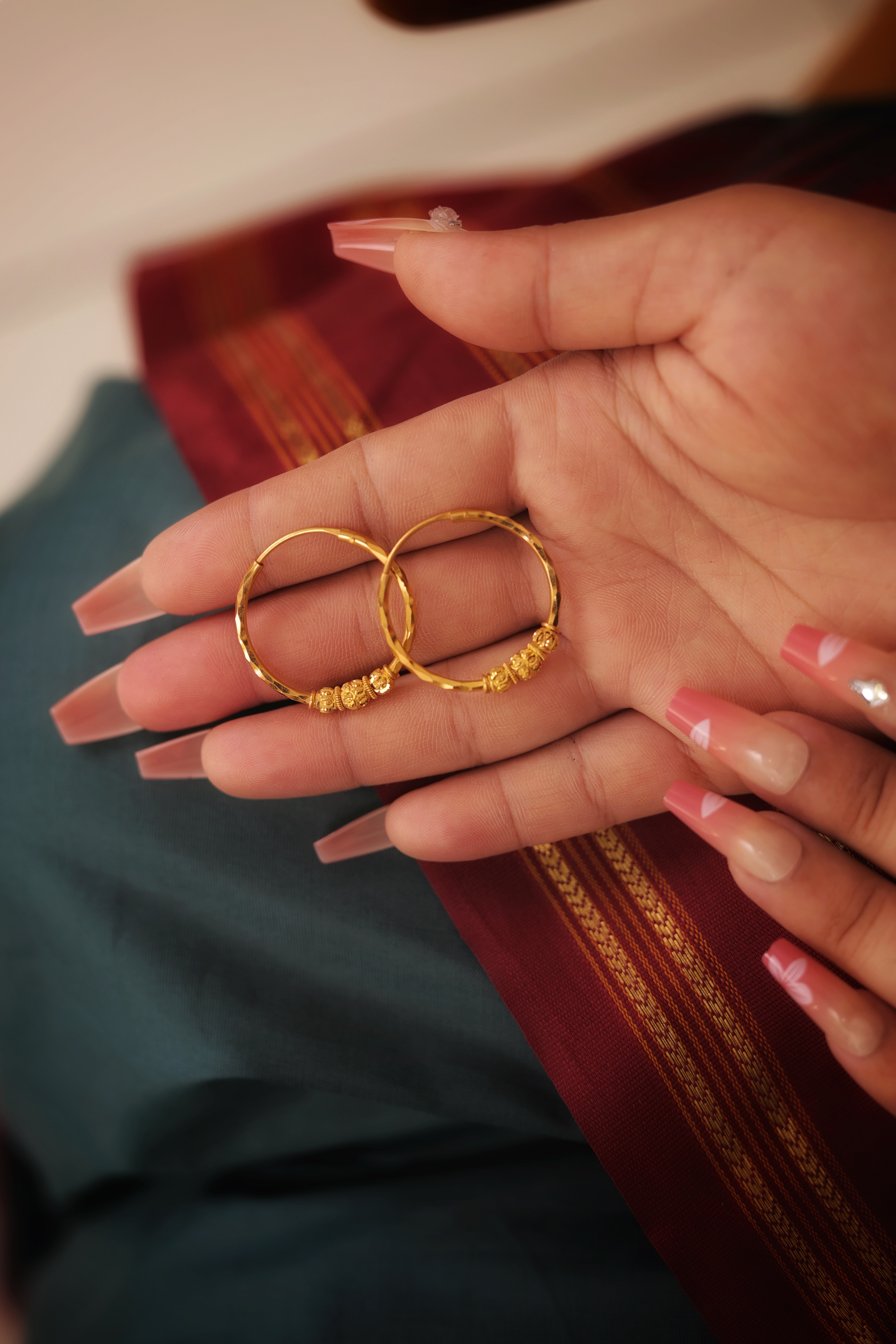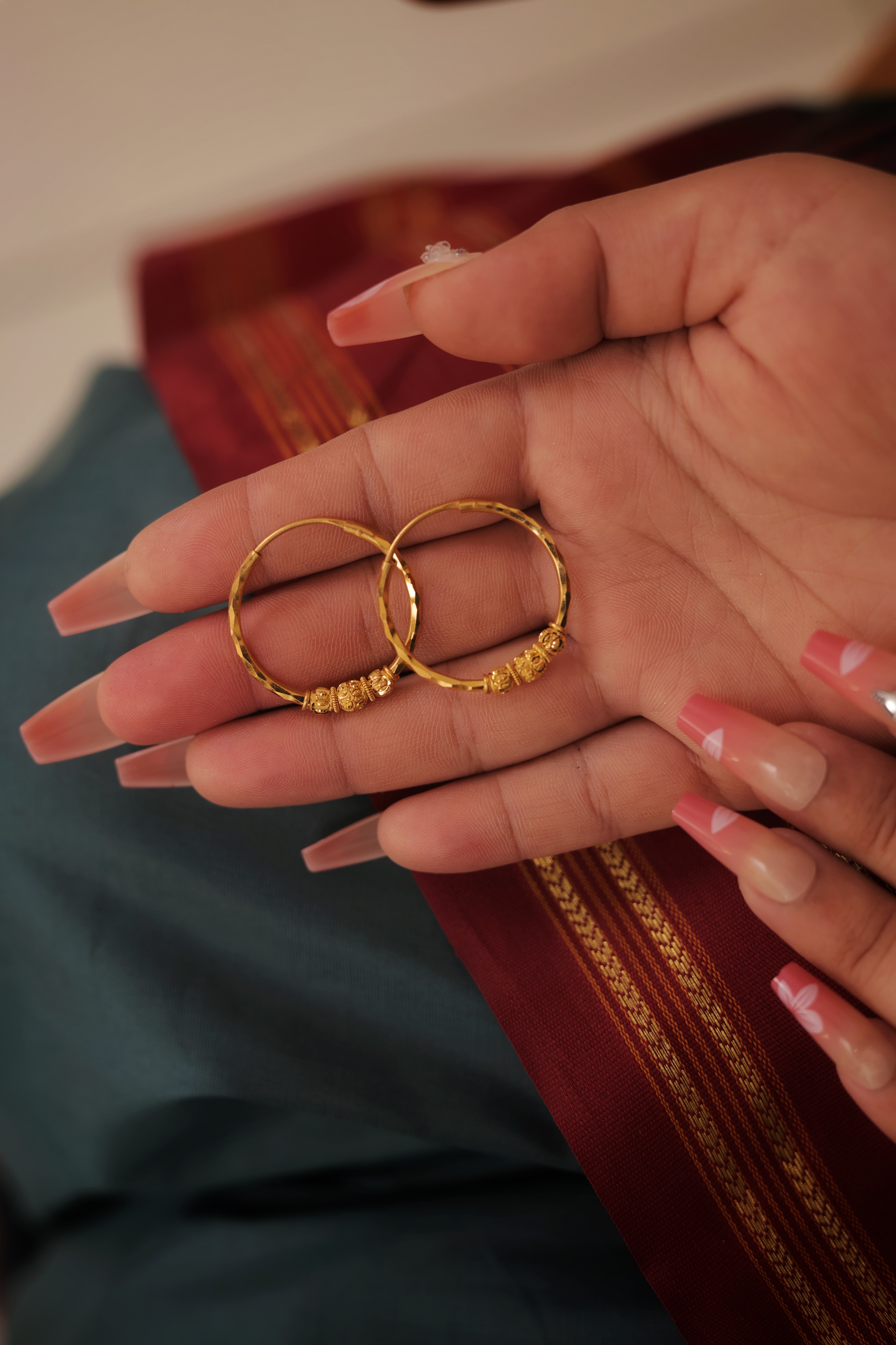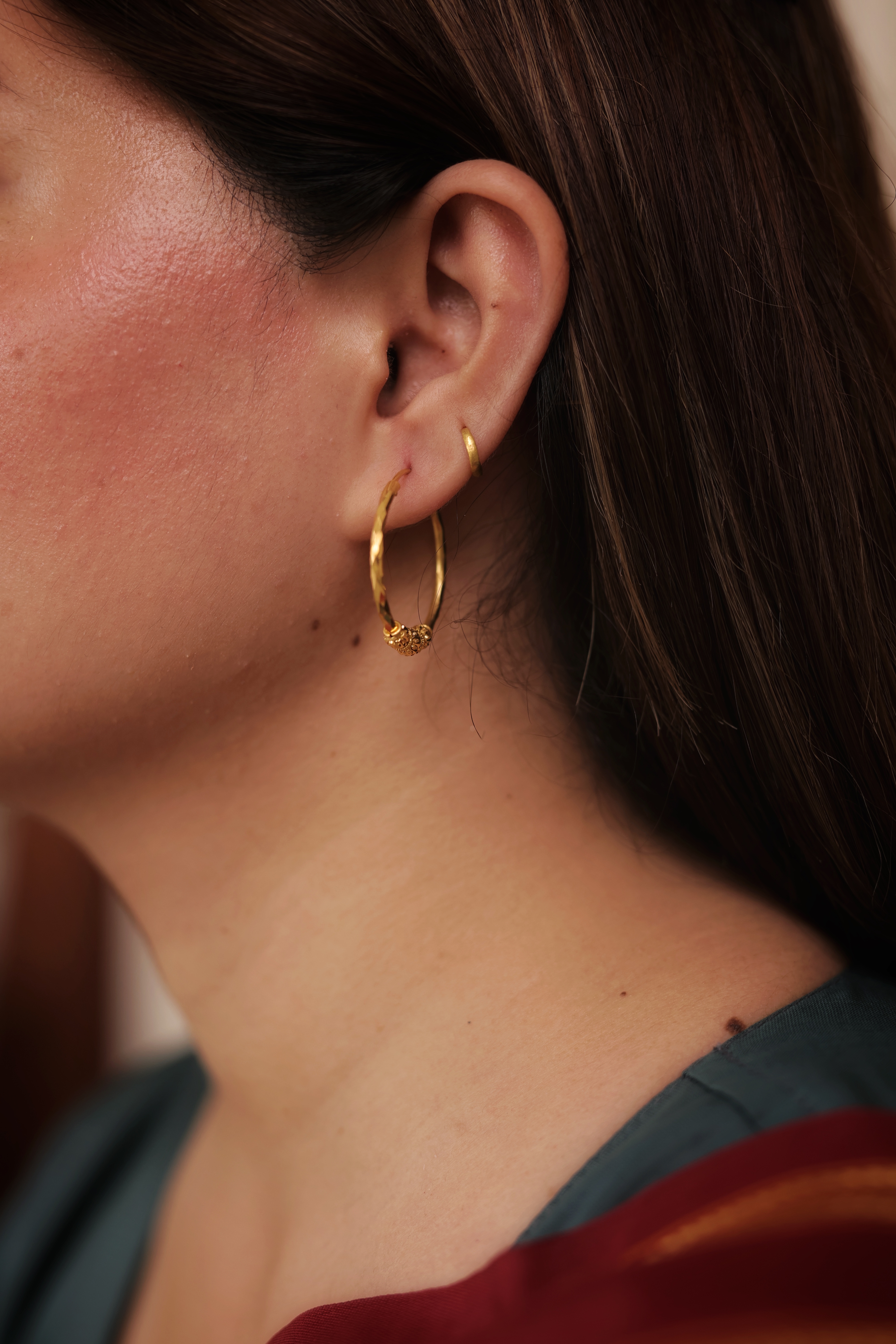 Crafted from a high-quality alloy and layered with 24K Gold plating, these earrings are gentle on the skin and incredibly comfortable for all-day wear. The subtle granular design featured on the lower part of the hoop lends it a unique and traditional touch.