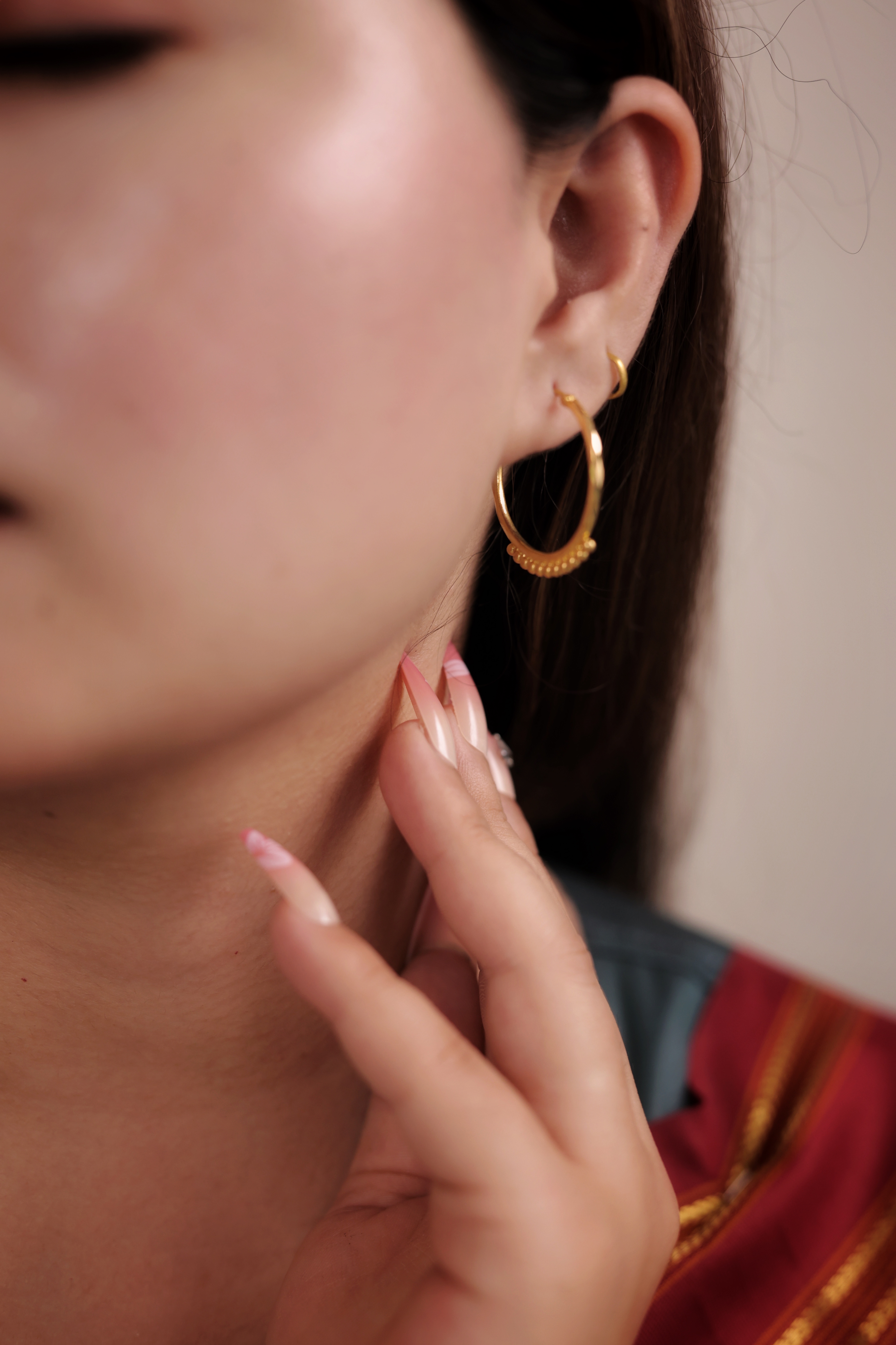 These Bali hoops are a superb choice for those who love detail but prefer a clean, uncluttered look near the earlobe. The top arc of the hoop remains smooth and polished, allowing it to seamlessly blend with the ear, while the lower half features a beautifully crafted, continuous beaded texture.