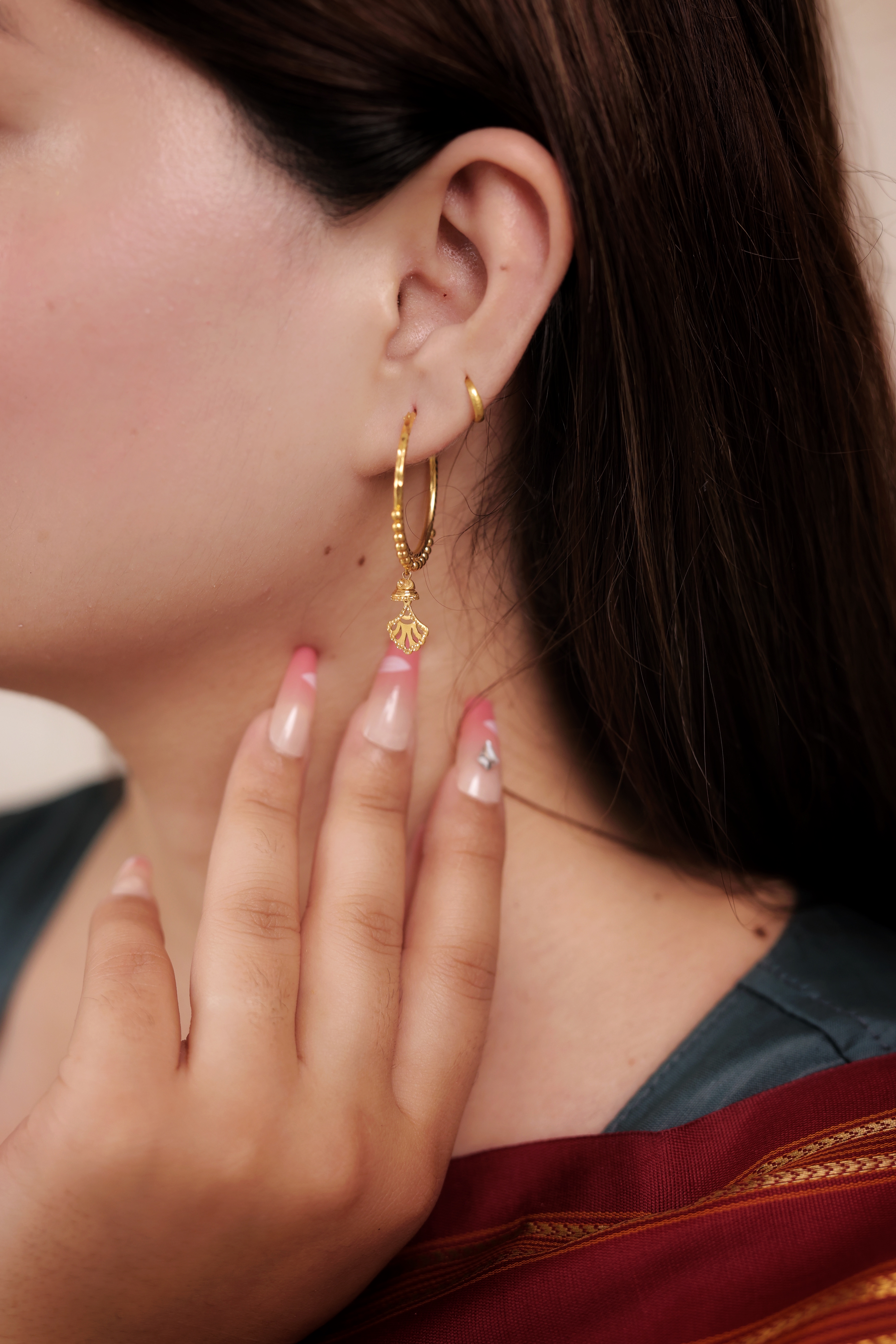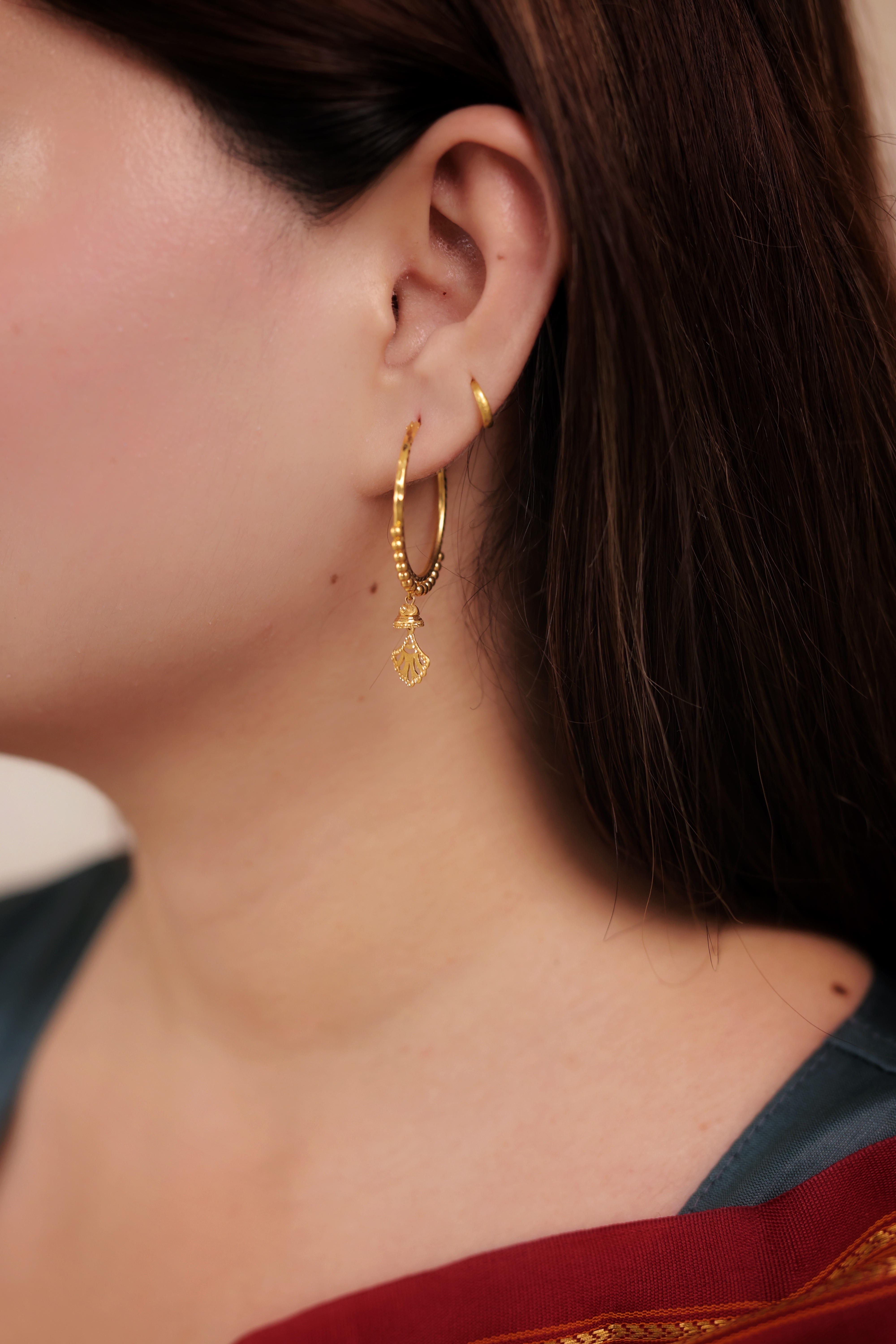 A classic hoop elevated with tradition. These Gold-Plated Bali Hoops feature a subtle, smooth hoop design with a beautifully detailed round or petal-shaped charm hanging at the base. It offers graceful movement and a gentle shine, perfect for enhancing et