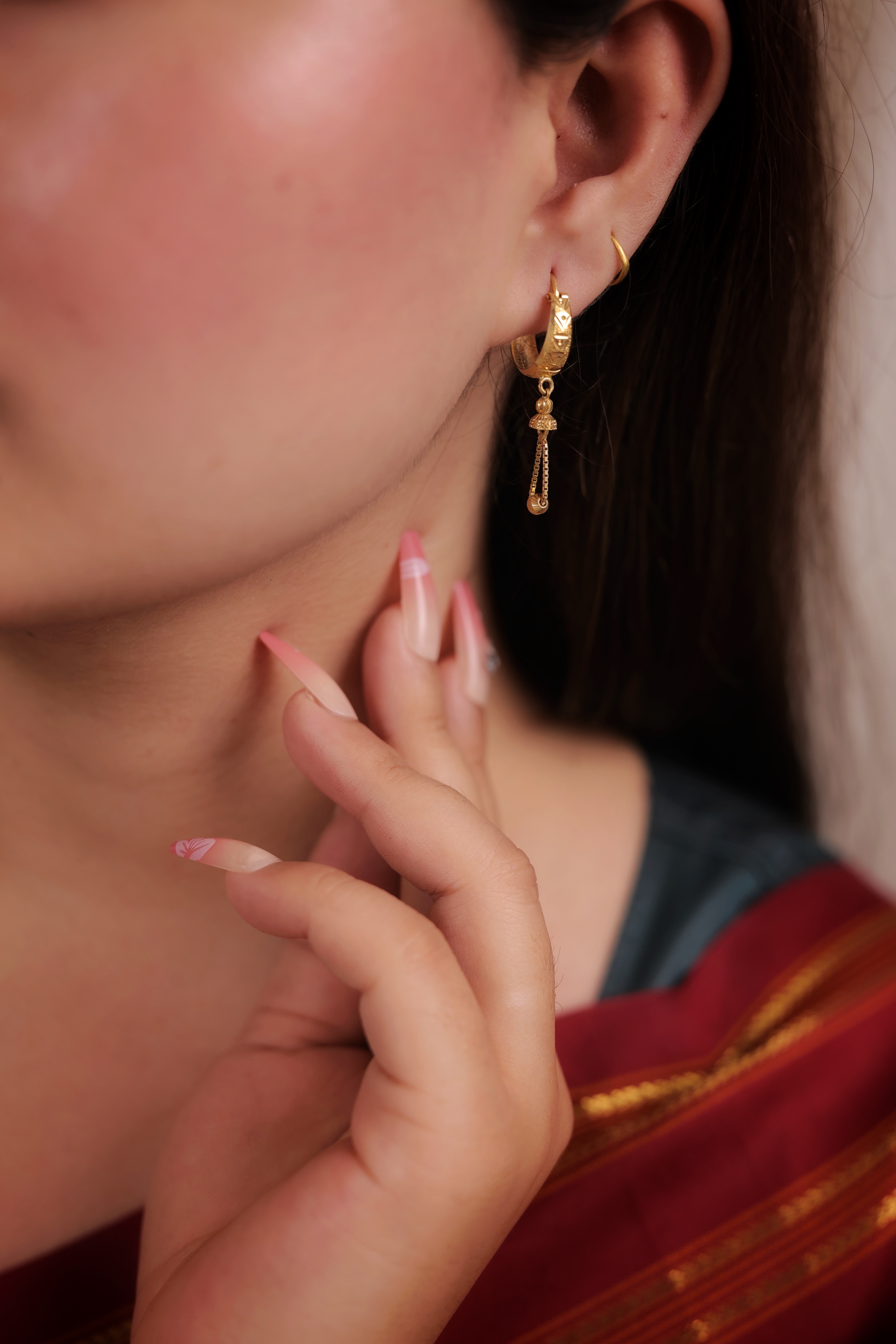 Suspended from the bottom edge is a simple, traditional gold drop charm, which provides a lovely contrast to the modern geometric shape. This blend of contemporary form and classic detailing makes it highly versatile, perfect for those who want a piece that is both stylish and rooted in ethnic design.