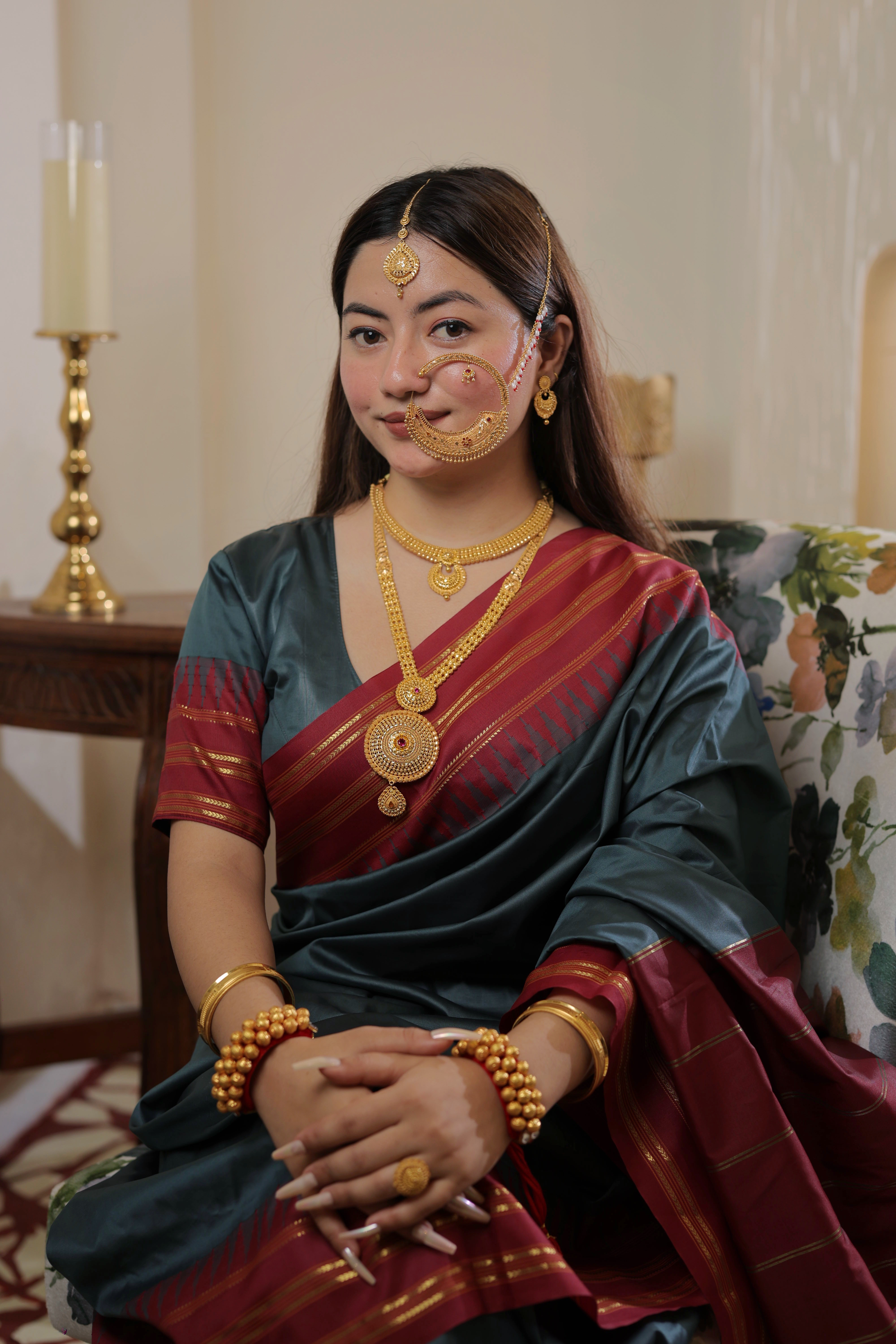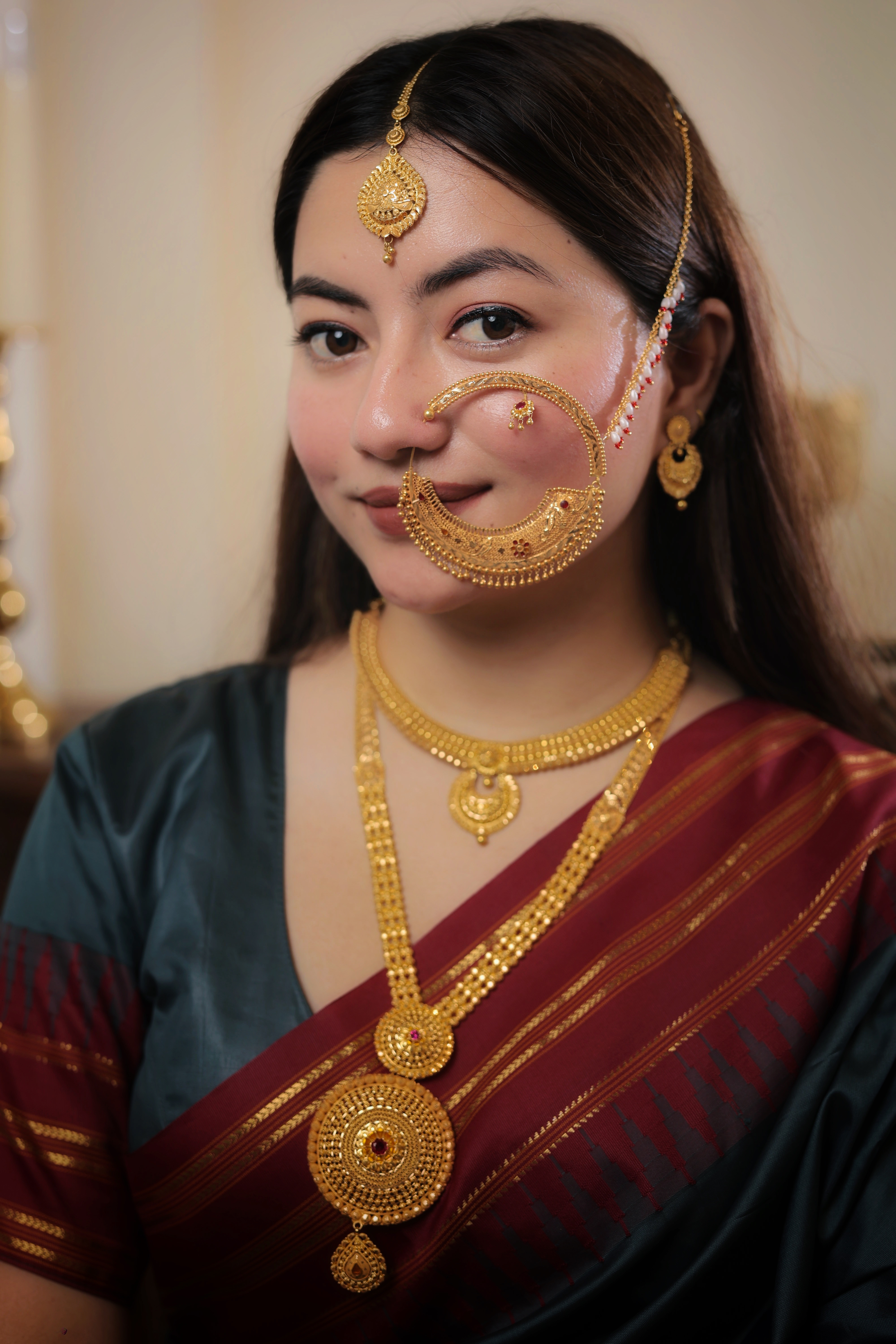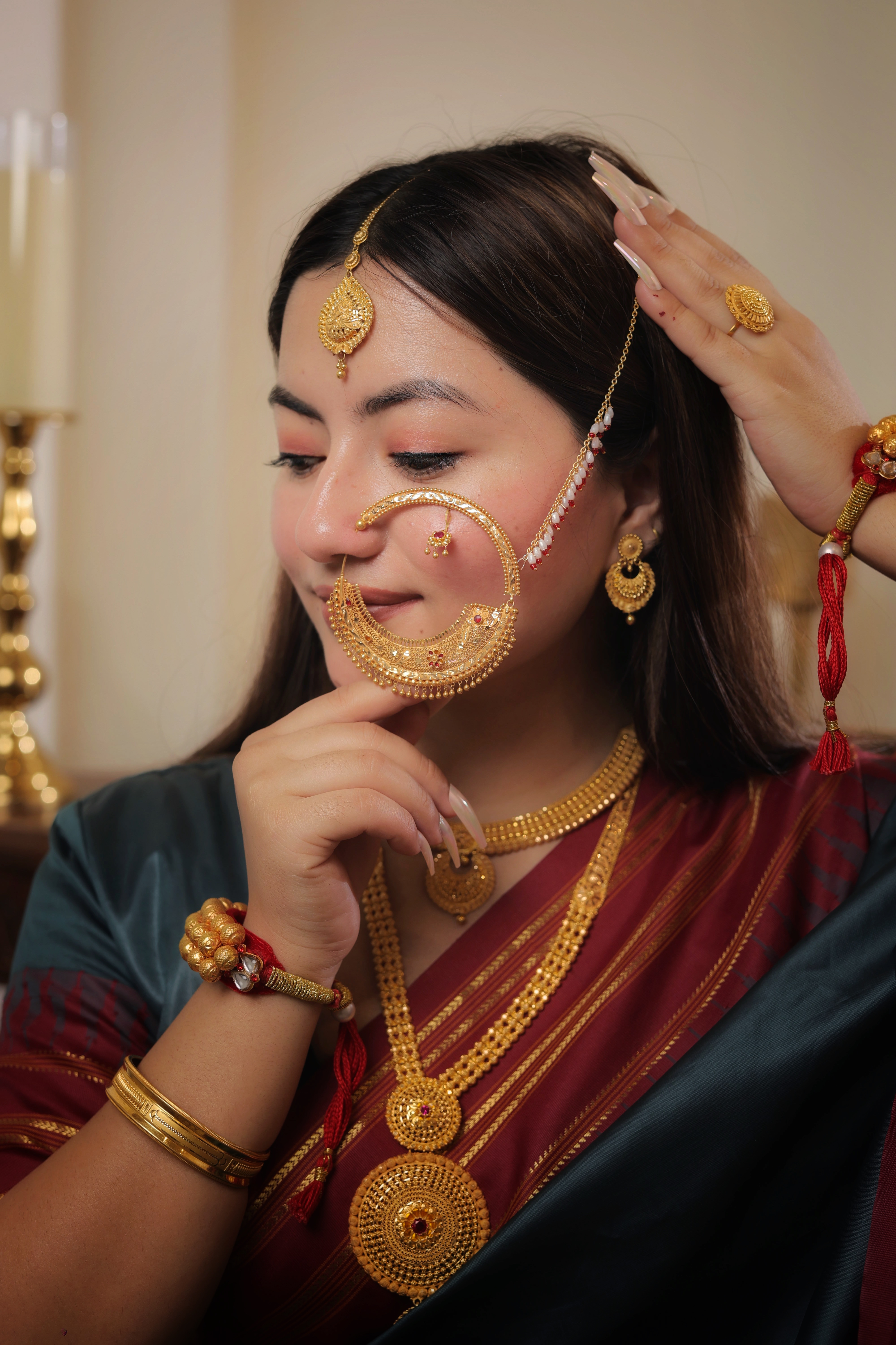 The traditional Mukhala (ear chain) beautifully complements the Nath, featuring a secure link of Gold with white pearls and red beads, providing necessary balance and stability.