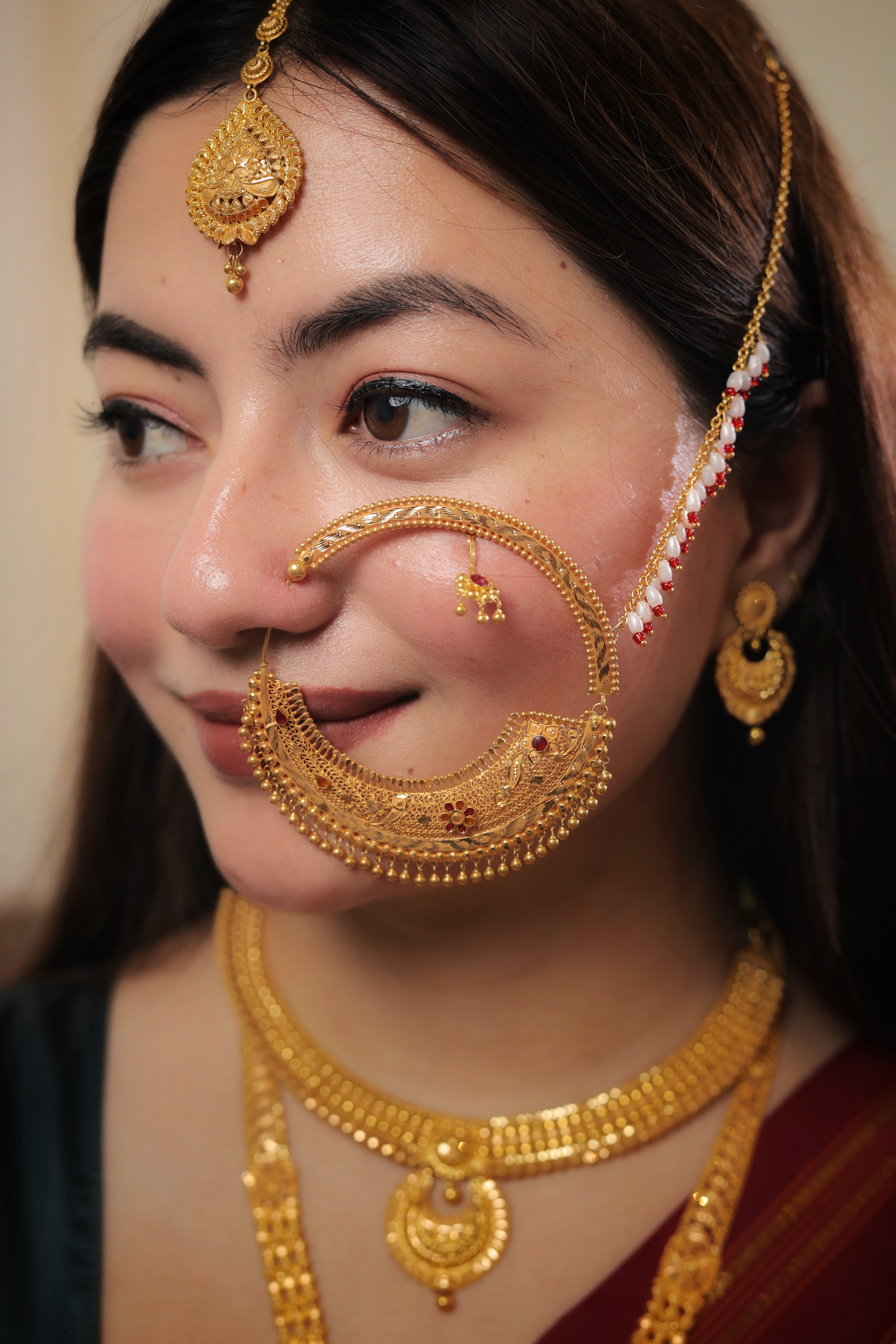 This Nath is handcrafted from Genuine Solid Gold, ensuring it is a piece of enduring value and cultural significance. The rich Gold tone is perfect for traditional wear and formal ensembles.