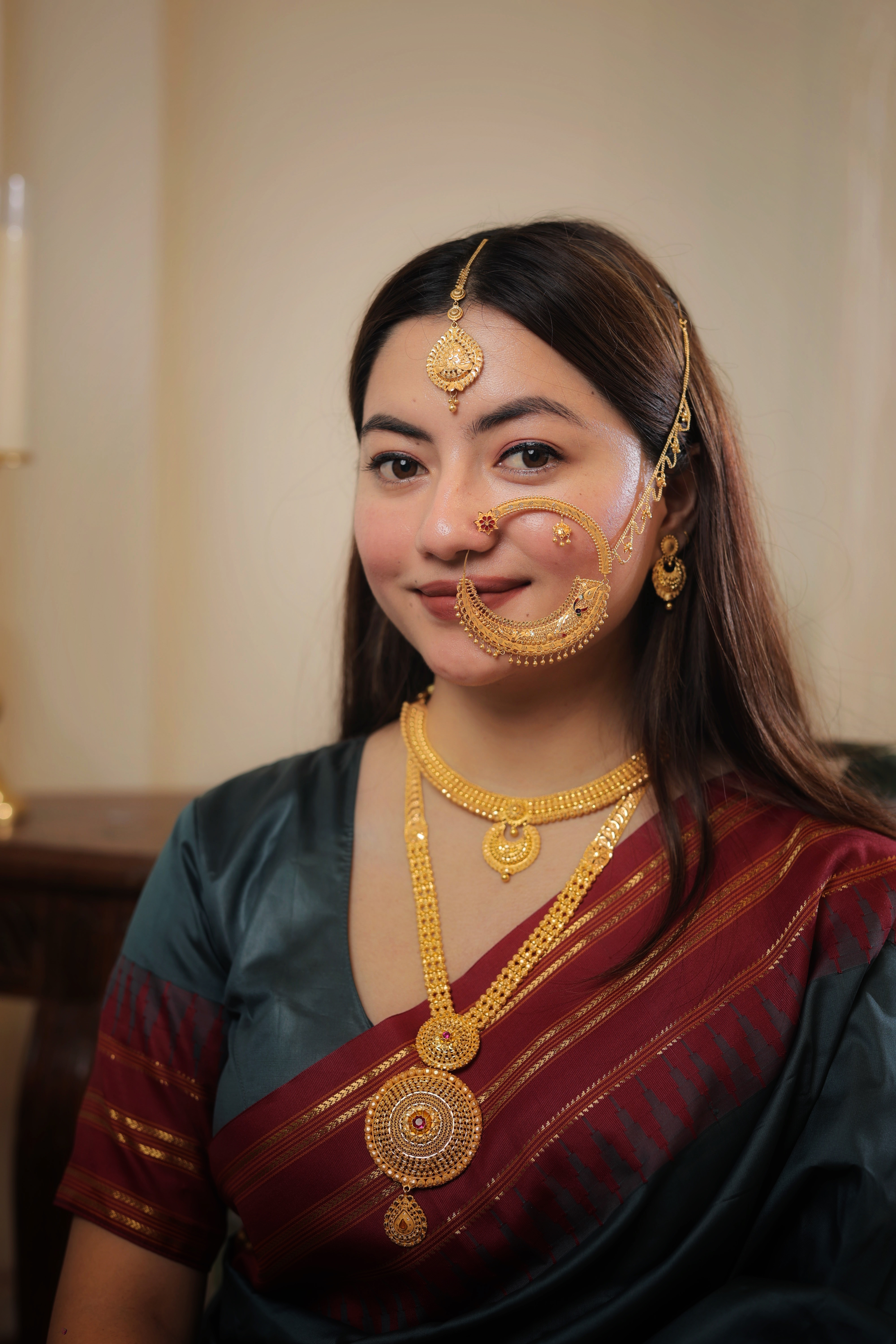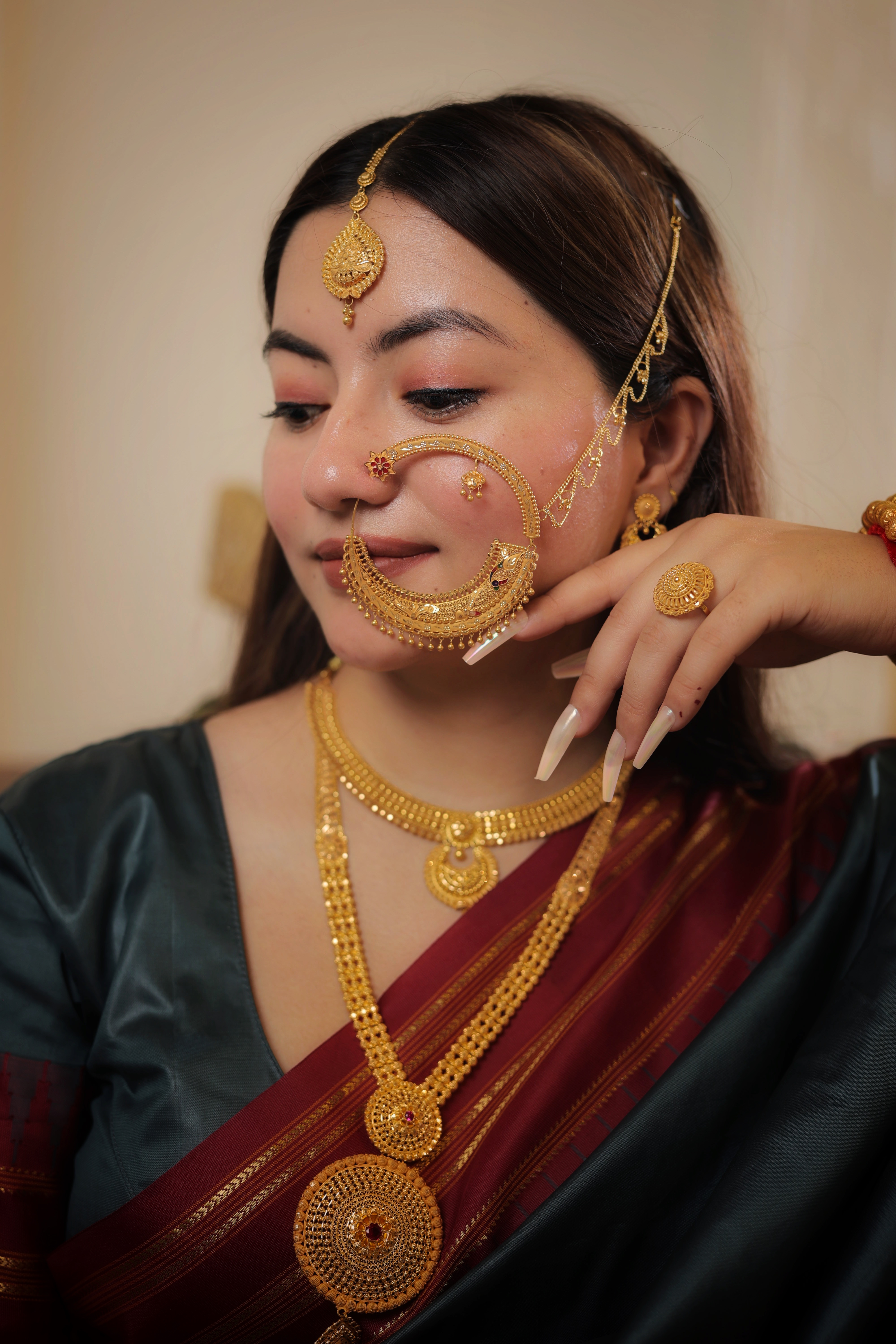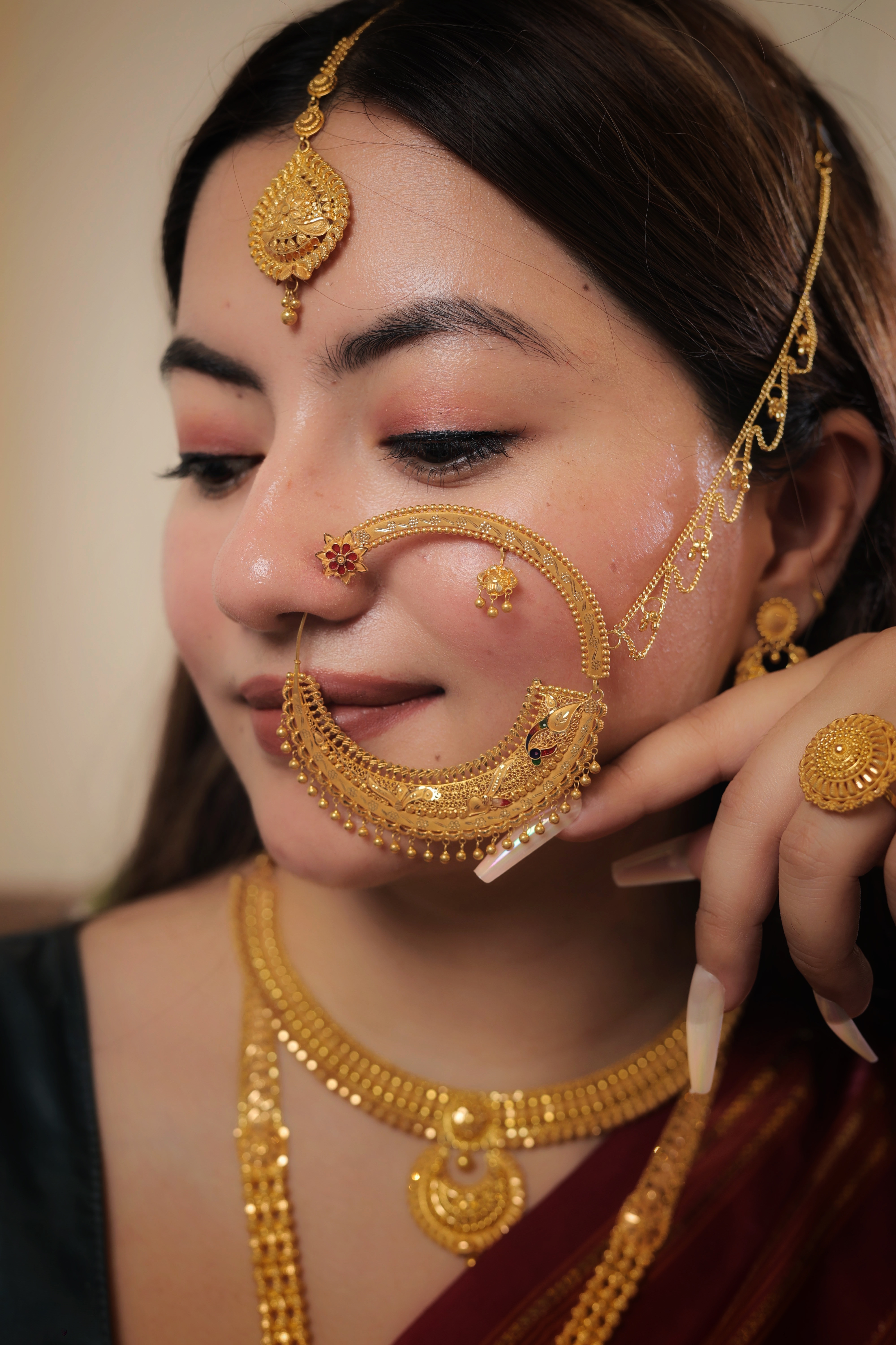 This Nath is handcrafted from Genuine Solid Gold, guaranteeing its status as a piece of supreme value and cultural significance. The rich Gold tone is perfect for complementing the most elaborate traditional attire.