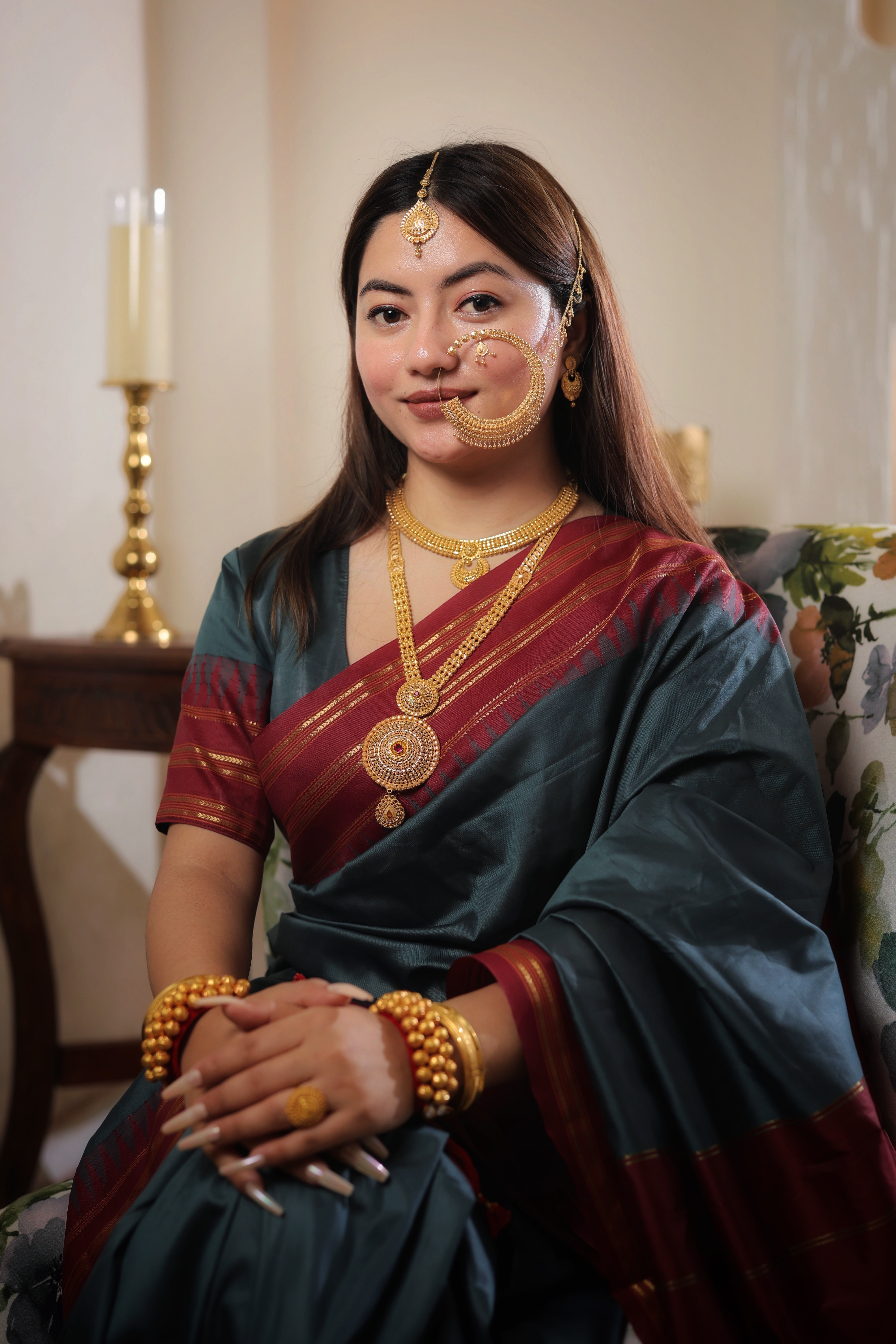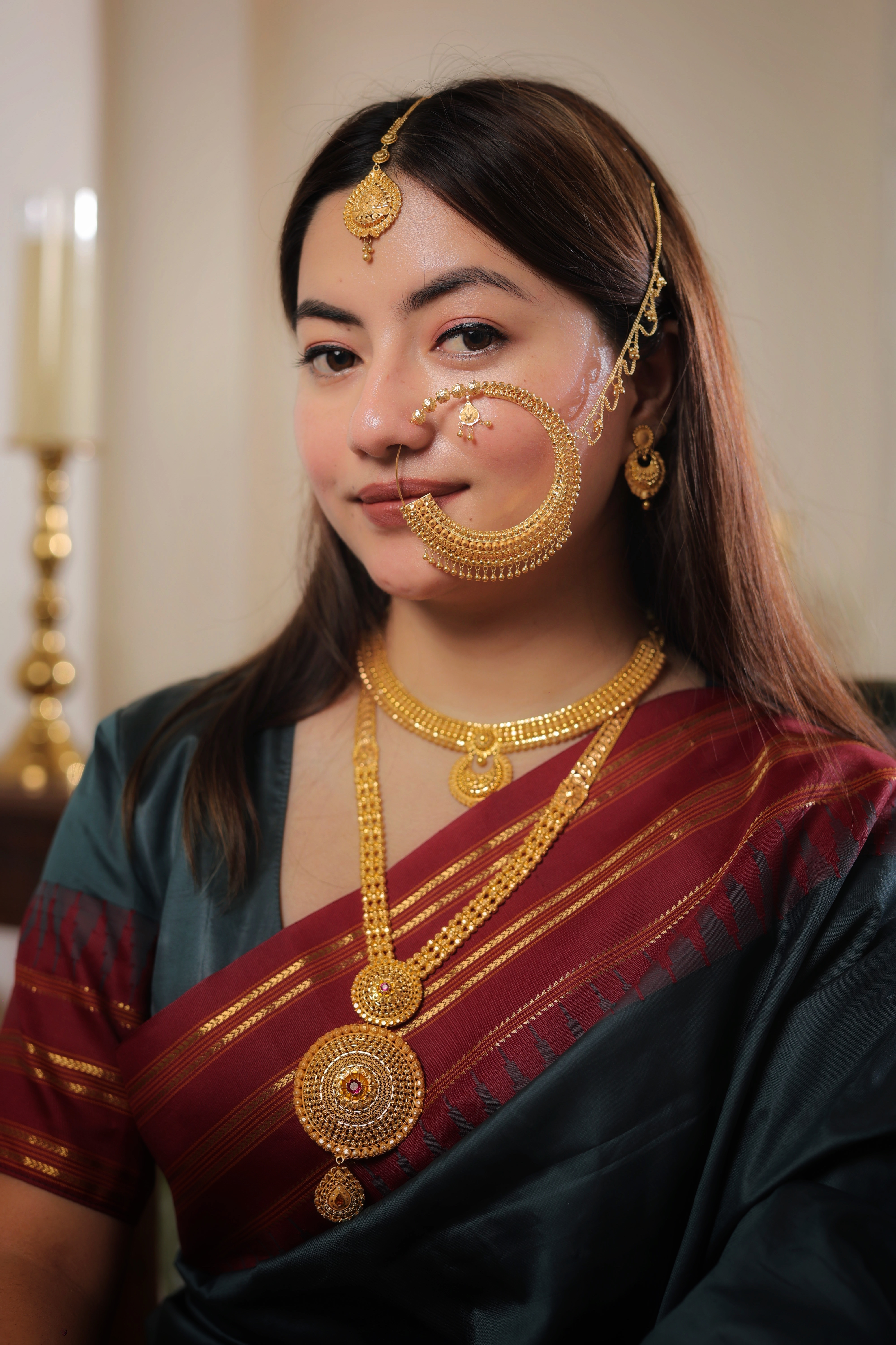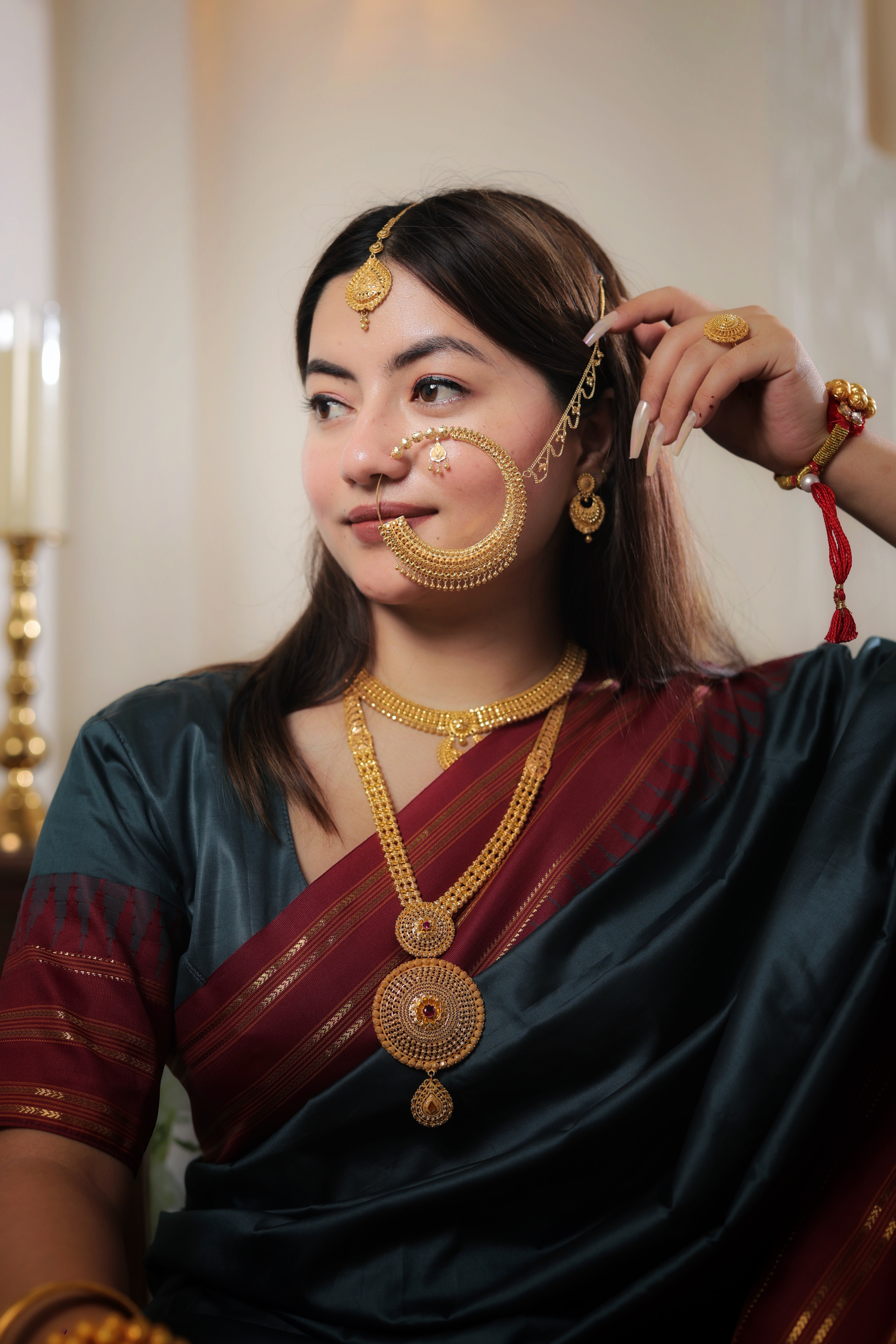 This Nath is meticulously handcrafted from Genuine Solid Gold, guaranteeing a piece of supreme and enduring traditional value. The rich, pure Gold tone is ideal for anchoring any luxurious bridal or festive outfit, making it a spectacular heirloom piece.