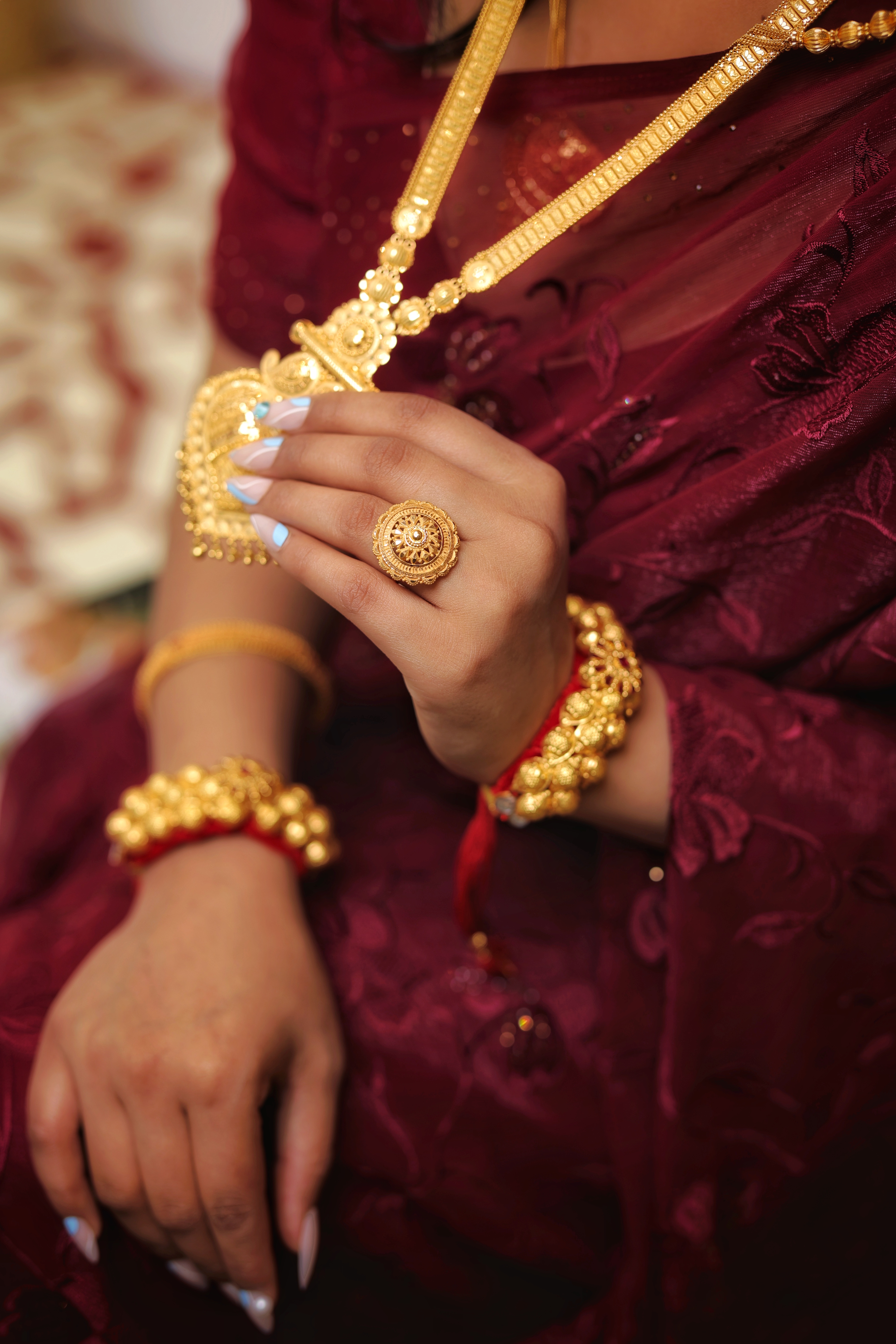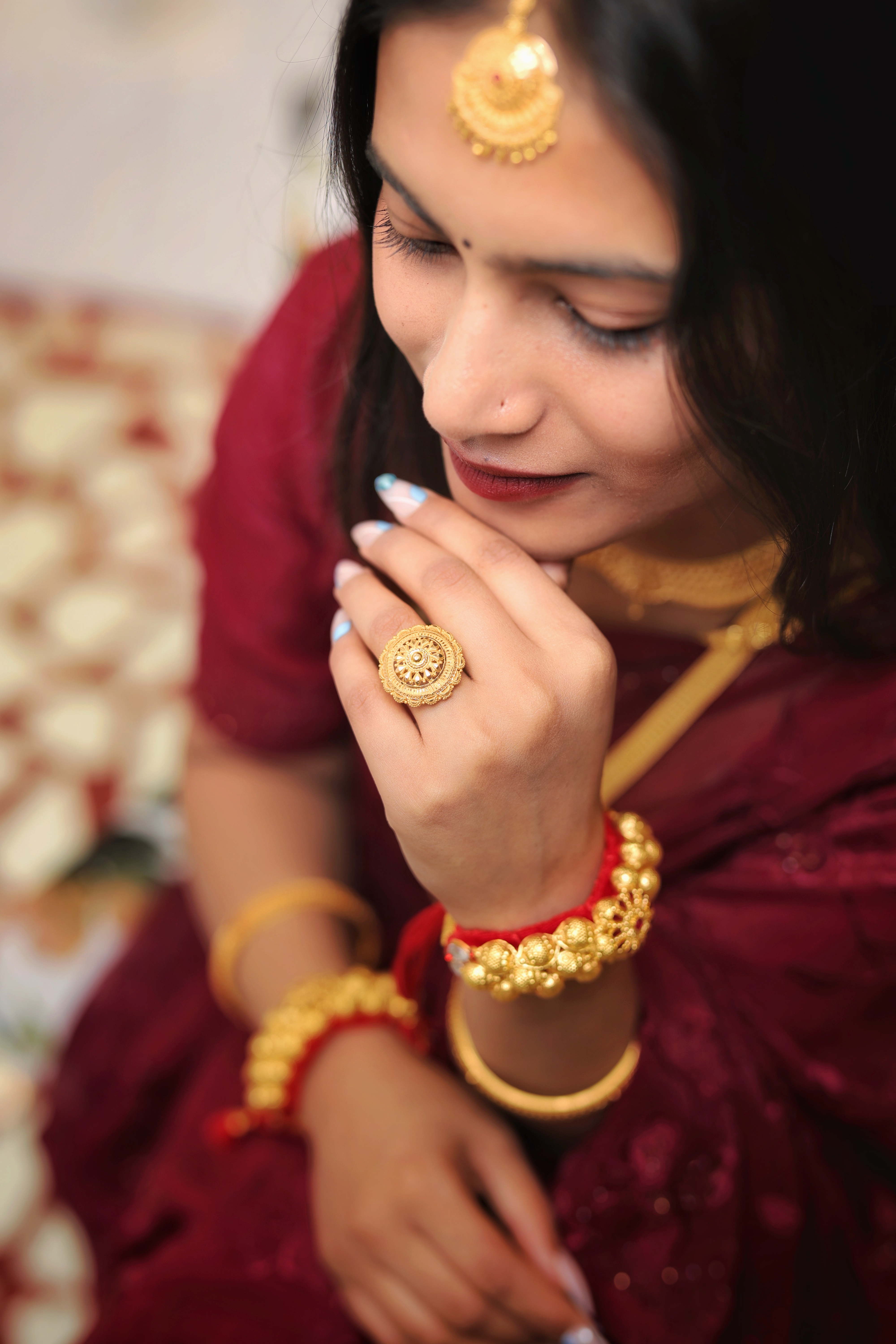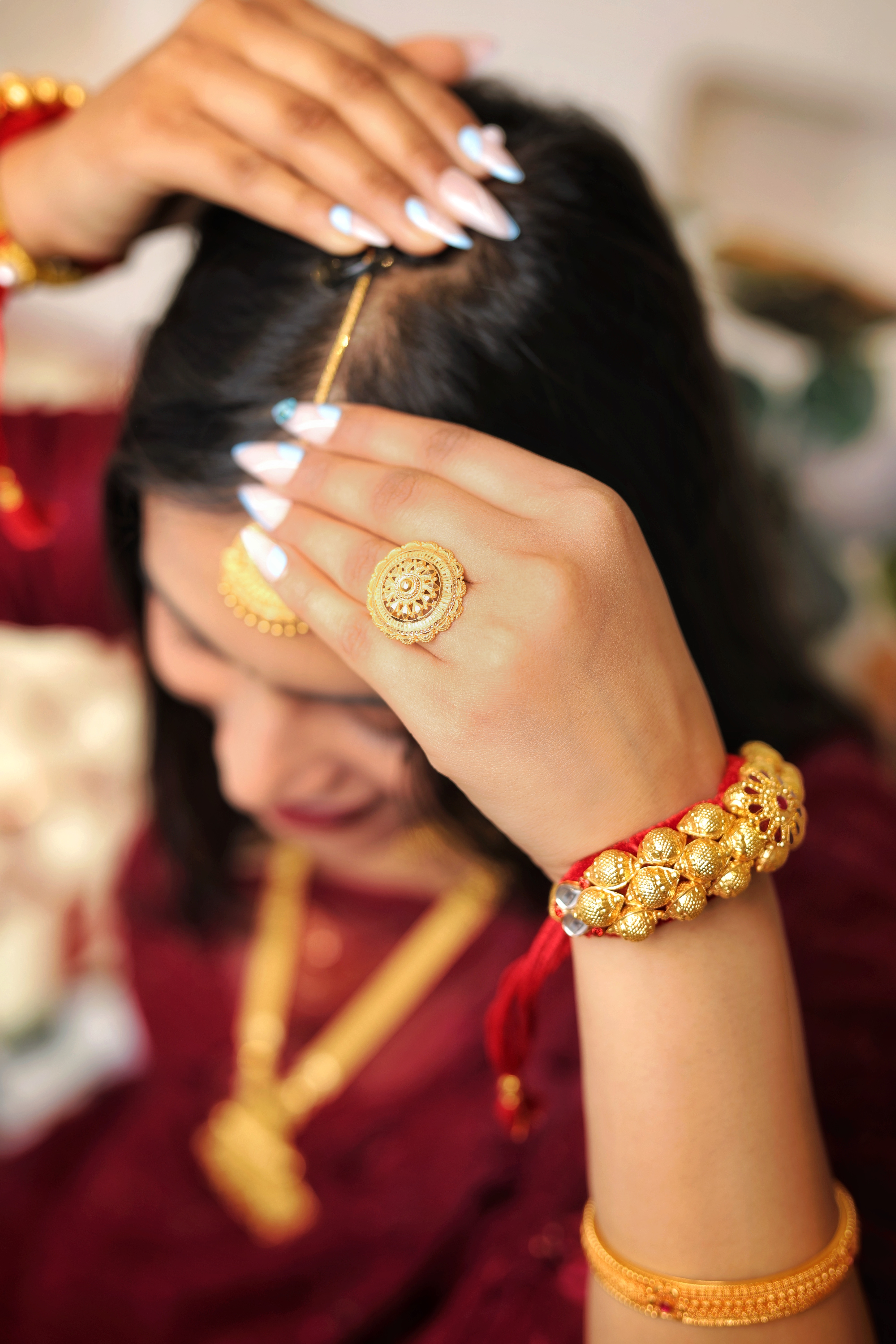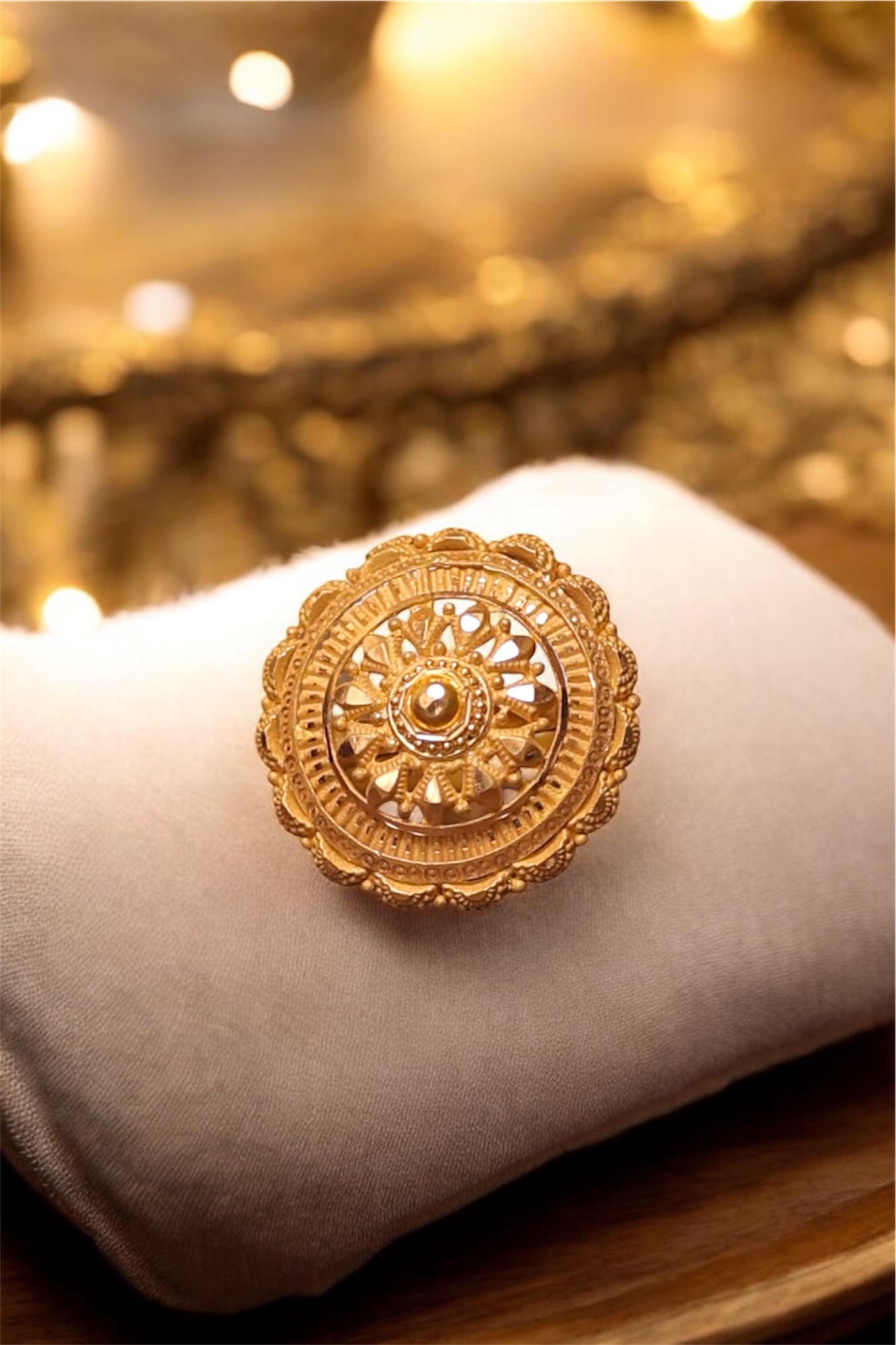 Key Features:Design: Large, circular cocktail ring with intricate sunburst or wheel-like openwork. Embellishments: Features a detailed scalloped or beaded outer border. Craftsmanship: Detailed traditional filigree metalwork for a bold, dimensional look. Metal Purity: Assumed 22 Carat Yellow Gold (916 purity). Usage: Ideal for ceremonies, festivals, or as a signature traditional accessory.