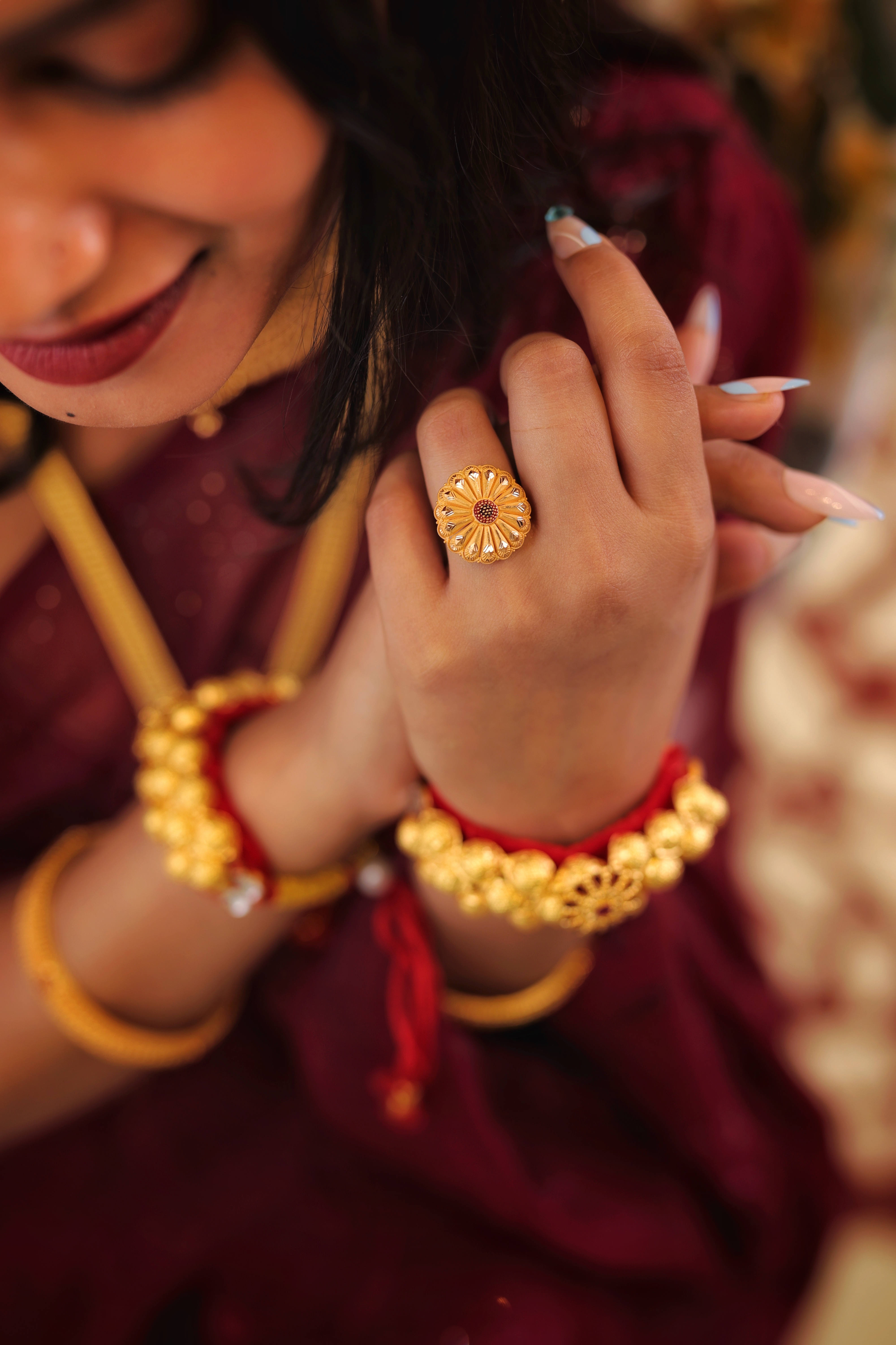 Key Features:Design: Large, circular cocktail ring with a pronounced layered petal/sunburst motif. Accents: Features a prominent central cluster of red (ruby-colored) detailing. Craftsmanship: Detailed traditional metalwork for a bold, dimensional look. Metal Purity: Assumed 22 Carat Yellow Gold (916 purity). Usage: Ideal for ceremonies, festivals, or as a signature traditional accessory.