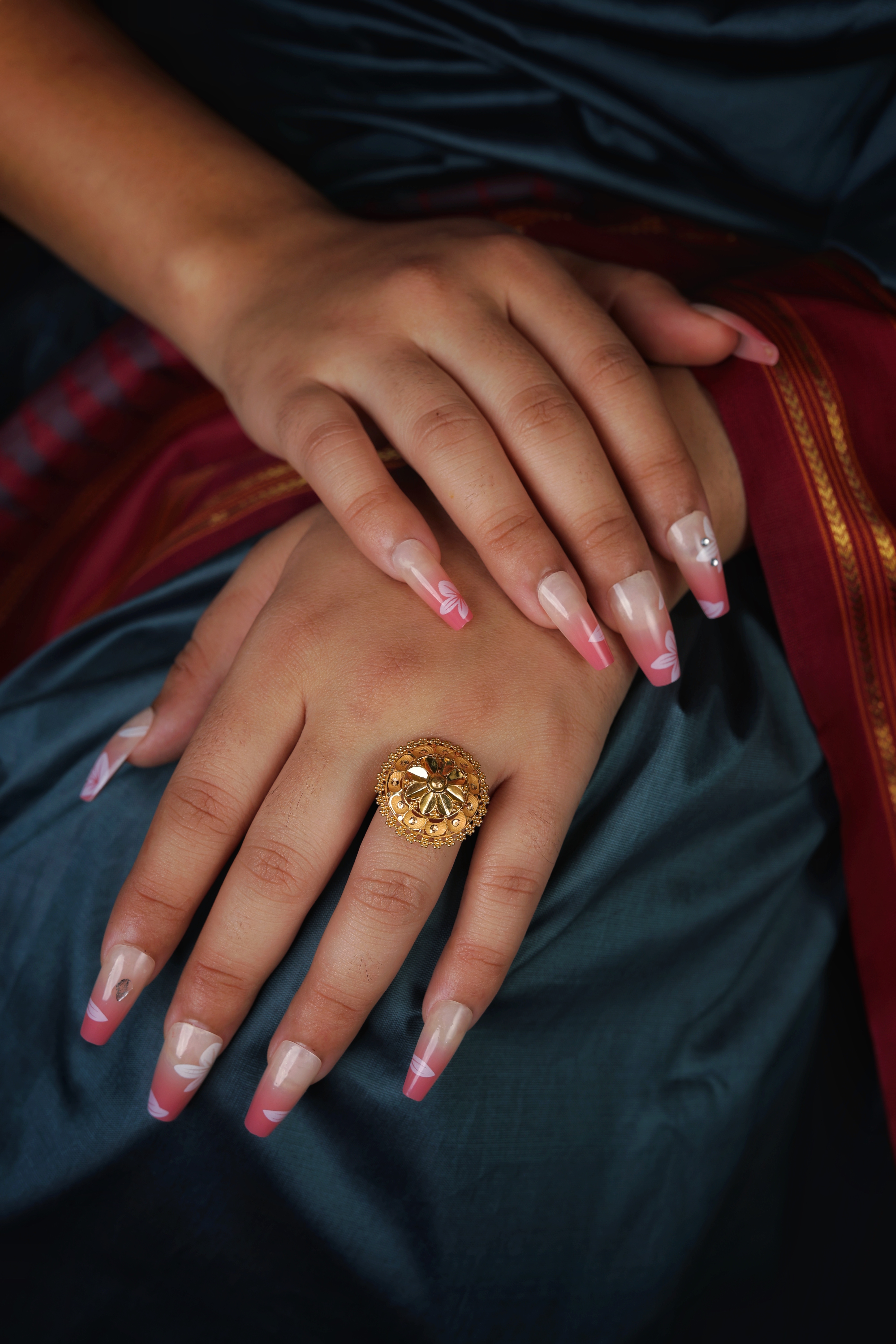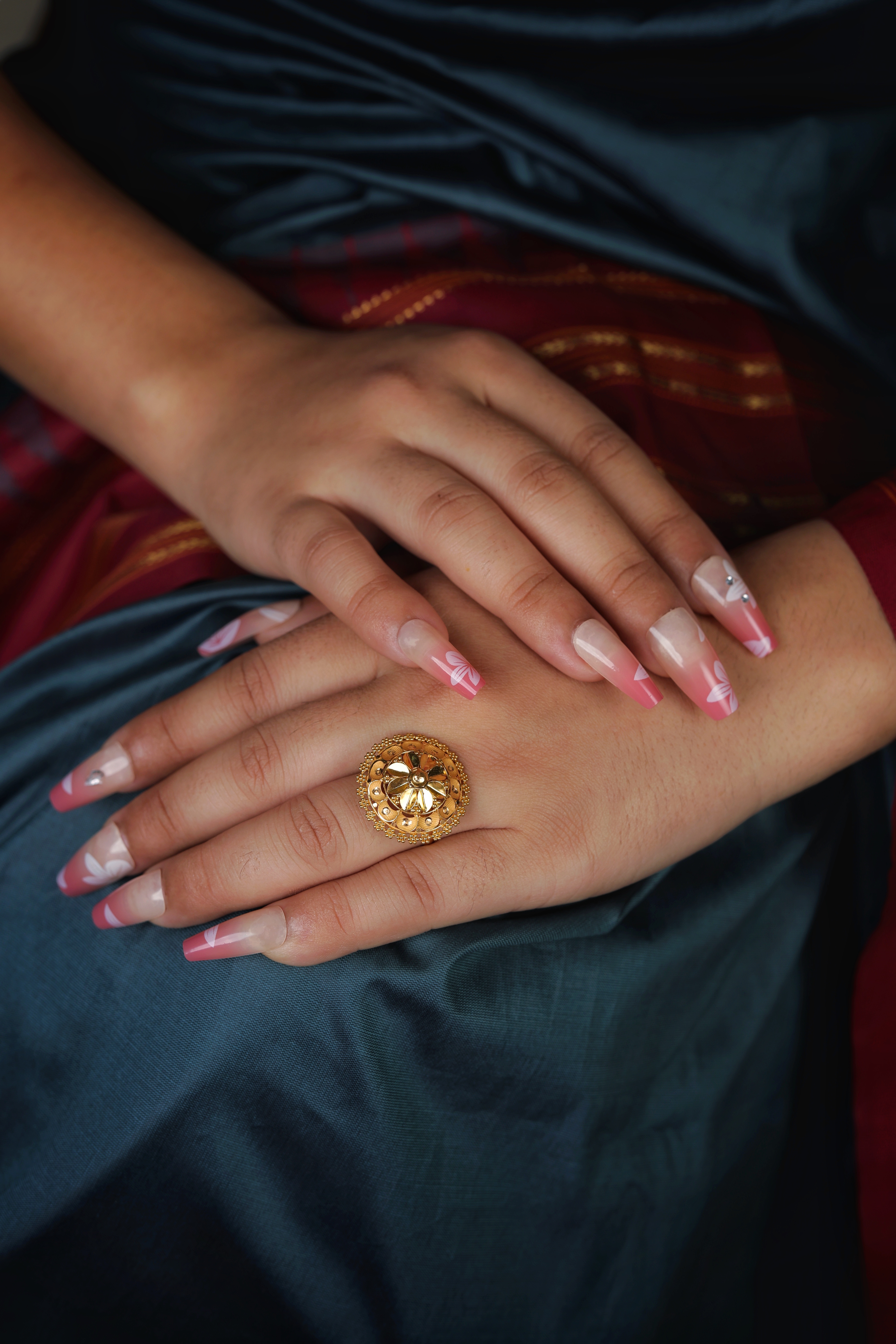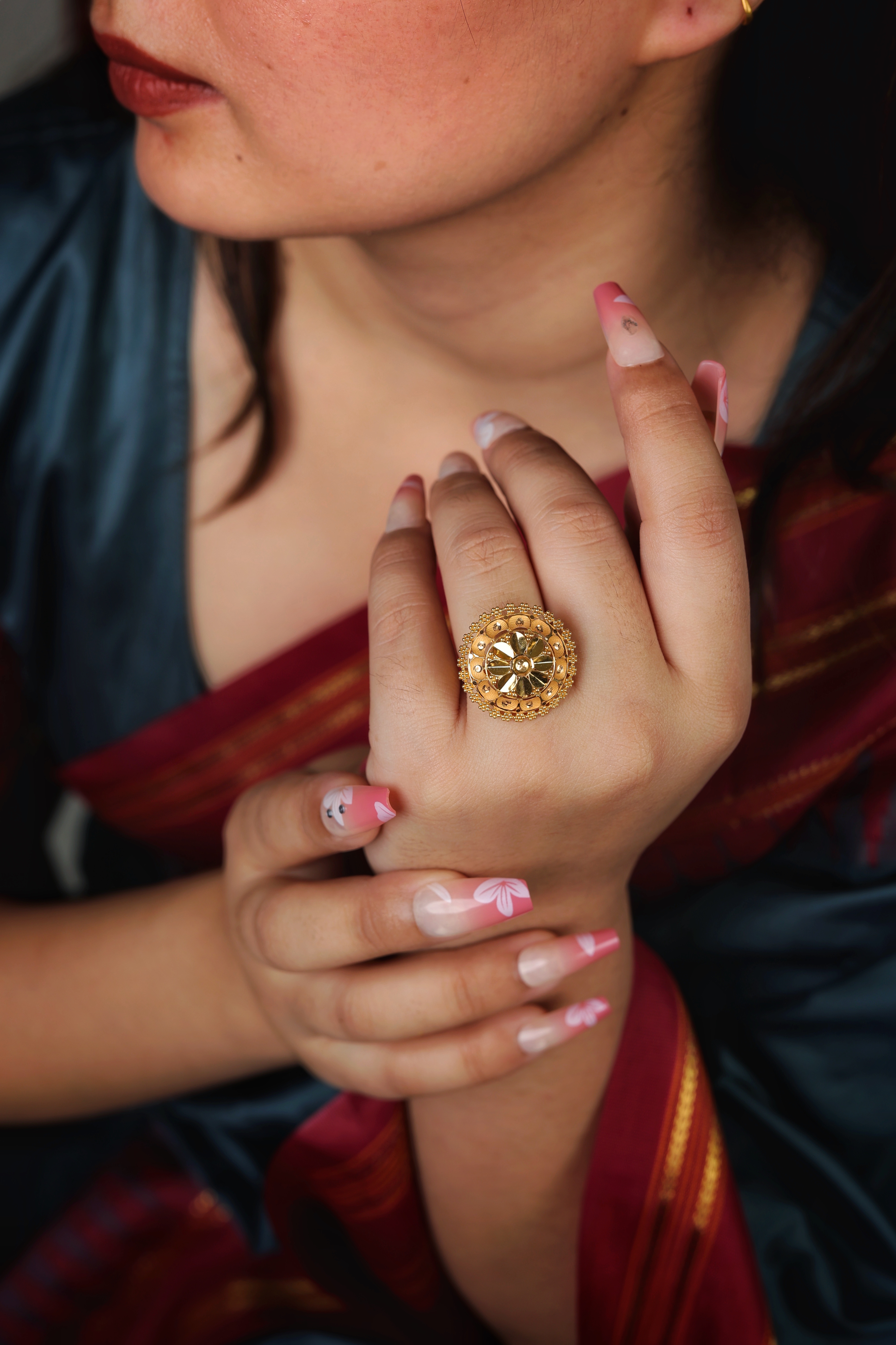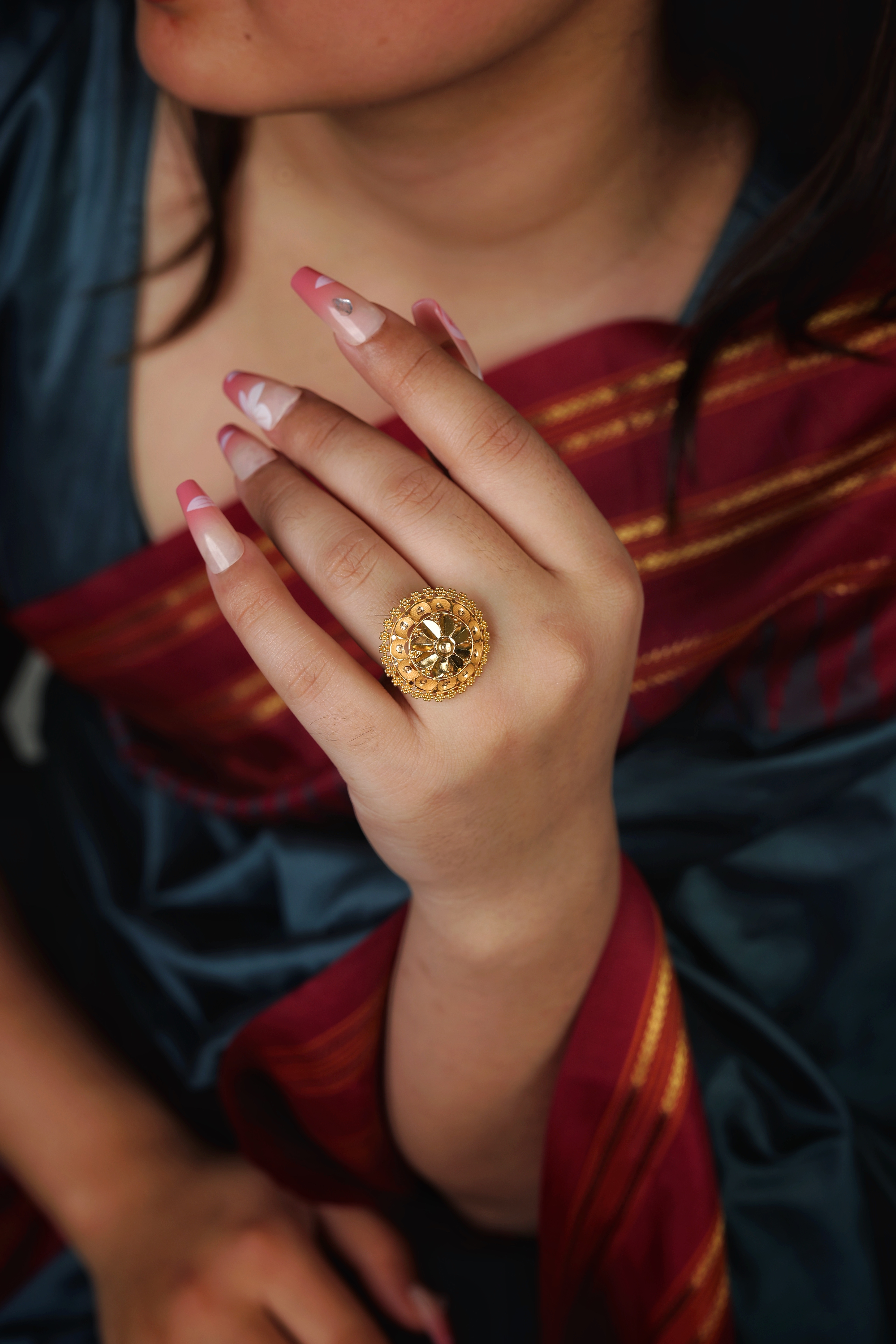 Key Features:Design: Extra-large, circular dome cocktail ring with dense all-over filigree and granulation. Embellishments: Intricate beadwork and fine gold wirework creating a textured pattern. Craftsmanship: Highly detailed traditional metalwork for a bold, three-dimensional look. Metal Purity: Assumed 22 Carat Yellow Gold (916 purity). Usage: Ideal for ceremonies, festivals, or as a signature traditional accessory.