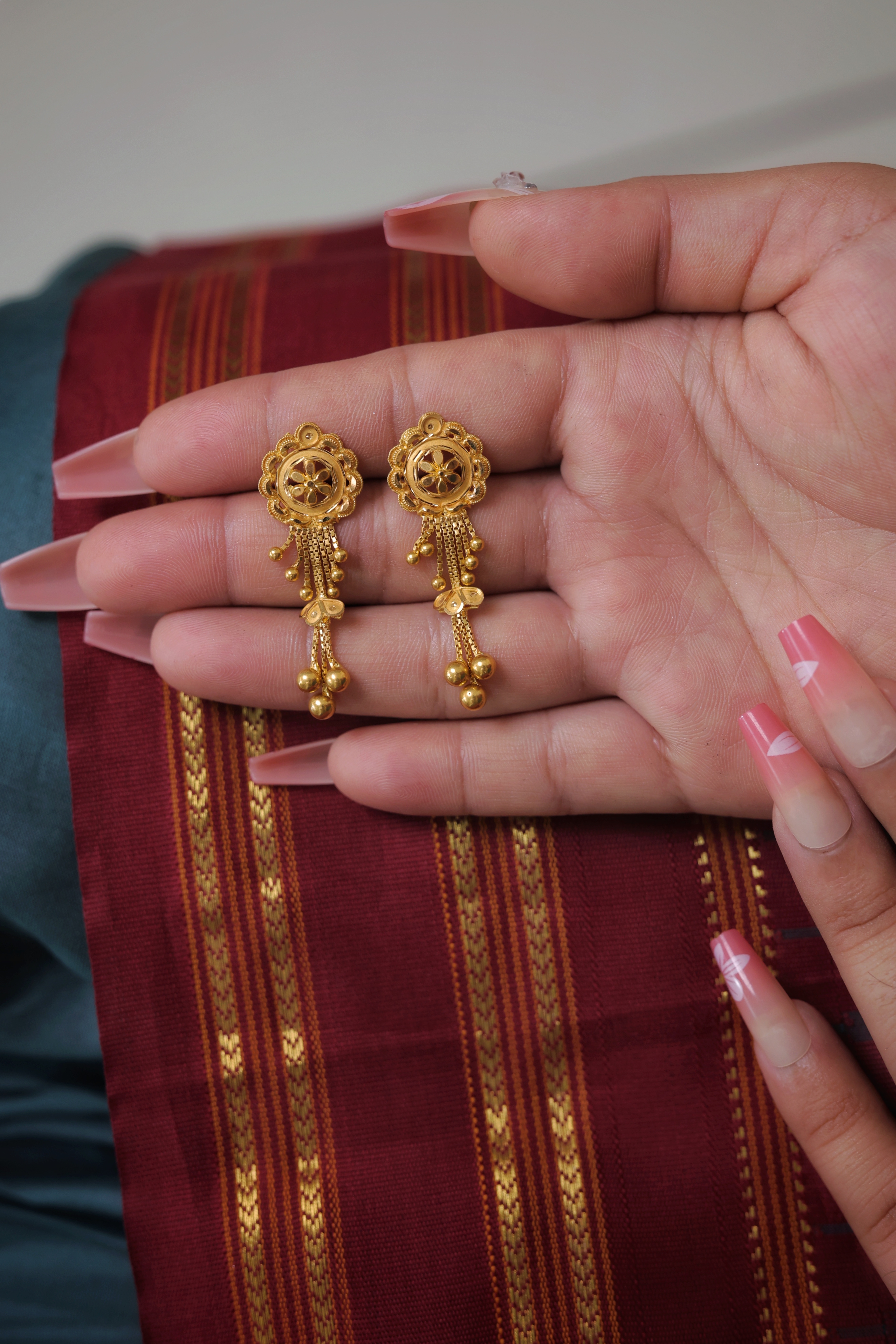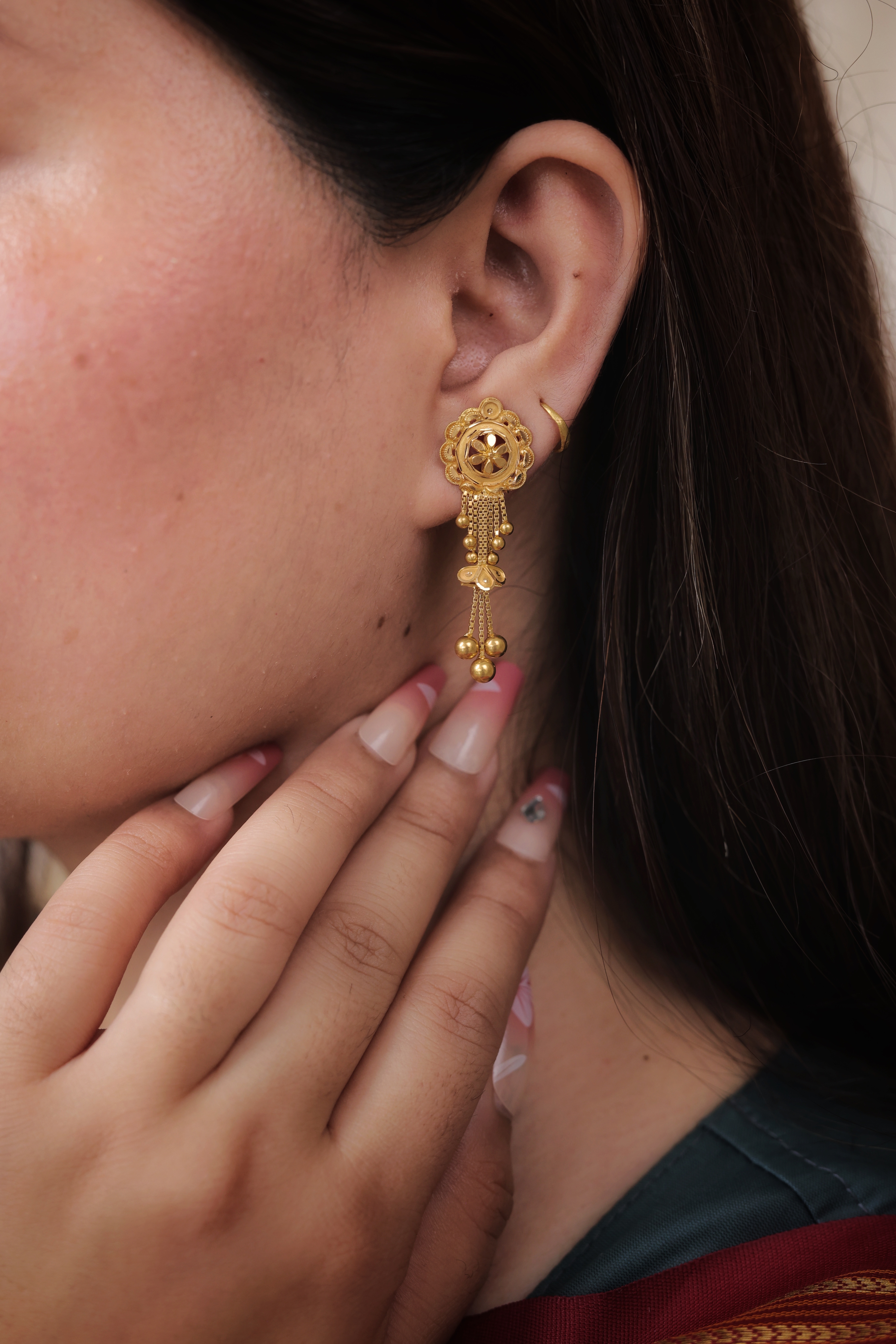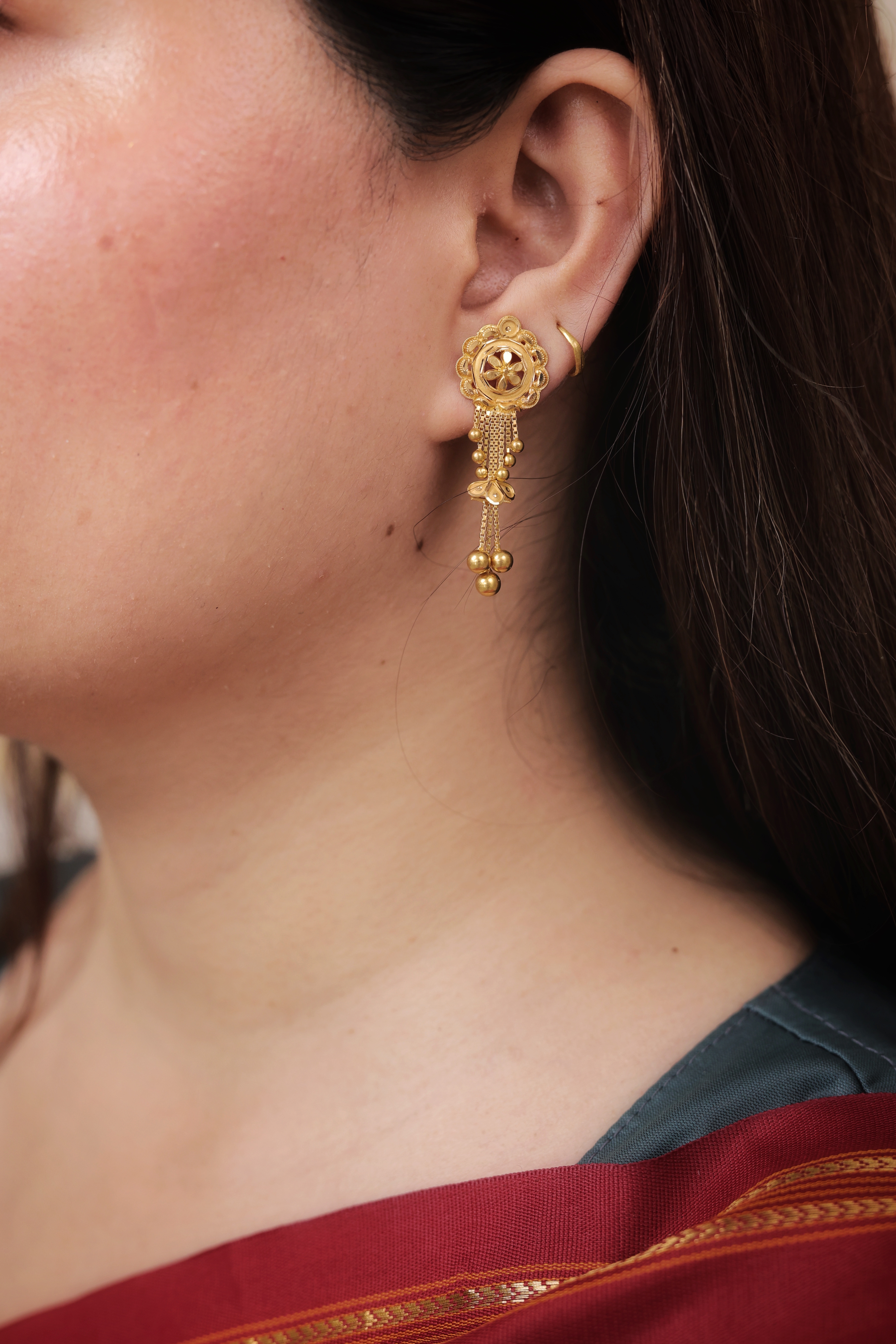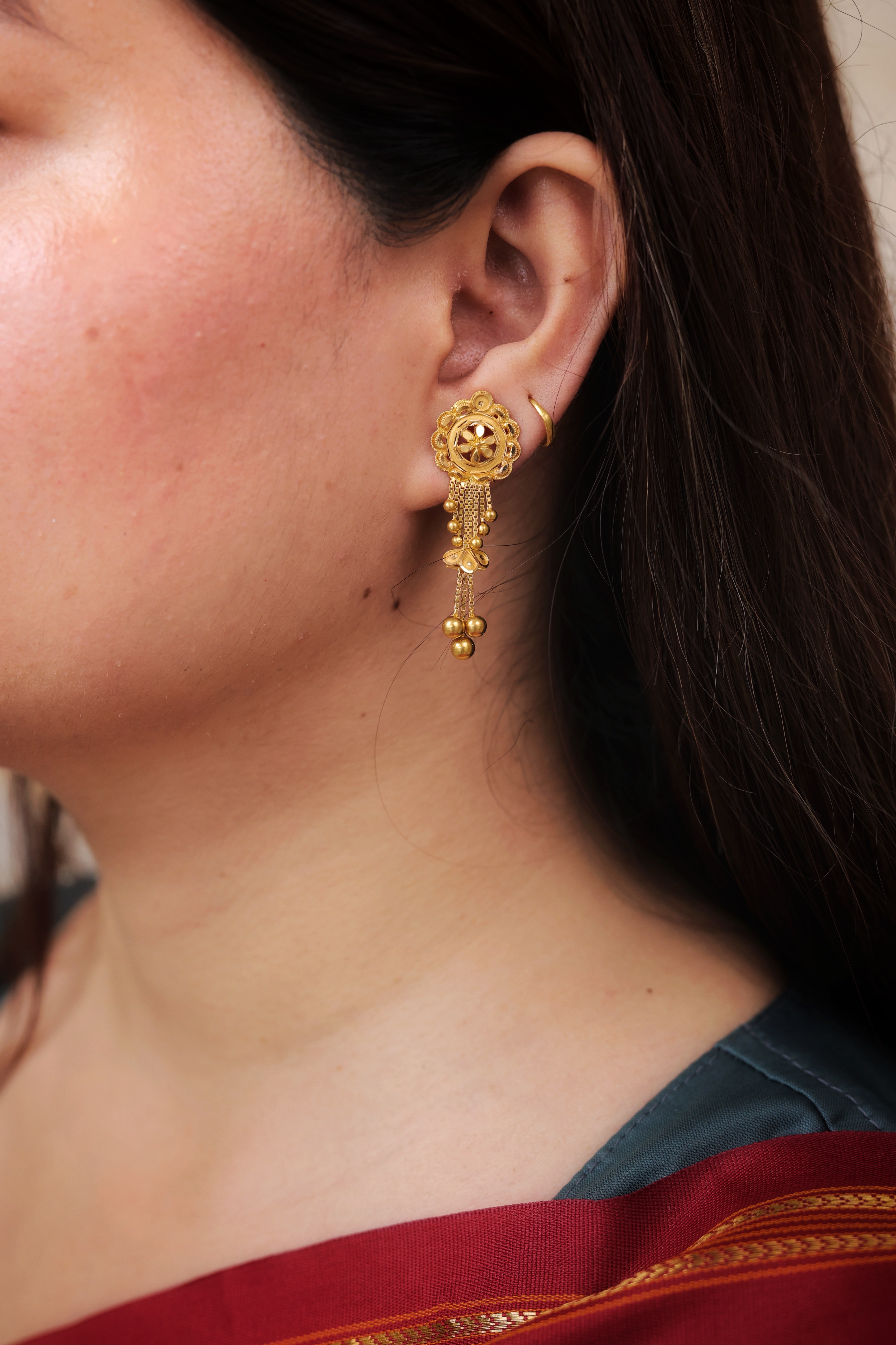 Design: Circular floral stud top with a pronounced hanging element. Embellishments: Features three cascading gold chains ending in gold balls. Craftsmanship: Detailed traditional gold filigree and granulation on the top motif. Metal Purity: Assumed 22 Carat Yellow Gold (916 purity). Usage: Ideal for daily wear, small ceremonies, or as a distinct gold accessory.
