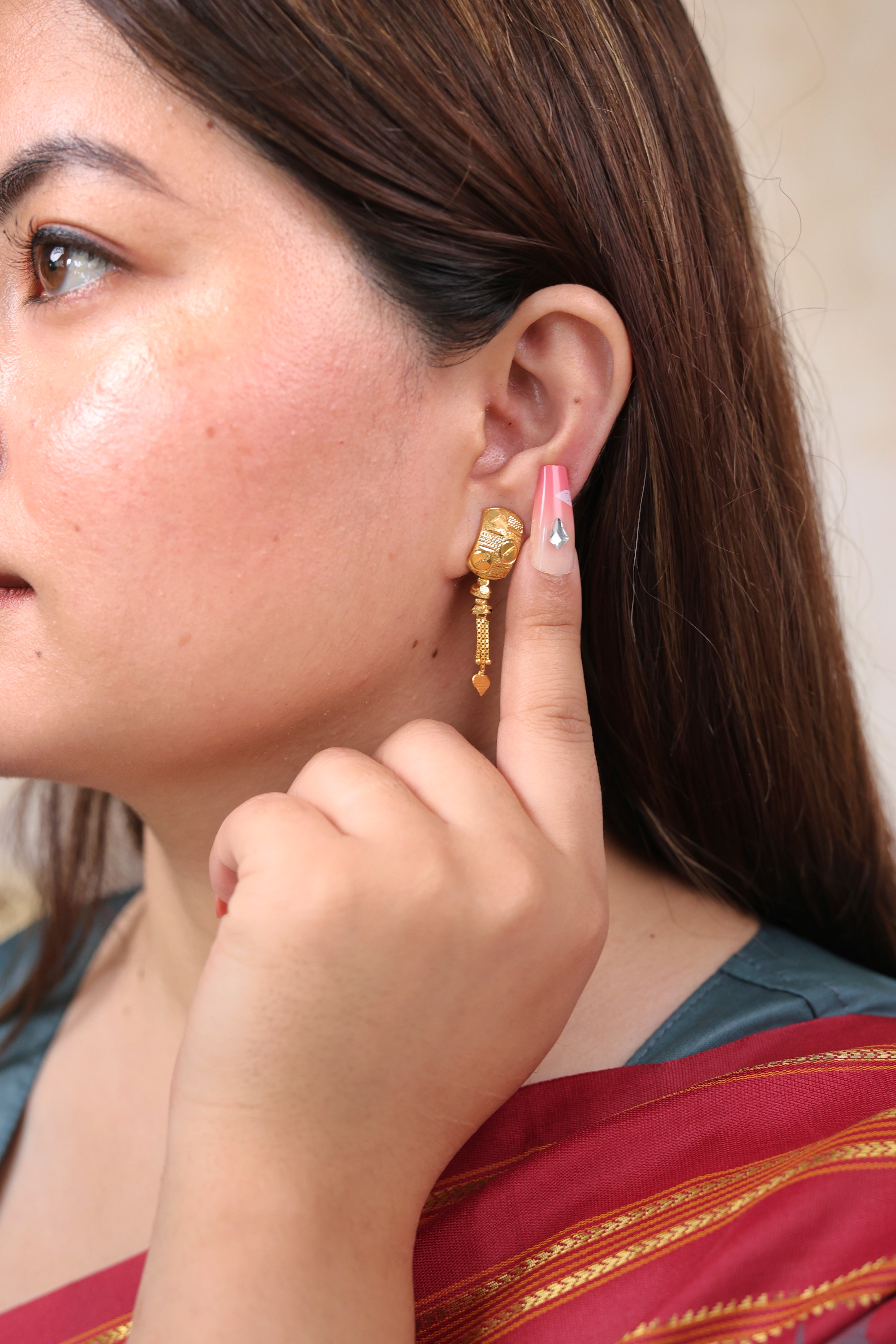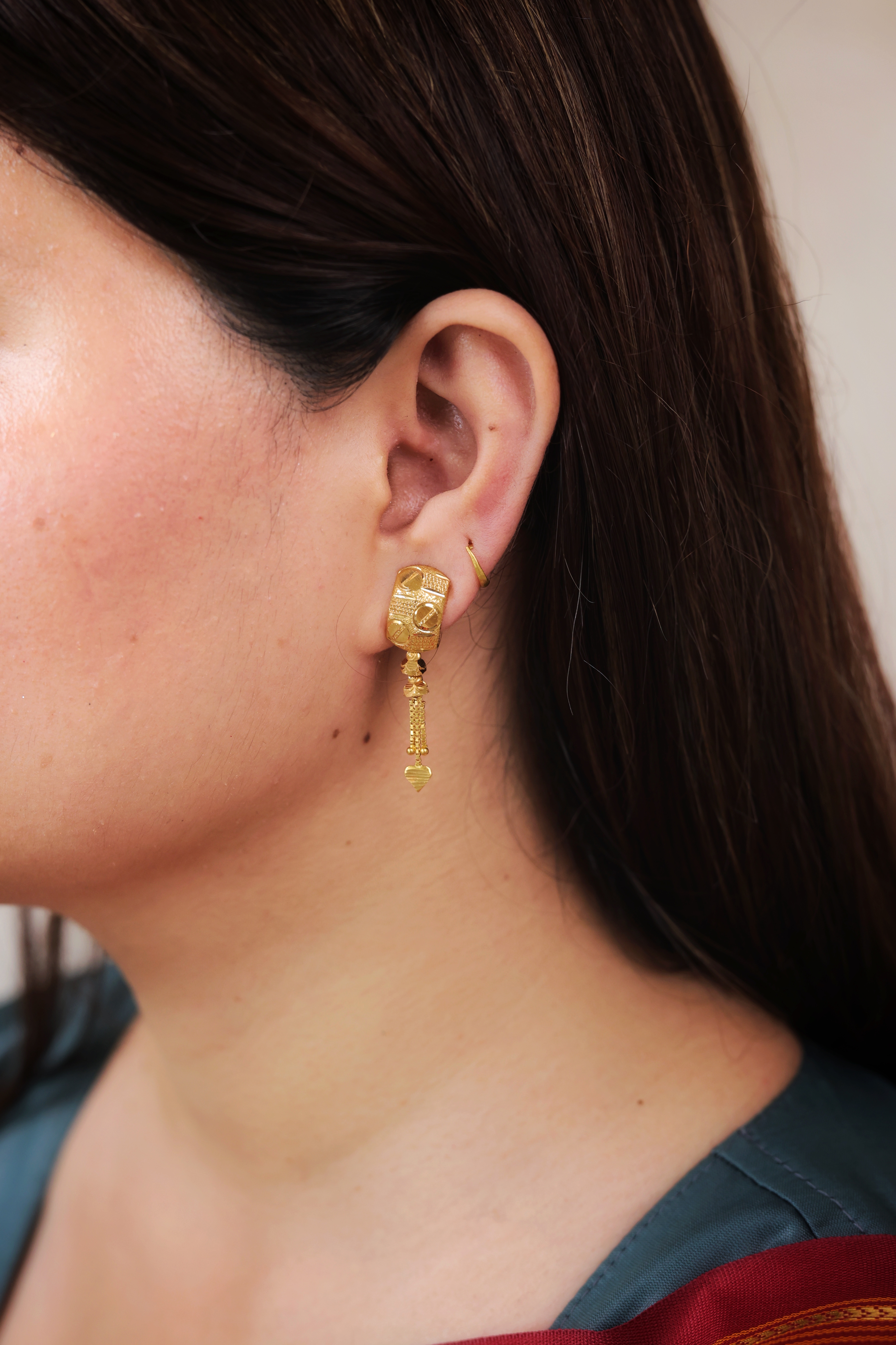 Key Features:Design: Stylized or geometric dome stud top with a pronounced hanging element. Embellishments: Features a single cascading gold chain ending in a gold ball. Craftsmanship: Detailed traditional gold filigree and granulation on the top motif. Metal Purity: Assumed 22 Carat Yellow Gold (916 purity). Usage: Ideal for daily wear, small ceremonies, or as a distinct gold accessory.