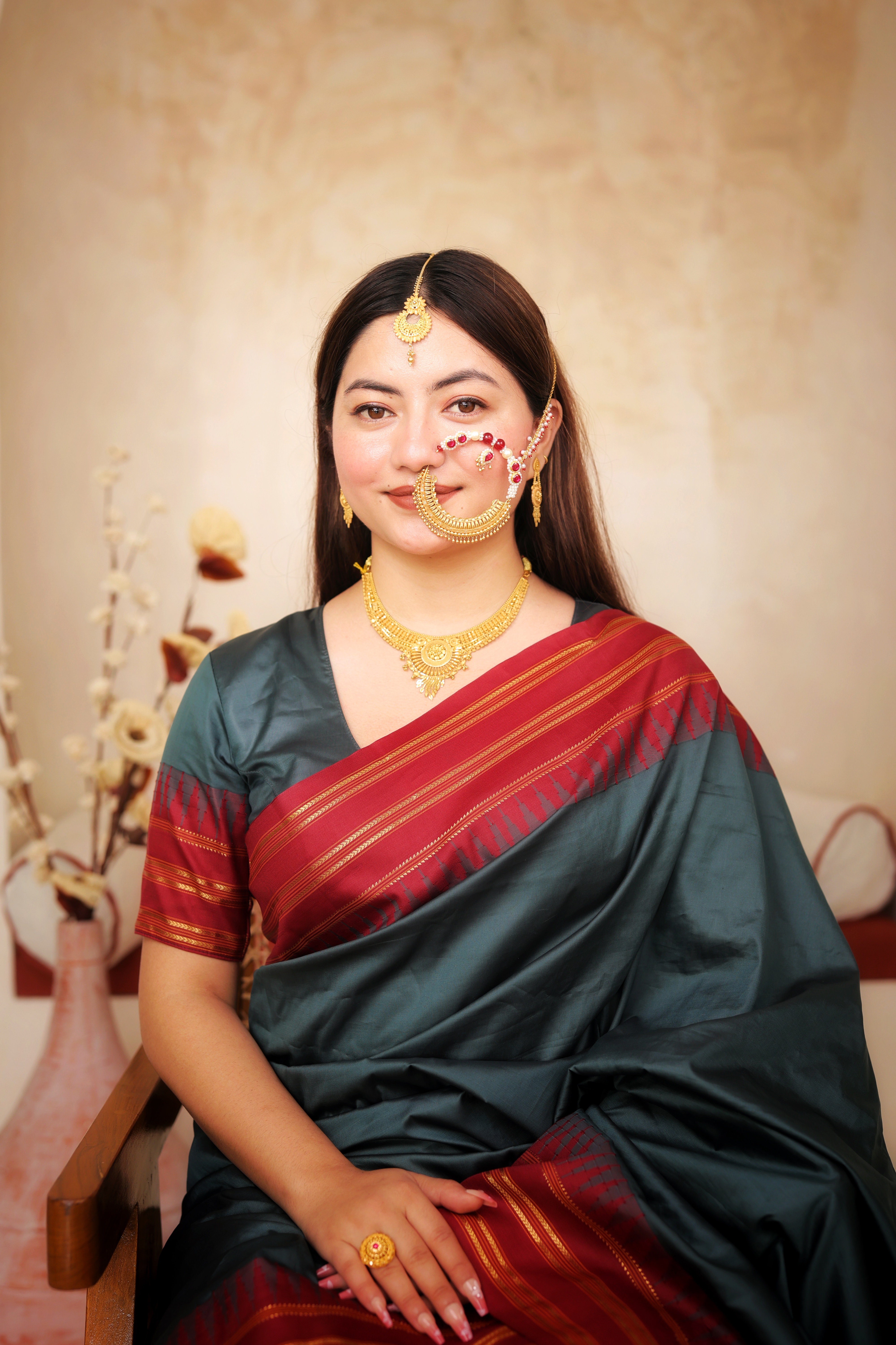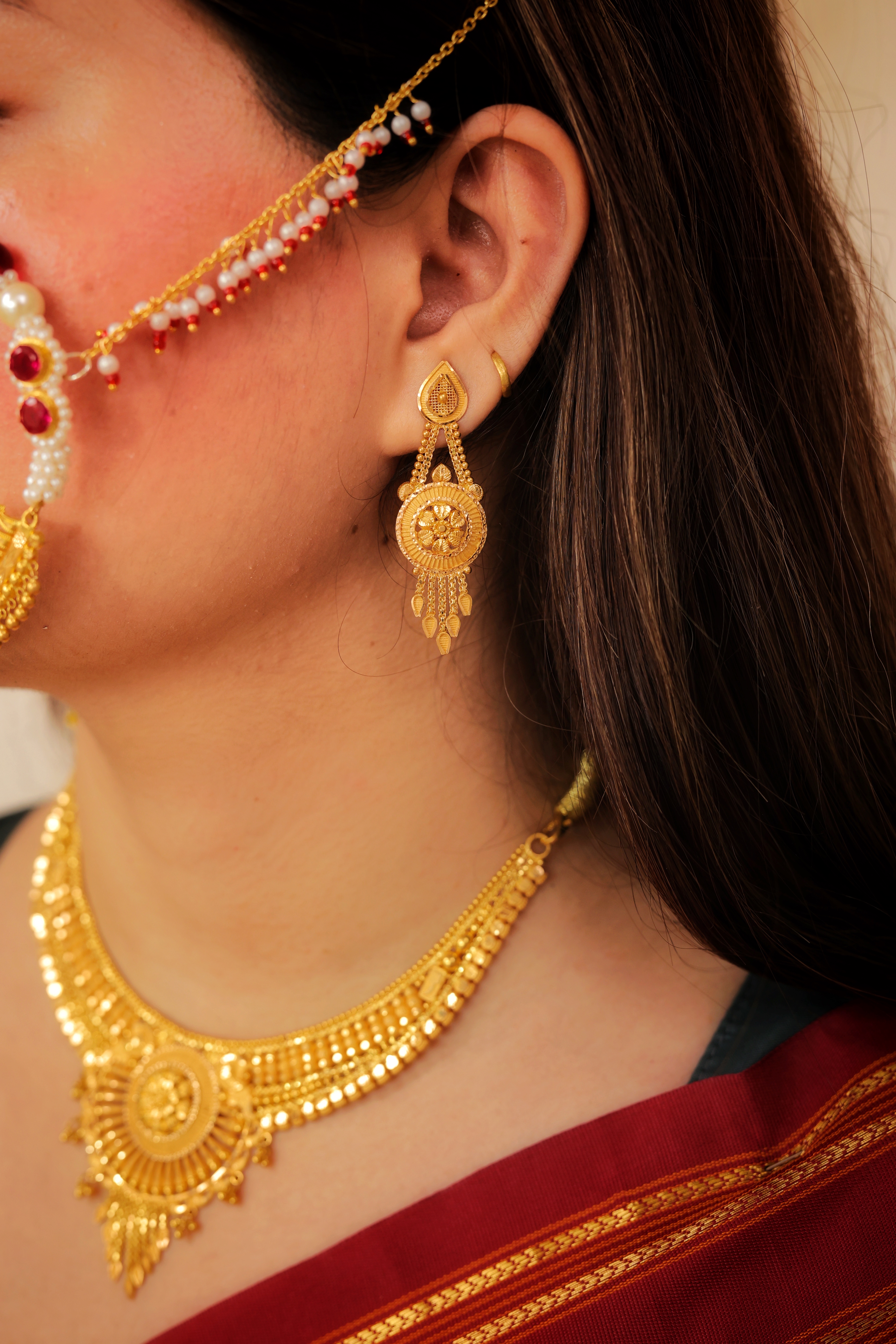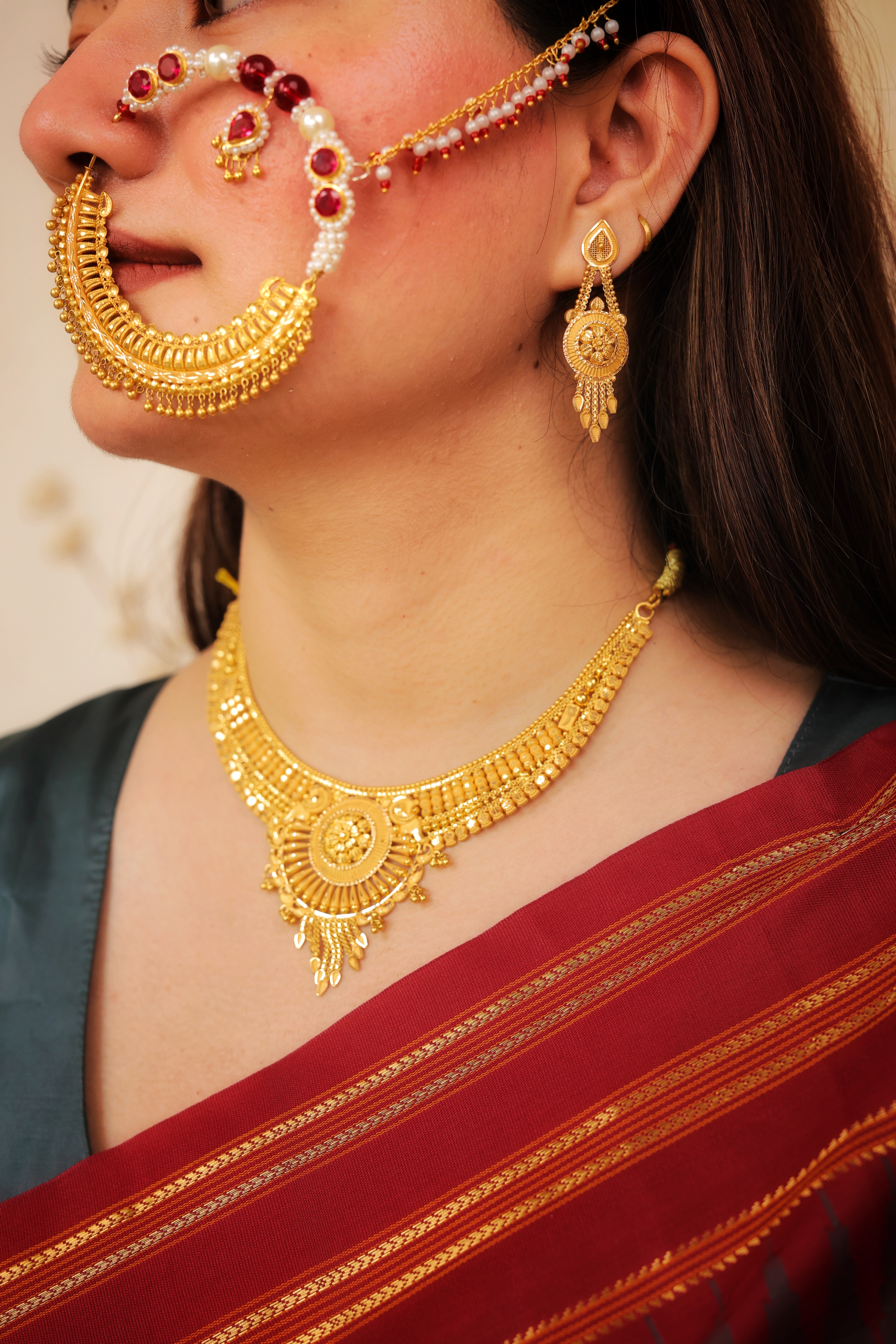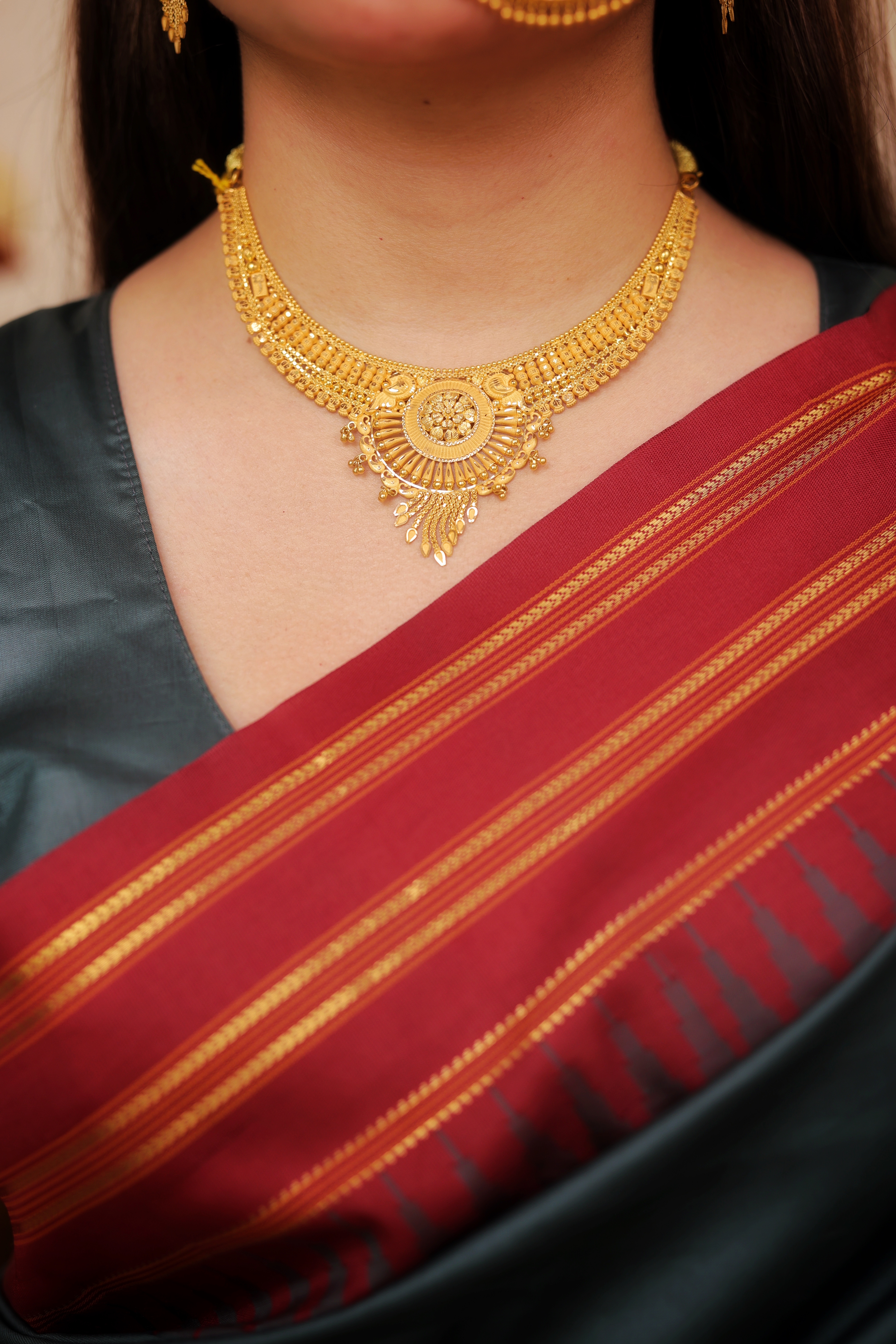 Key Features:Design: Matching set including a wide collar necklace (Haar) and drop earrings. Embellishments: Richly detailed with gold granulation, fine filigree, and hanging gold drops. Craftsmanship: Detailed traditional metalwork for a bold, dimensional, and voluminous look. Metal Purity: 22 Carat Yellow Gold (916 purity). Usage: Essential bridal, wedding, or high-ceremonial wear.