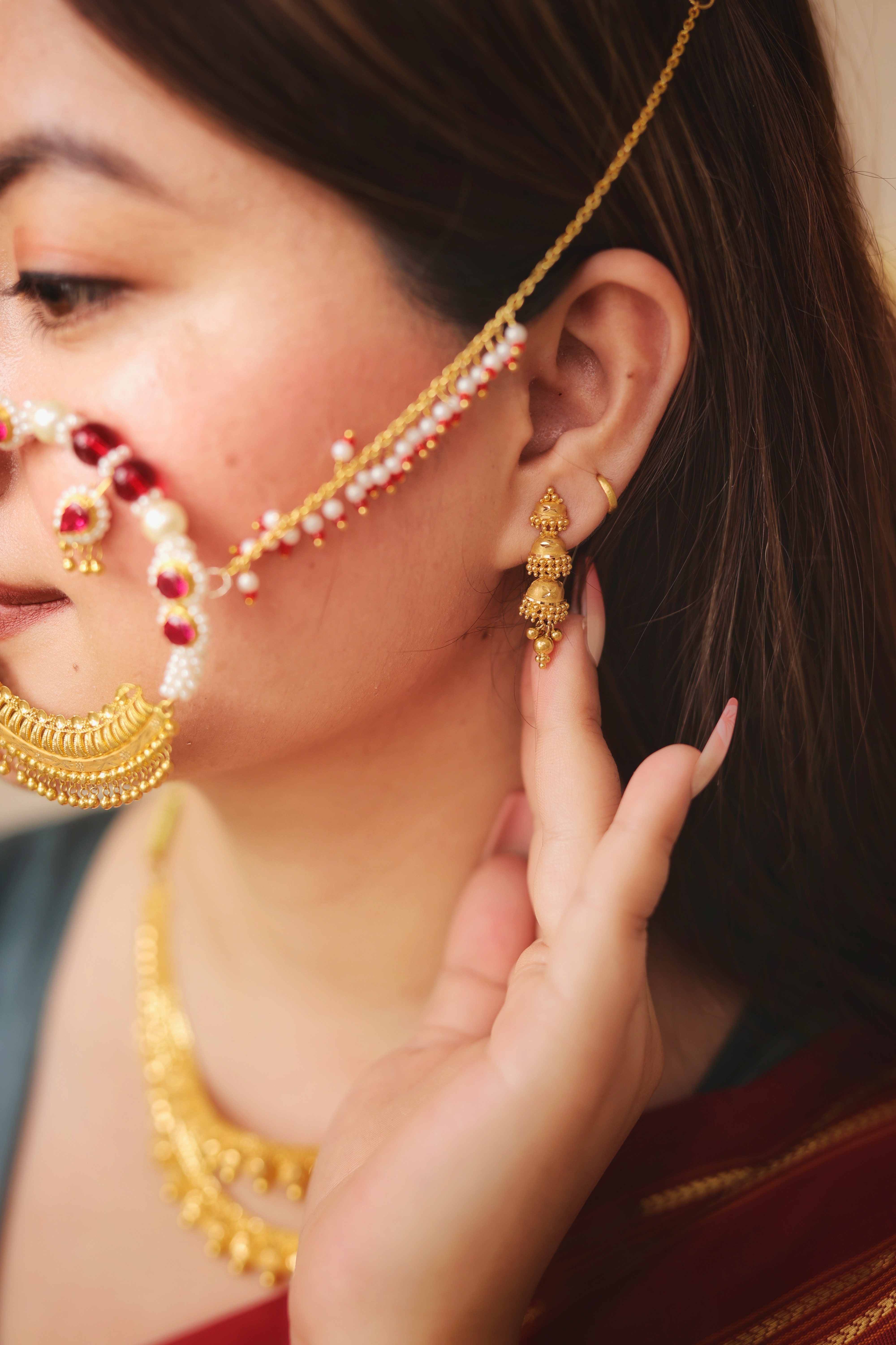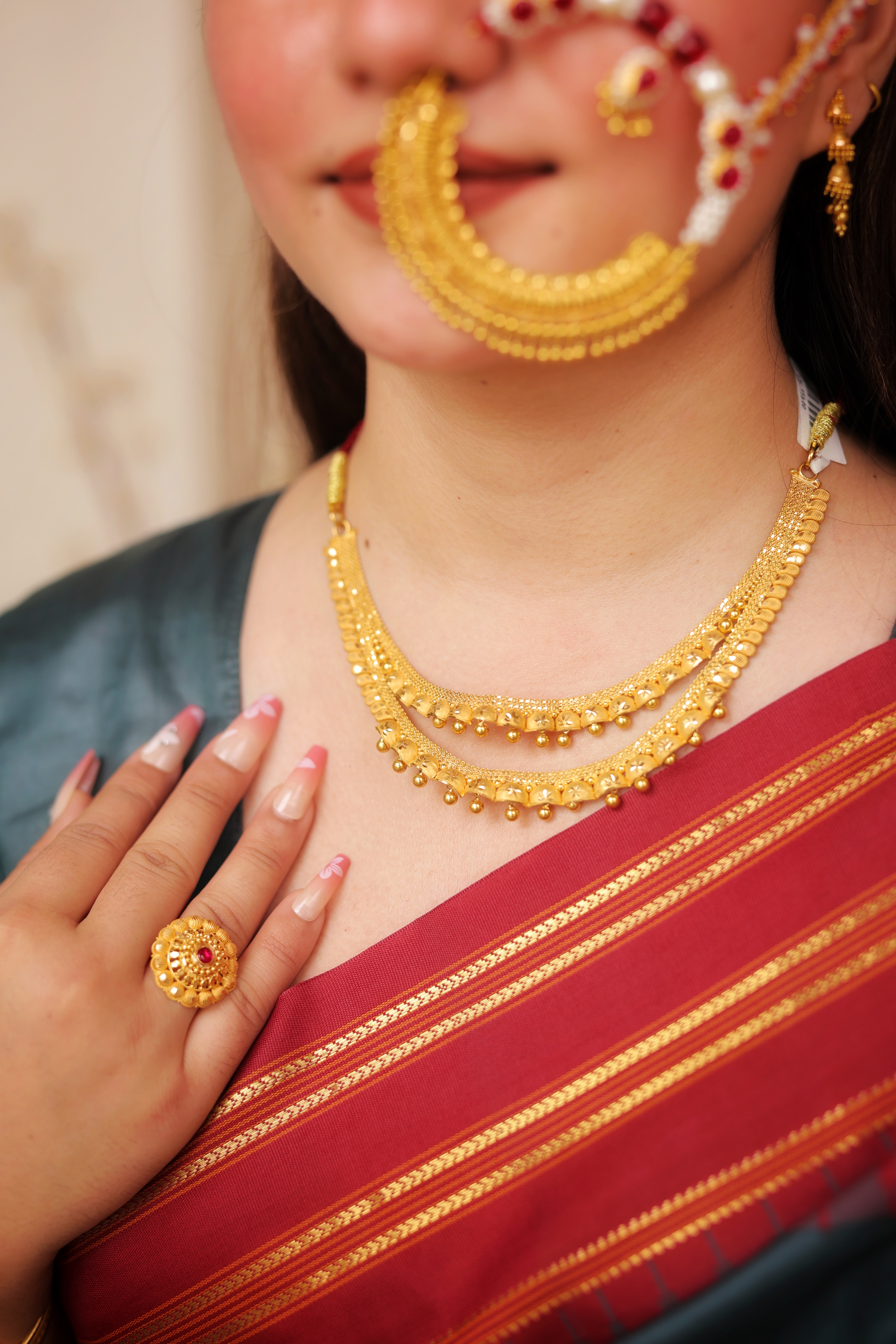 Key Features:Design: Matching set including a two-layered necklace and dome-drop studs. Embellishments: Features numerous small, textured gold dome pendants along the lower edge. Craftsmanship: Detailed traditional goldwork, emphasizing volume and texture. Metal Purity: 22 Carat Yellow Gold (916 purity). Usage: Ideal for ceremonies, festivals, or traditional styling.