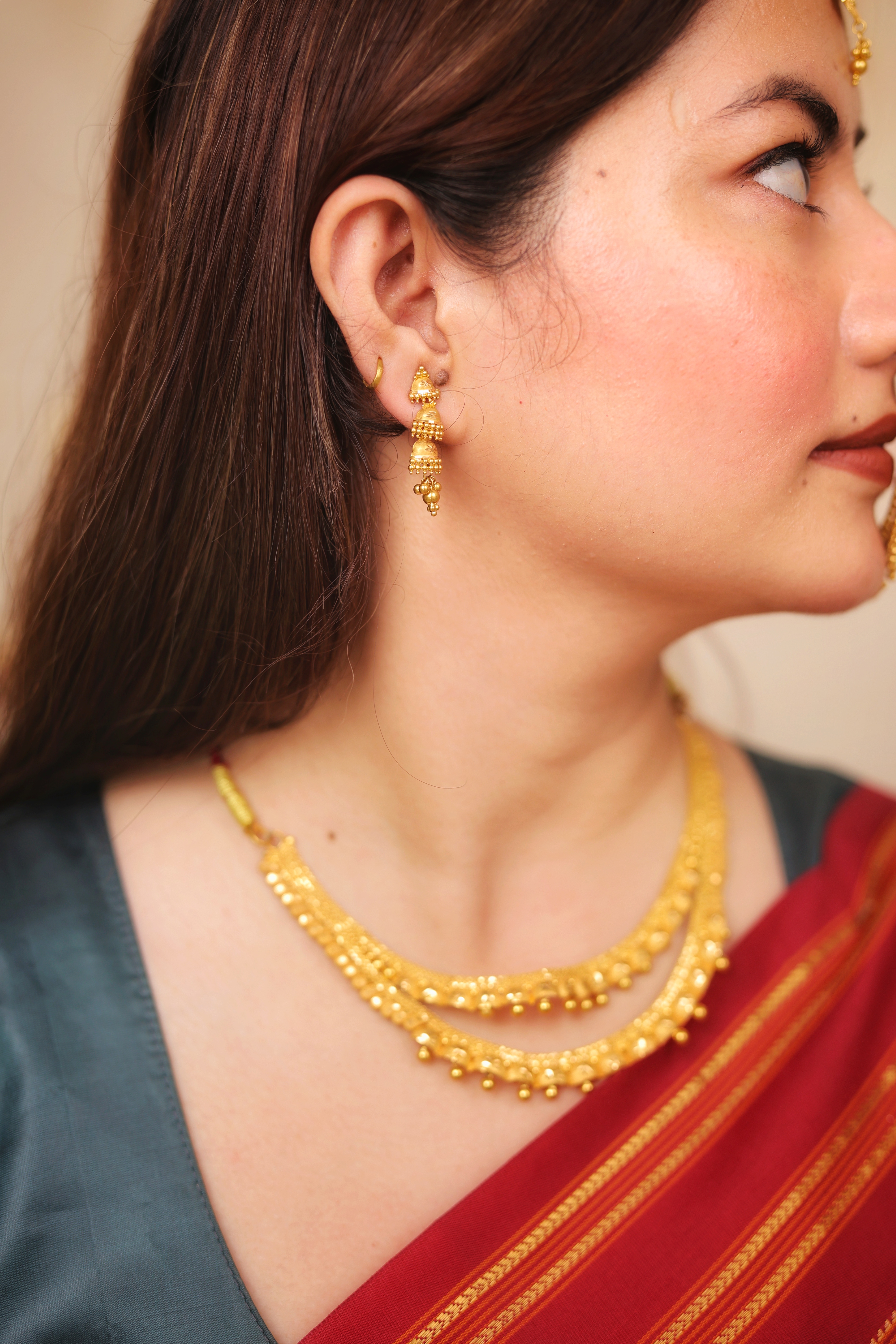 Traditional Two-Layer Gold Necklace Set with Dome Drop Earrings