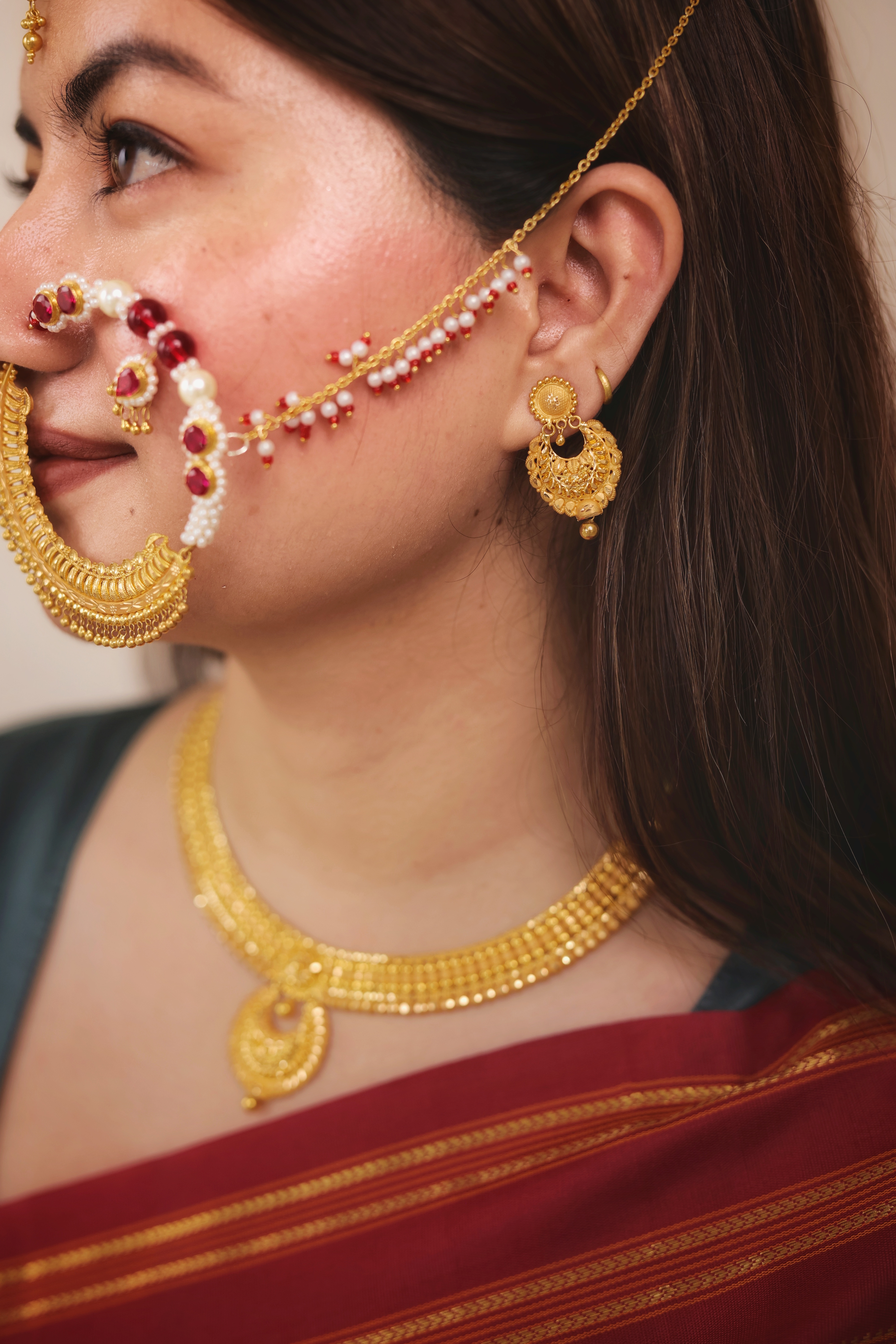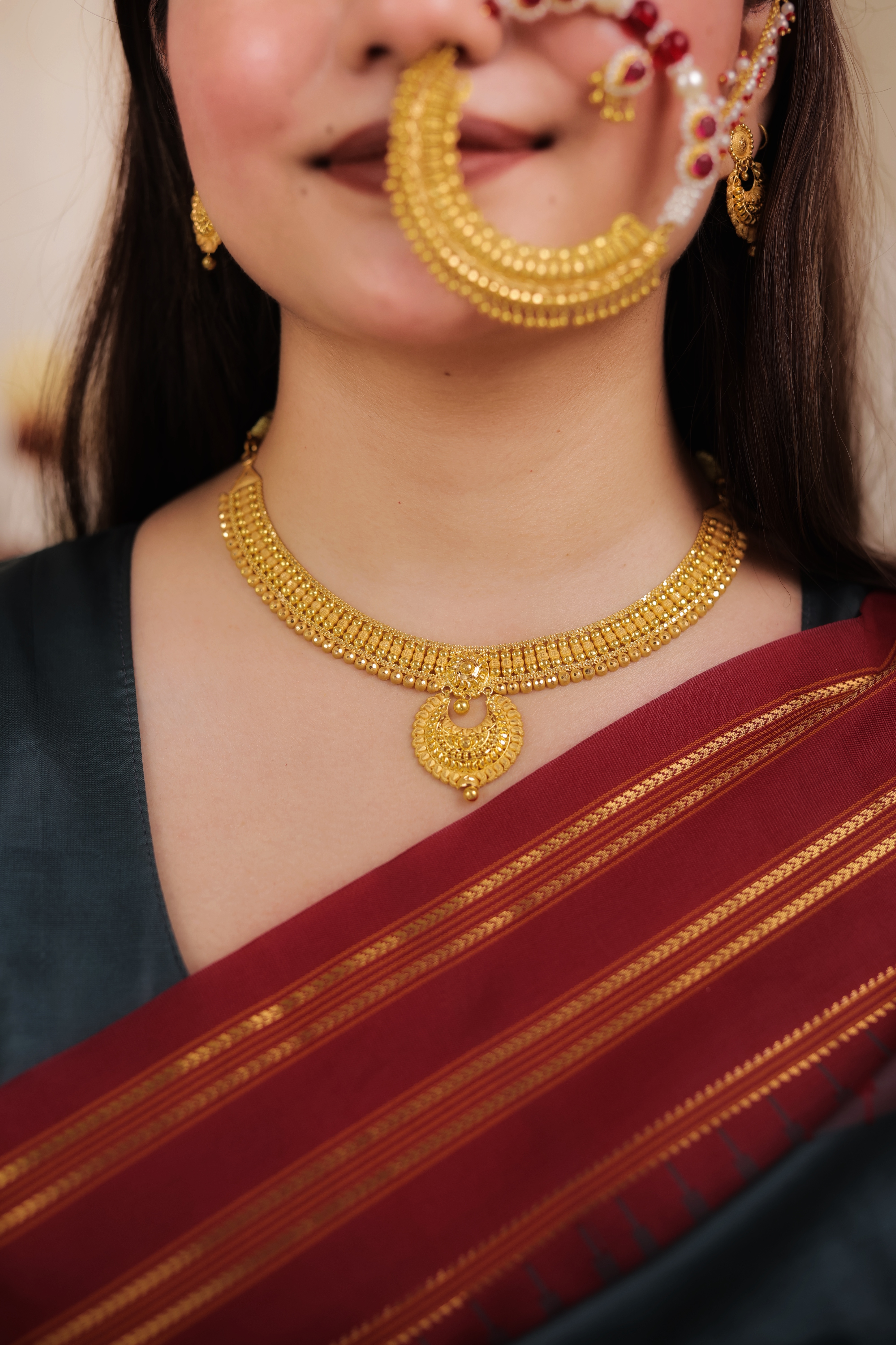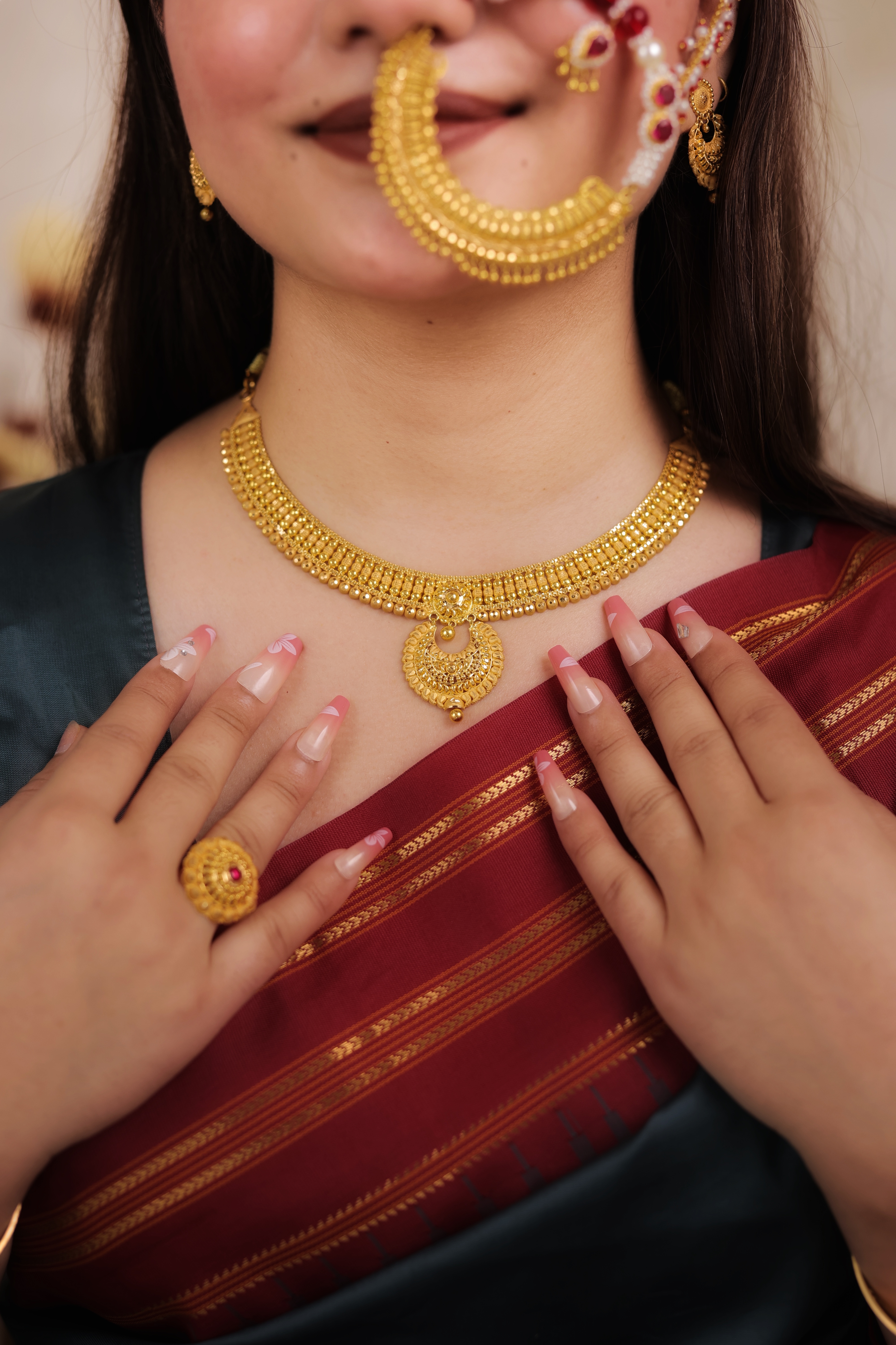 Key Features:Design: Matching set including a textured collar necklace and small jhumka-style drop earrings. Embellishments: Features prominent stylized crescent pendants and rich gold granulation. Craftsmanship: Highly detailed traditional metalwork emphasizing texture and volume. Metal Purity: 22 Carat Yellow Gold (916 purity). Usage: Ideal for ceremonies, festivals, or traditional styling.