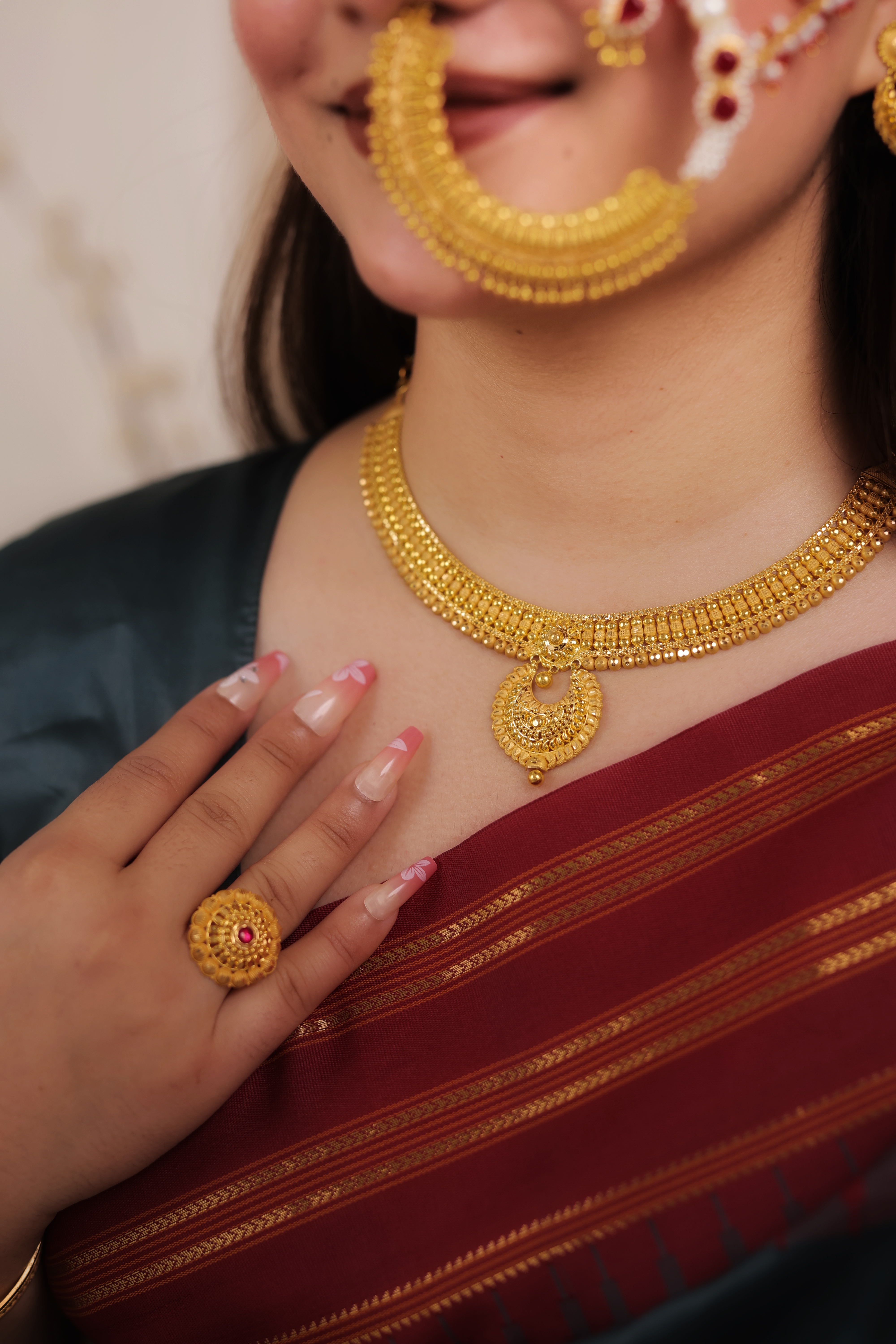 This is an elegant traditional jewelry set, suitable for semi-formal to ceremonial wear, crafted in rich 22-carat yellow gold (916 purity).
