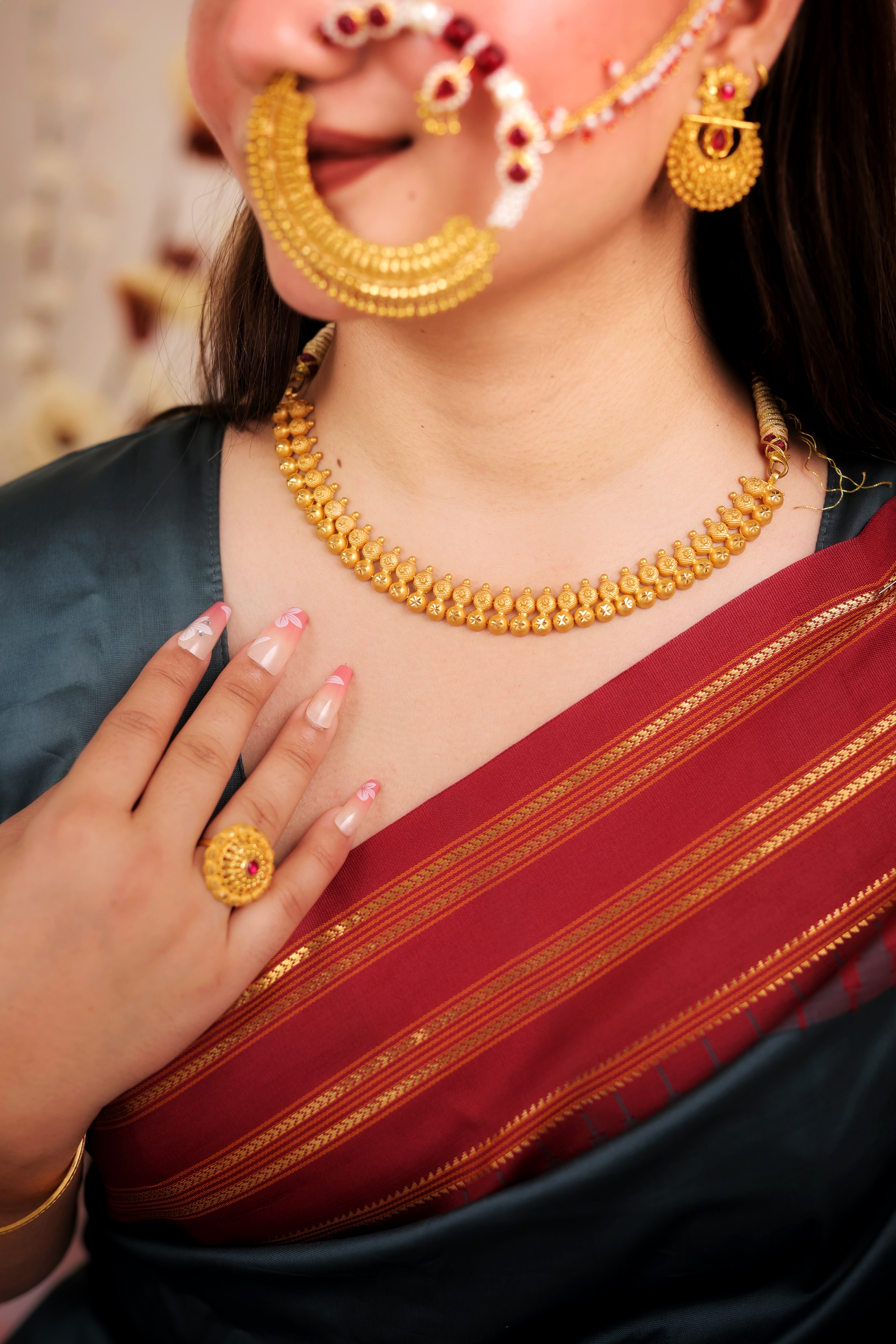This is an elegant traditional jewelry set, suitable for semi-formal to ceremonial wear, crafted in rich 22-carat yellow gold (916 purity).
