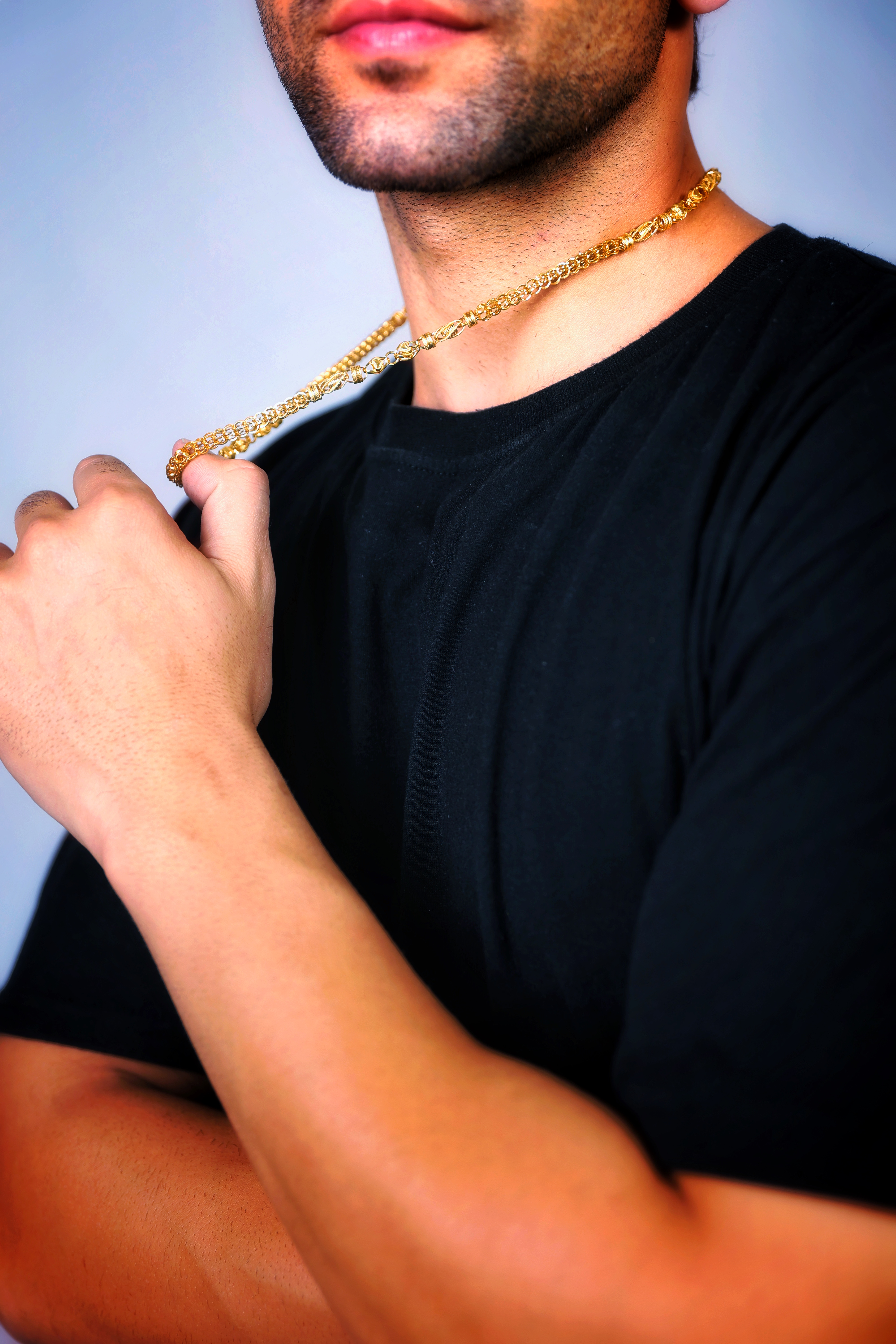 This impressive gold chain is designed for men, crafted in rich 22-carat yellow gold (916 purity). The chain utilizes a sophisticated blend of link styles, combining larger interwoven links (forming a continuous patterned band) with smaller, highly textured or beaded accent units separating the main sections. This alternating pattern gives the chain a robust, masculine weight and a high degree of visual interest and sparkle.