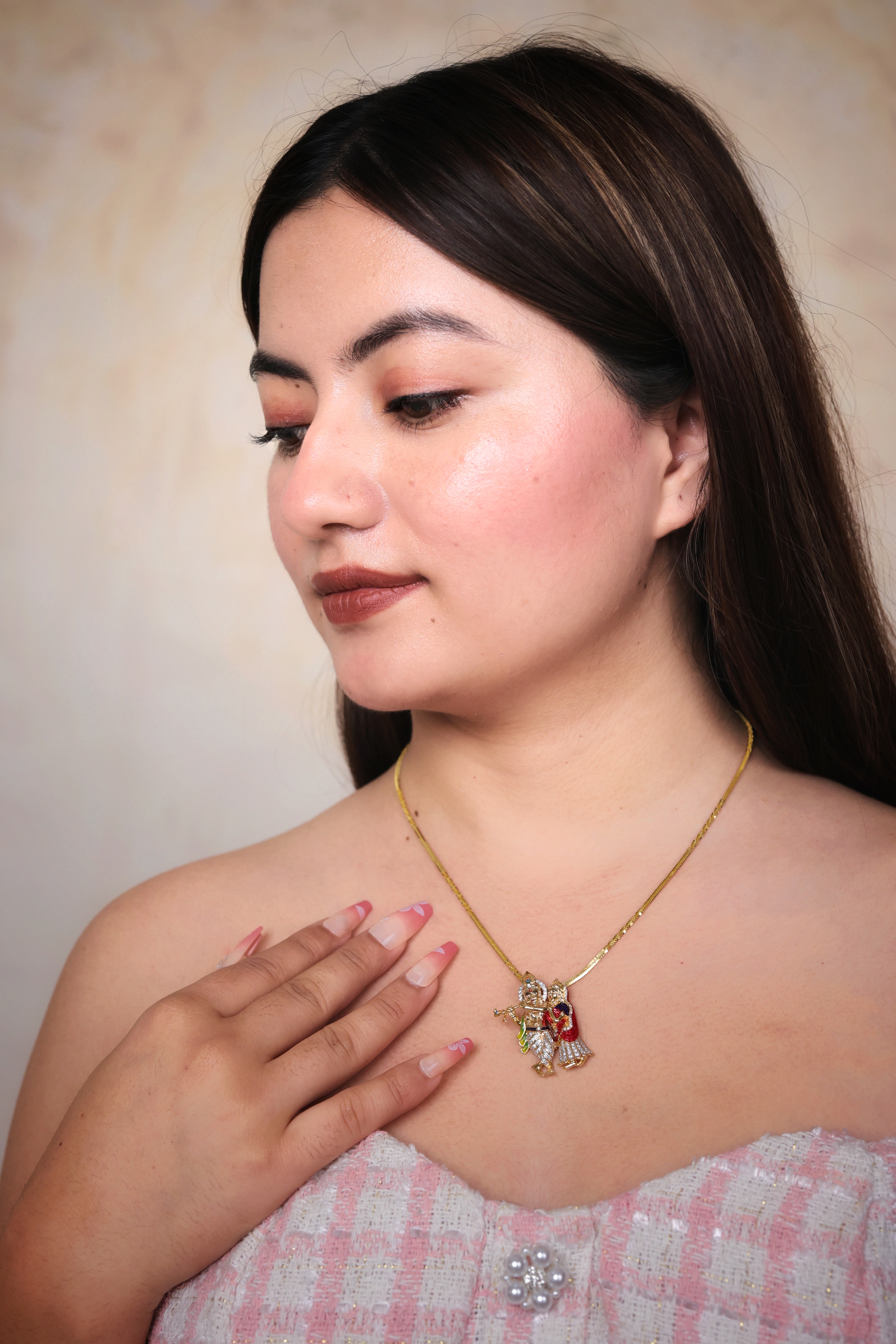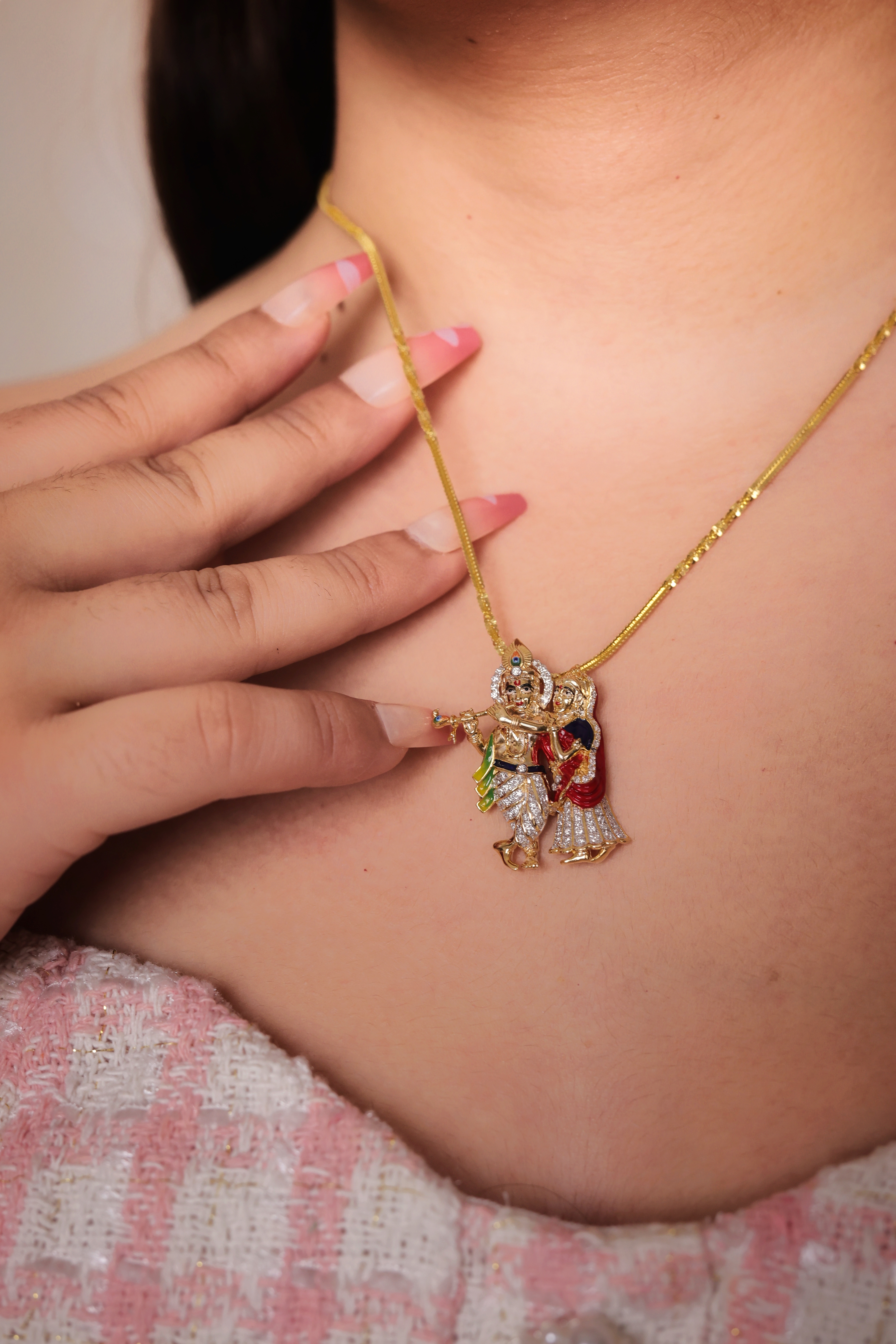 An exquisite and devotional pendant in yellow gold, featuring the stylized figures of Radha and Krishna adorned with sparkling white, red, and green stone/enamel accents.