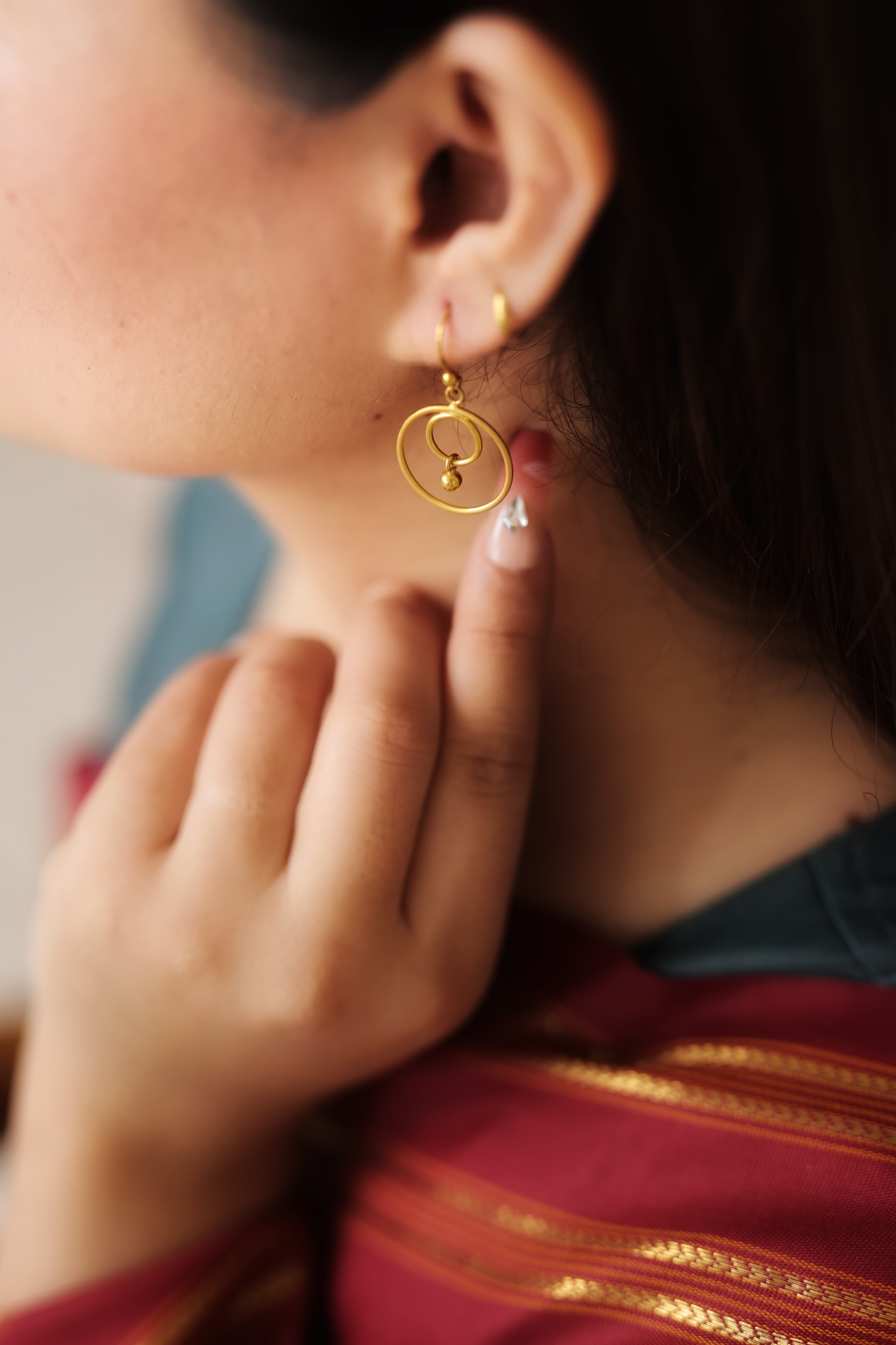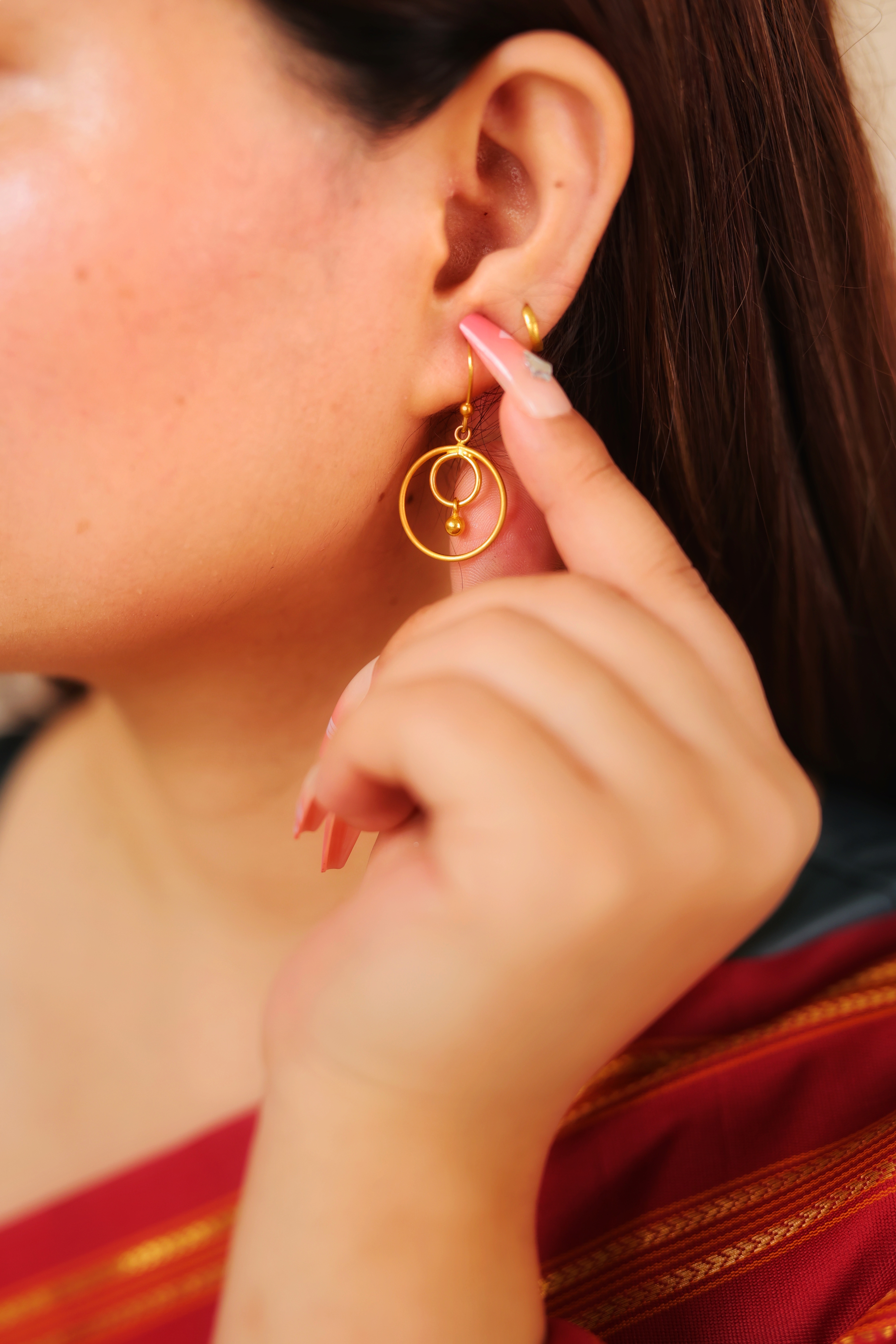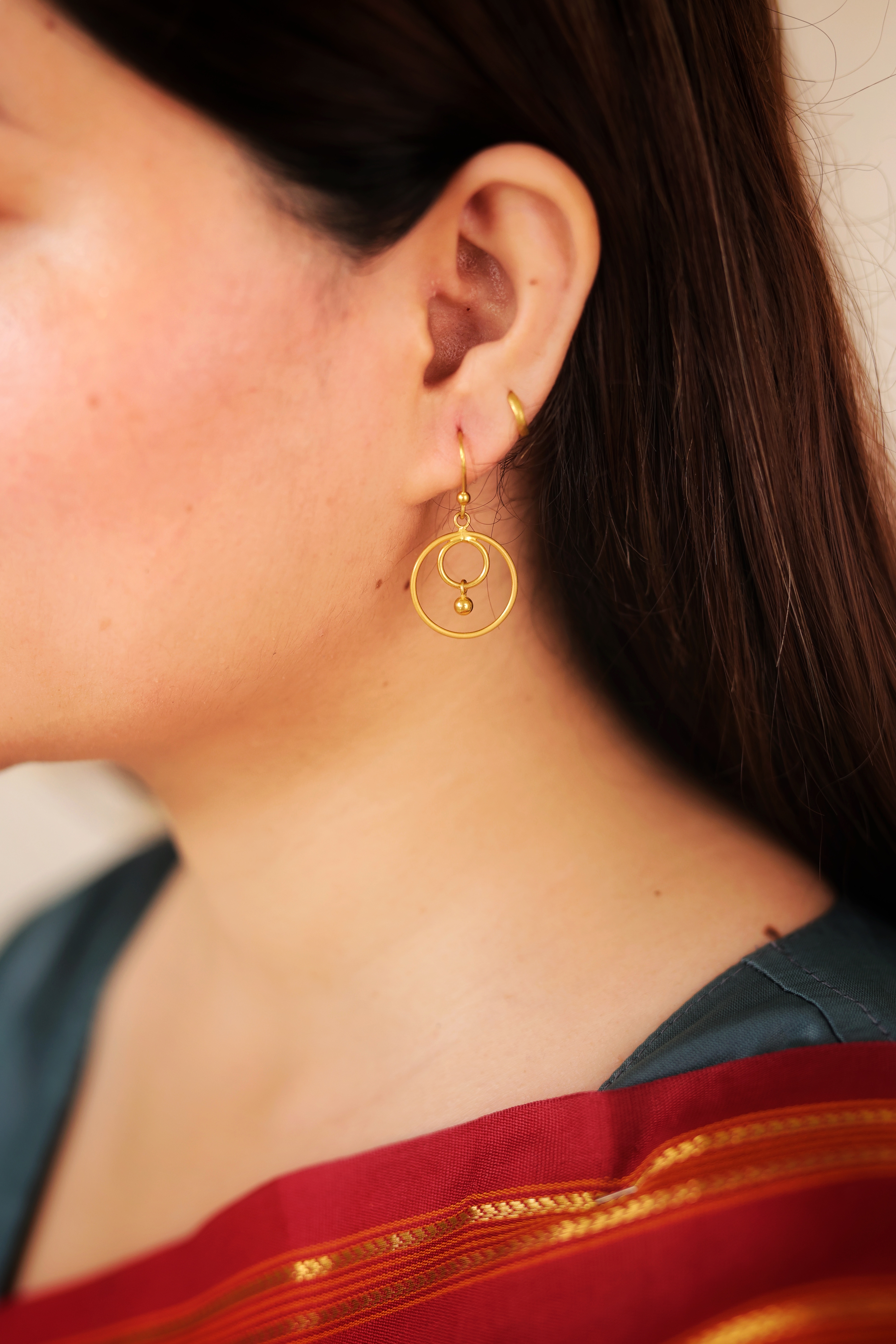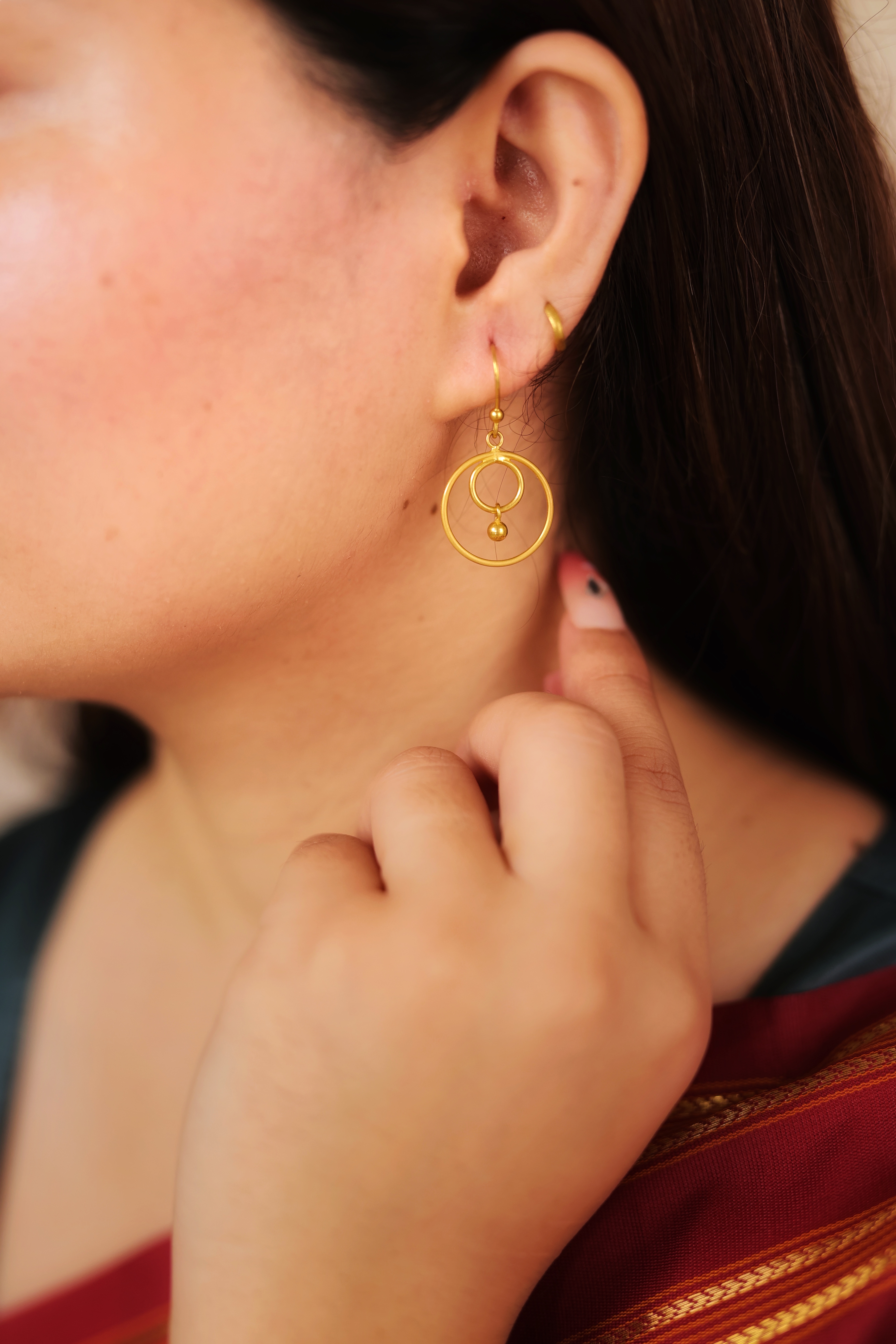 The design consists of a delicate interlocking pattern of two simple gold hoops or circles. The smaller inner circle is attached to a tiny gold ball drop (the jhallar element). This construction allows the earrings to hang freely and move gracefully. The overall look is minimal, geometric, and lightweight, making them comfortable for all-day wear while still retaining a classic gold shine.