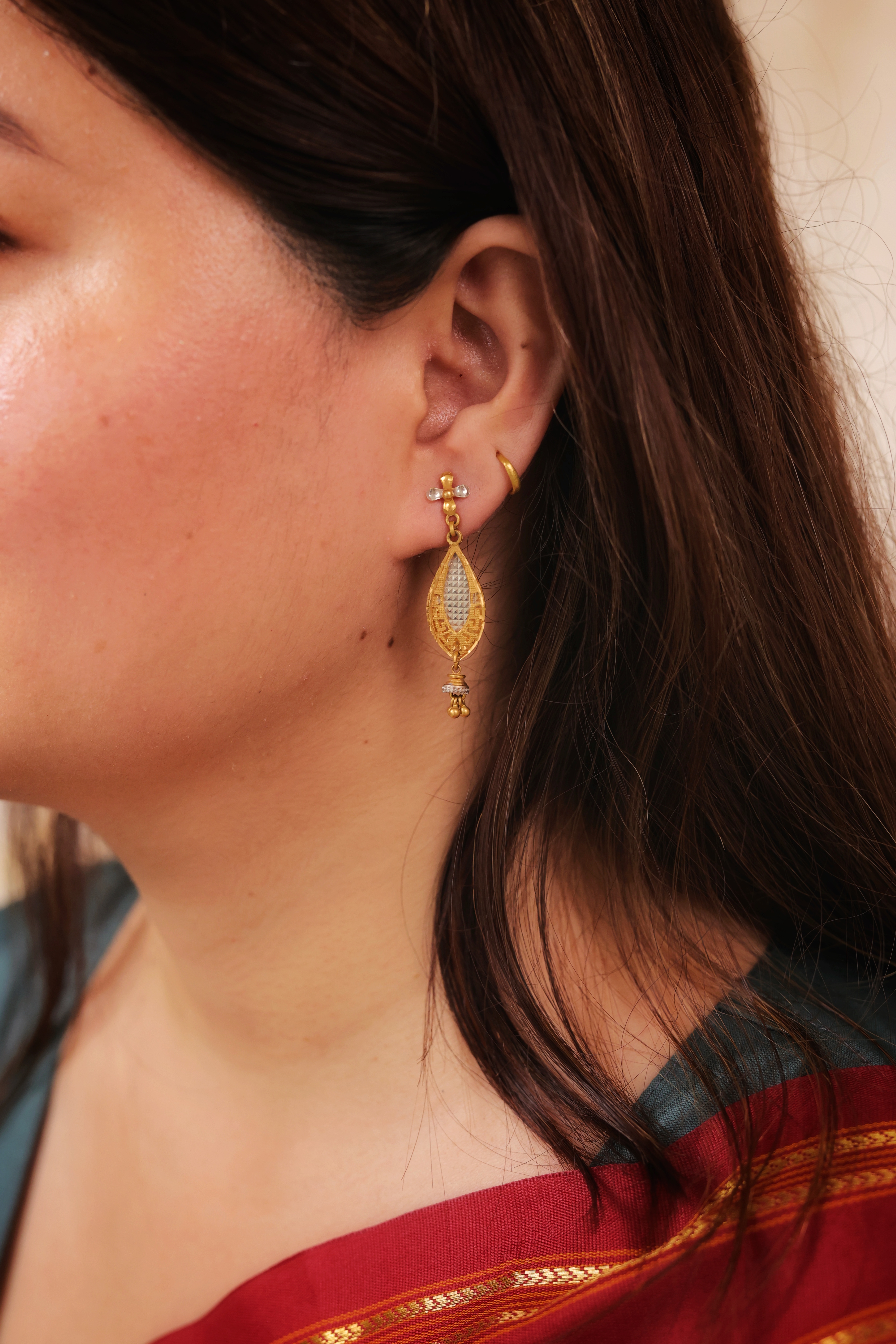 Key Features:Design: Ornate teardrop/paisley drop earring. Embellishments: Features a central white textured panel for contrast and a small dangling gold drop. Craftsmanship: Detailed traditional gold filigree and granulation. Metal Purity: 22 Carat Yellow Gold (916 purity). Usage: Ideal for daily wear, small ceremonies, or as a sophisticated traditional accessory.