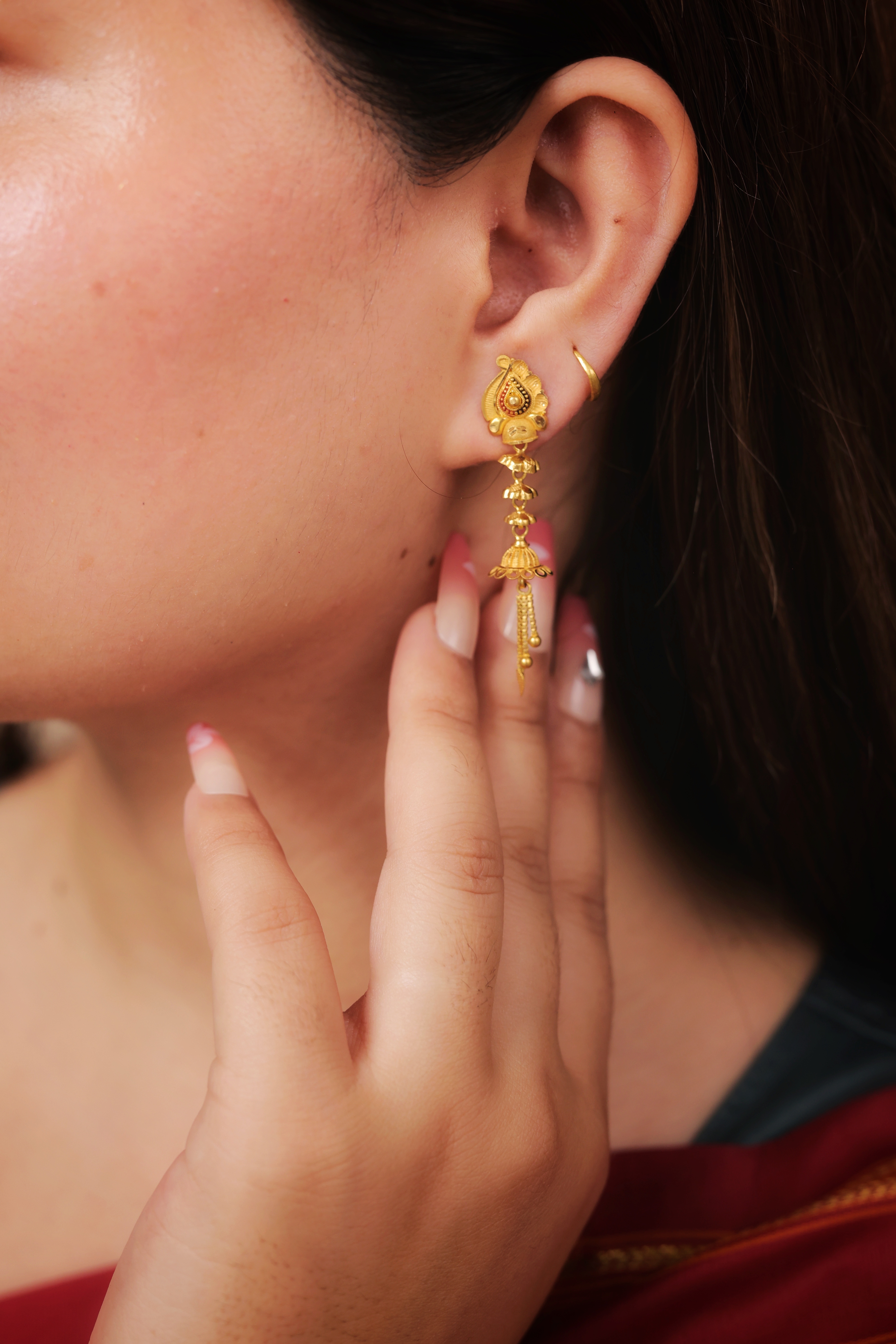 Key Features:Design: Detailed stud top connected to a central bell-shaped drop and multiple small accents. Embellishments: Features intricate gold filigree, granulation, and a three-piece gold drop fringe (jhallar). Craftsmanship: Fine, polished gold metalwork emphasizing layering and movement. Metal Purity: 22 Carat Yellow Gold (916 purity). Usage: Ideal for semi-formal events, festivals, or adding a refined traditional flair.