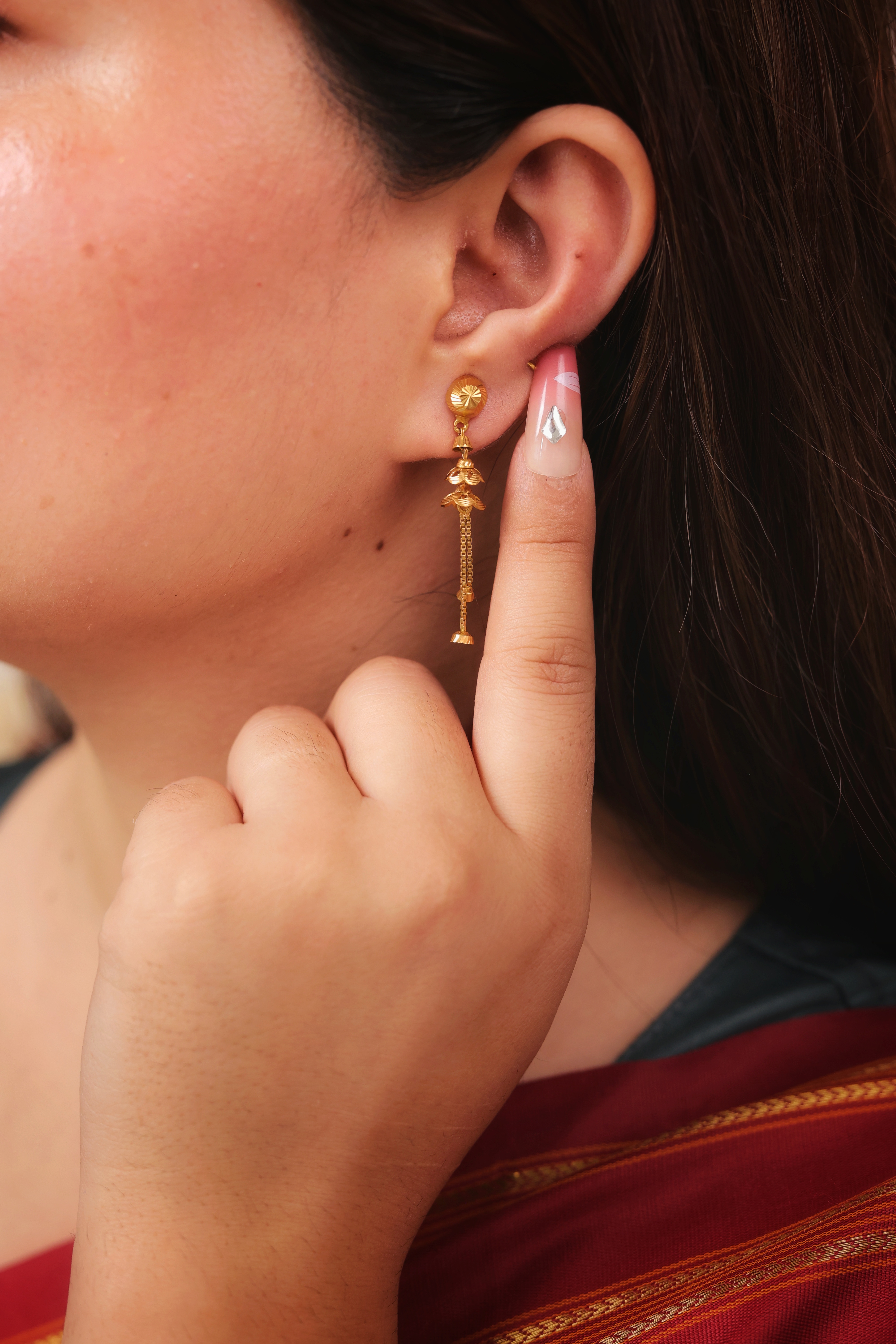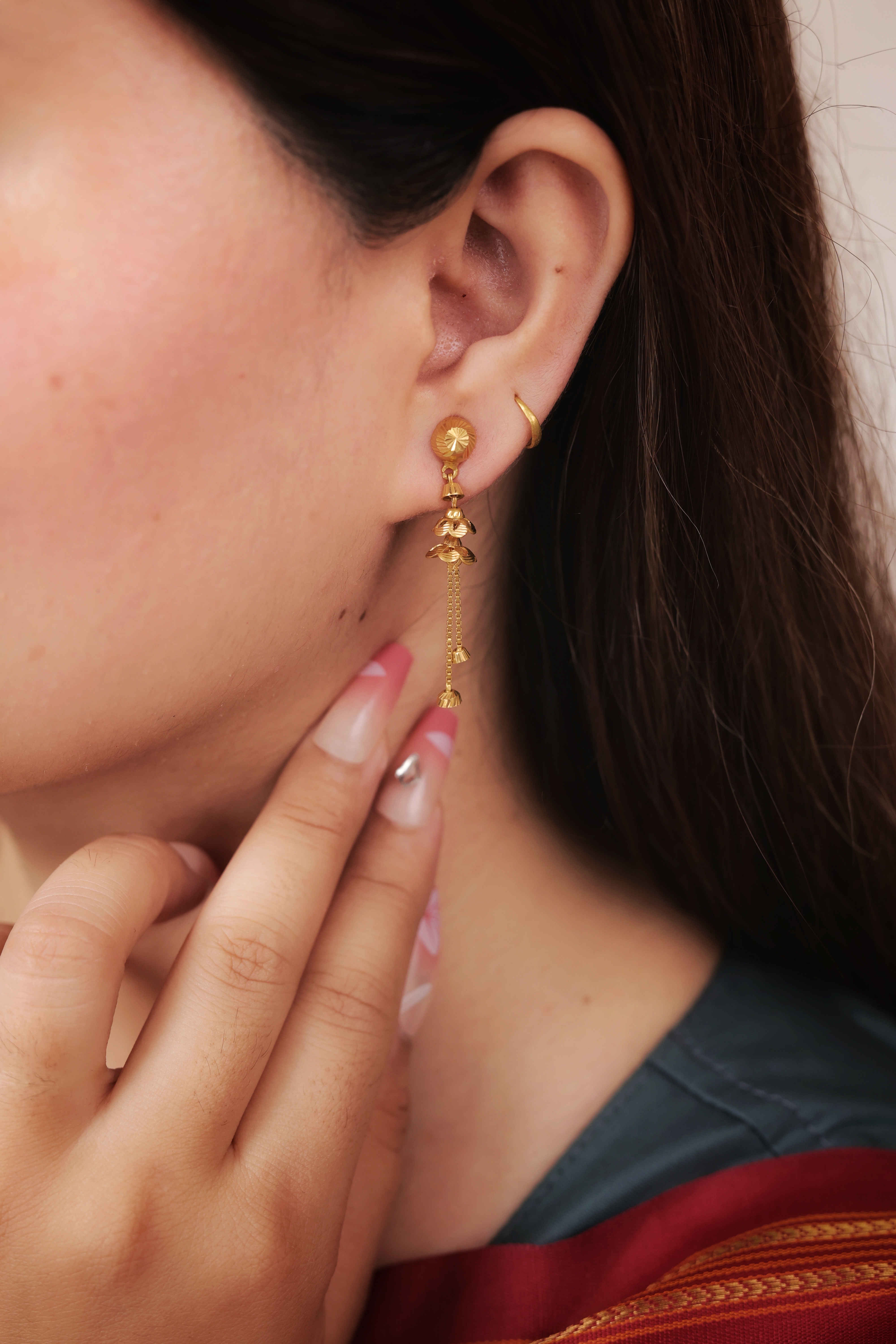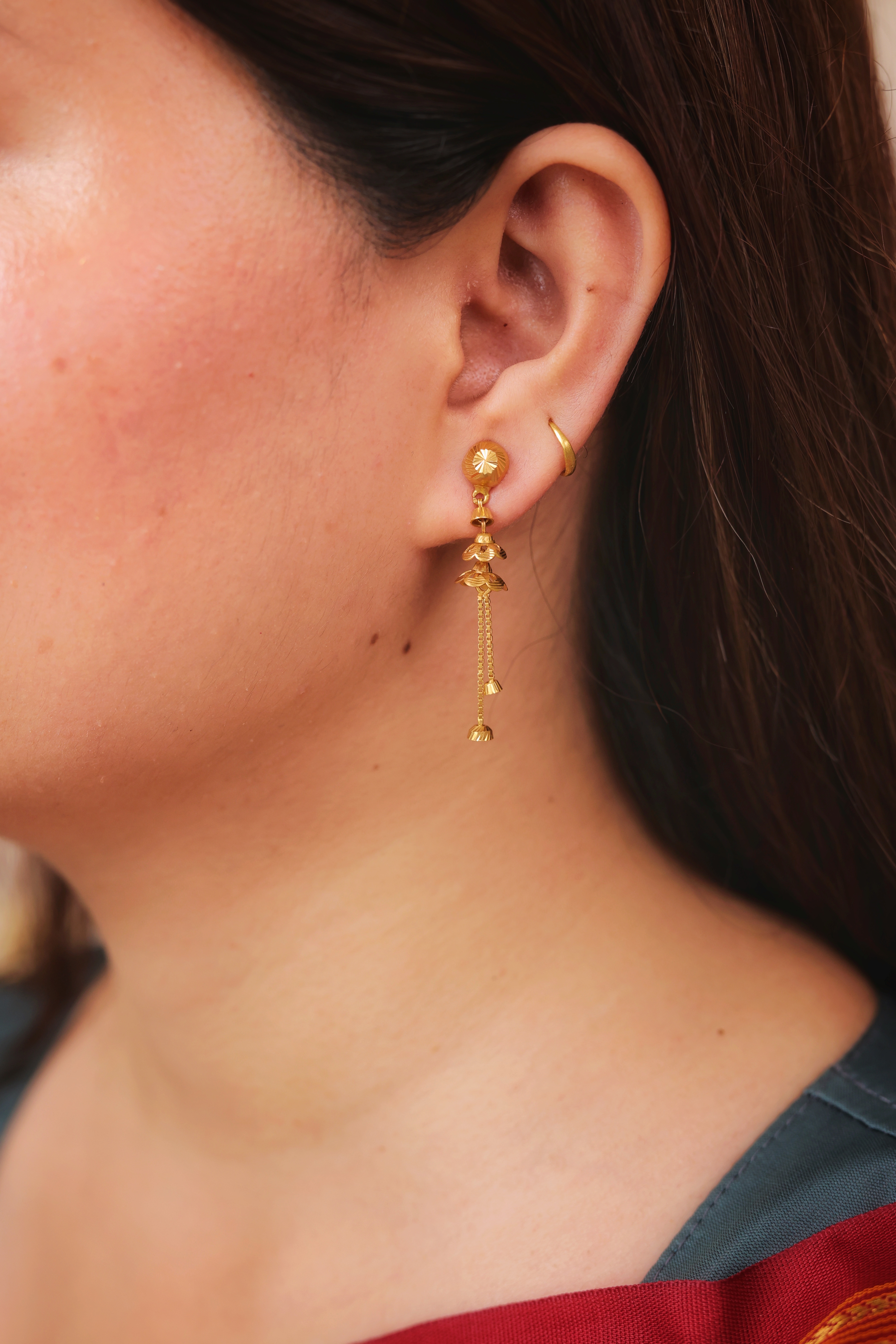 Key Features:Design: Minimalist ball stud connected to an elongated chain drop. Embellishments: Features two small, textured bell-shaped drops along the length. Craftsmanship: Fine, polished gold metalwork emphasizing length and subtle kinetic energy. Metal Purity: 22 Carat Yellow Gold (916 purity). Usage: Ideal for daily wear, or for adding subtle length and elegance to any look.