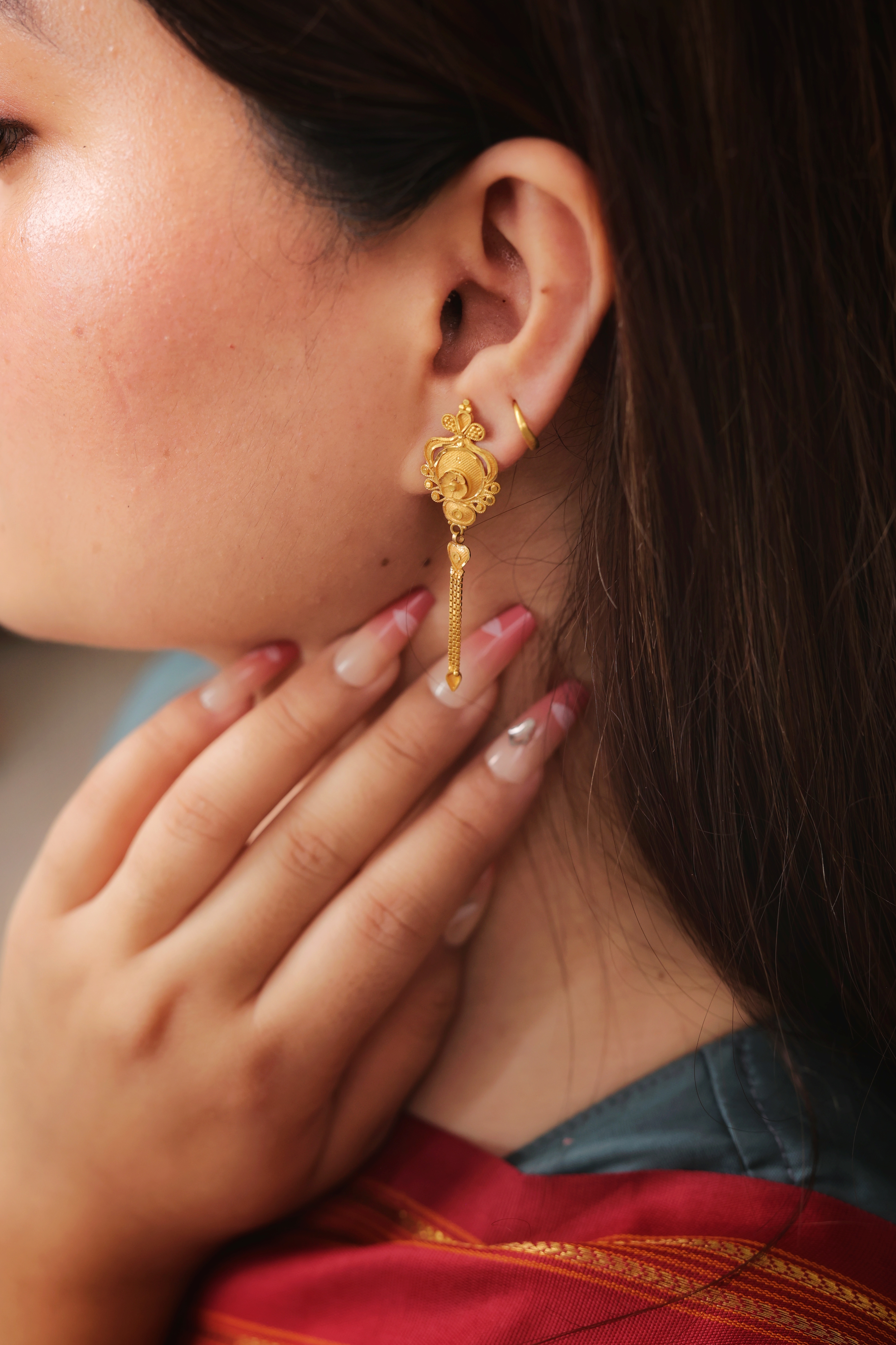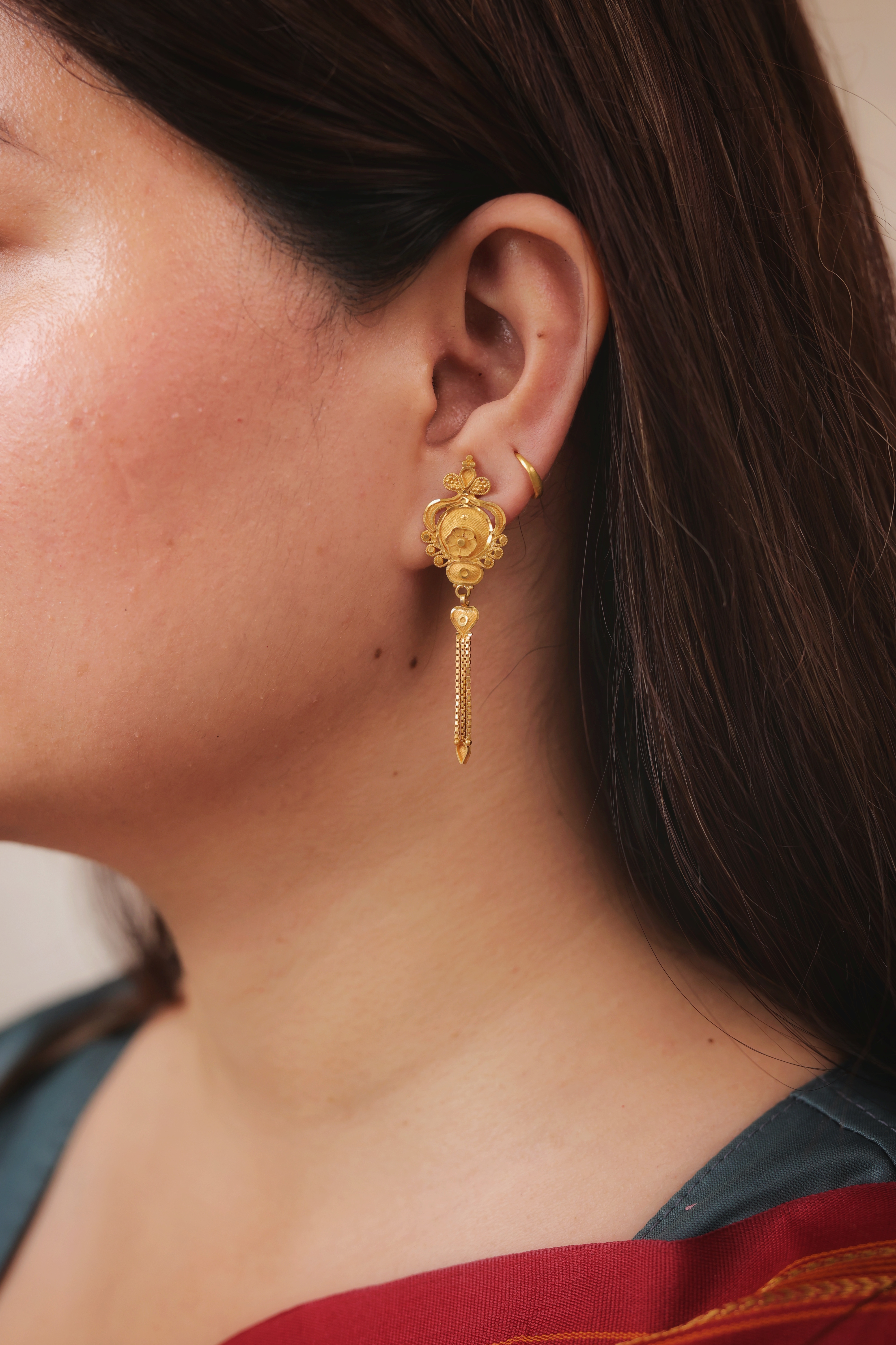 Key Features:Design: Detailed floral stud connected to a double cascading chain drop. Embellishments: Features fine goldwork on the stud and small dangling gold drops. Craftsmanship: Fine, polished traditional gold metalwork emphasizing symmetry and movement. Metal Purity: 22 Carat Yellow Gold (916 purity). Usage: Ideal for daily wear, small ceremonies, or as a graceful traditional accessory.