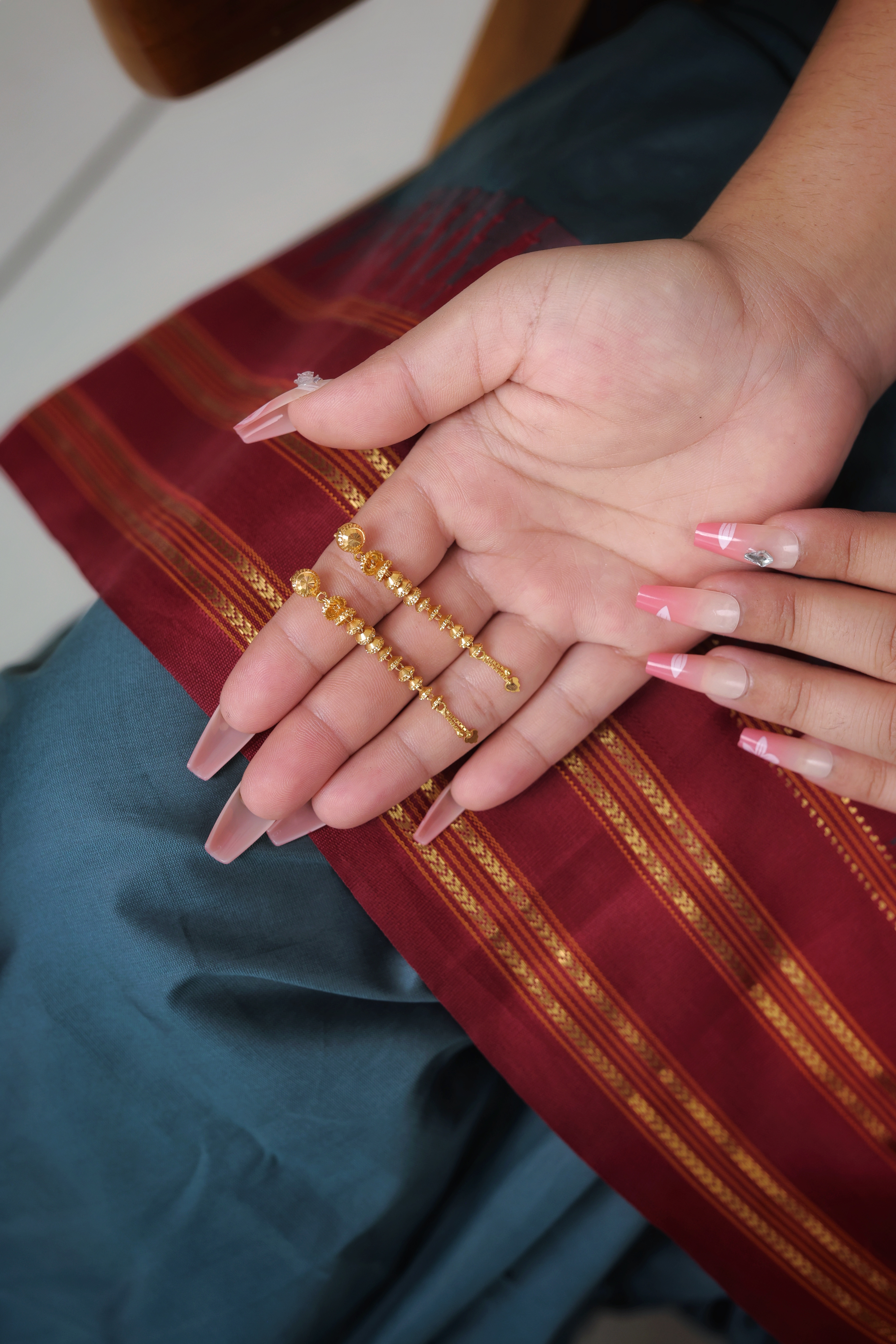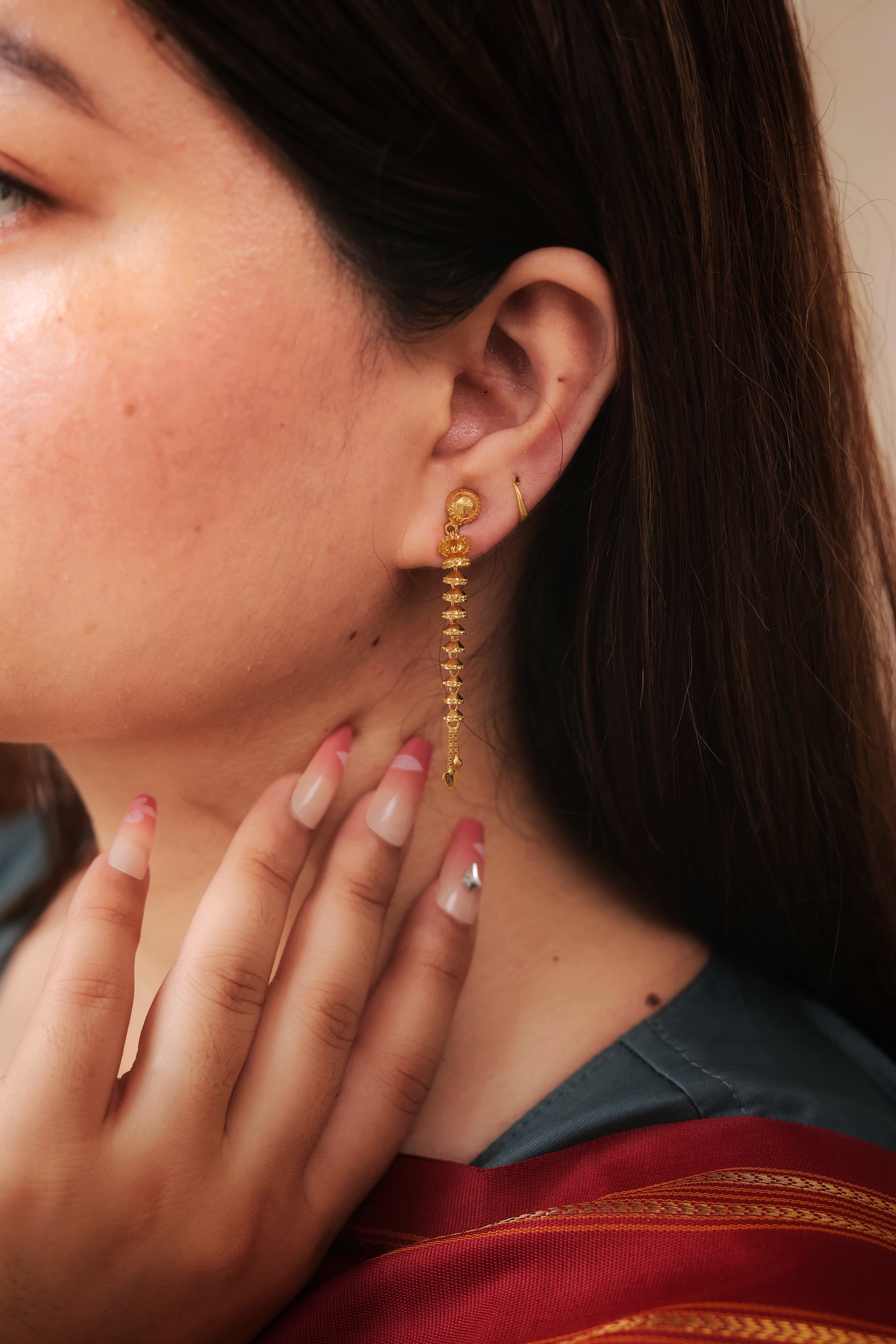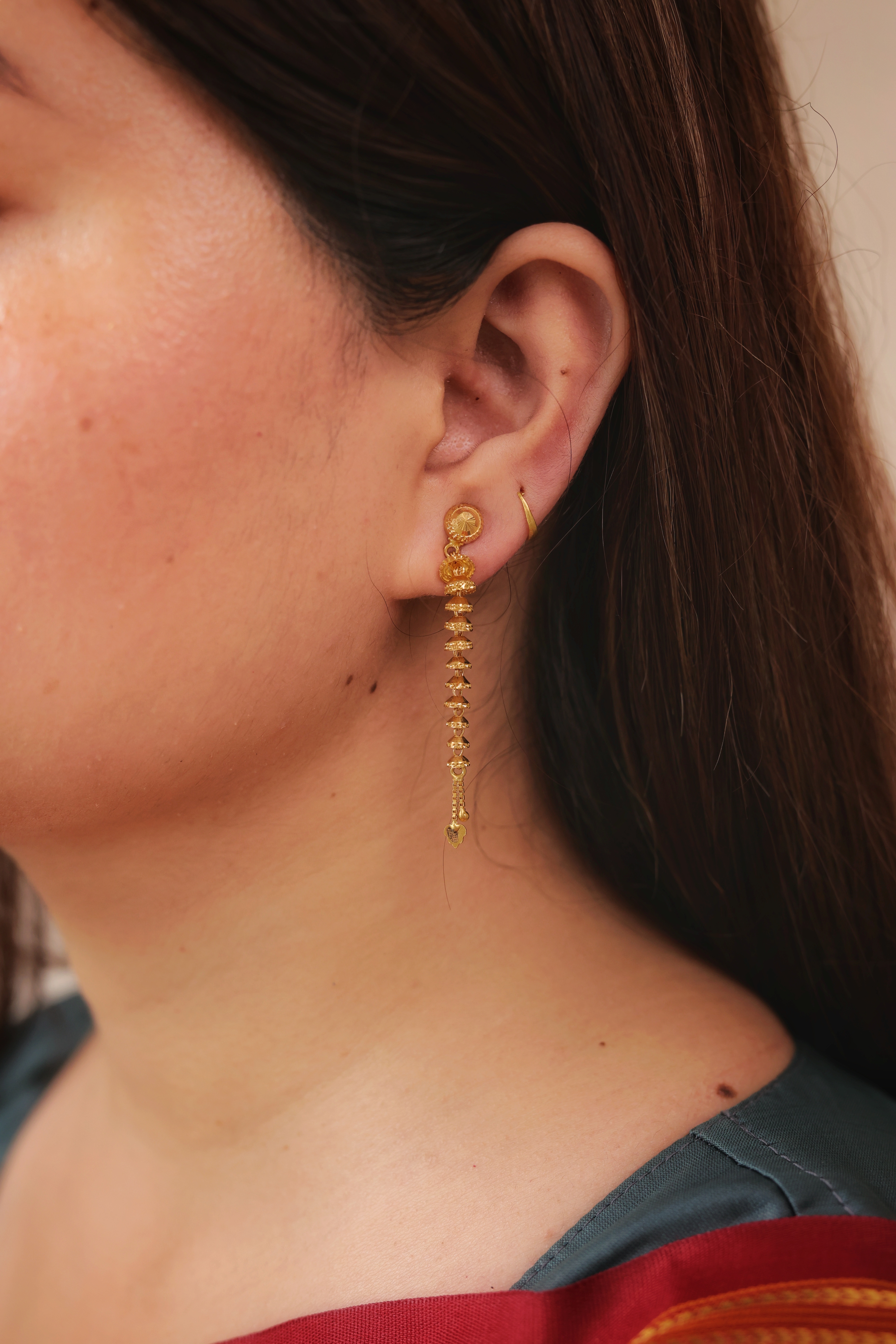 Key Features:Design: Very long, slender earrings with a linear, beaded drop construction. Embellishments: Features uniform, textured gold bead units throughout the drop. Craftsmanship: Fine, polished gold metalwork emphasizing length, movement, and continuous shimmer. Metal Purity: 22 Carat Yellow Gold (916 purity). Usage: Ideal for evening wear, semi-formal events, or making a graceful traditional statement.