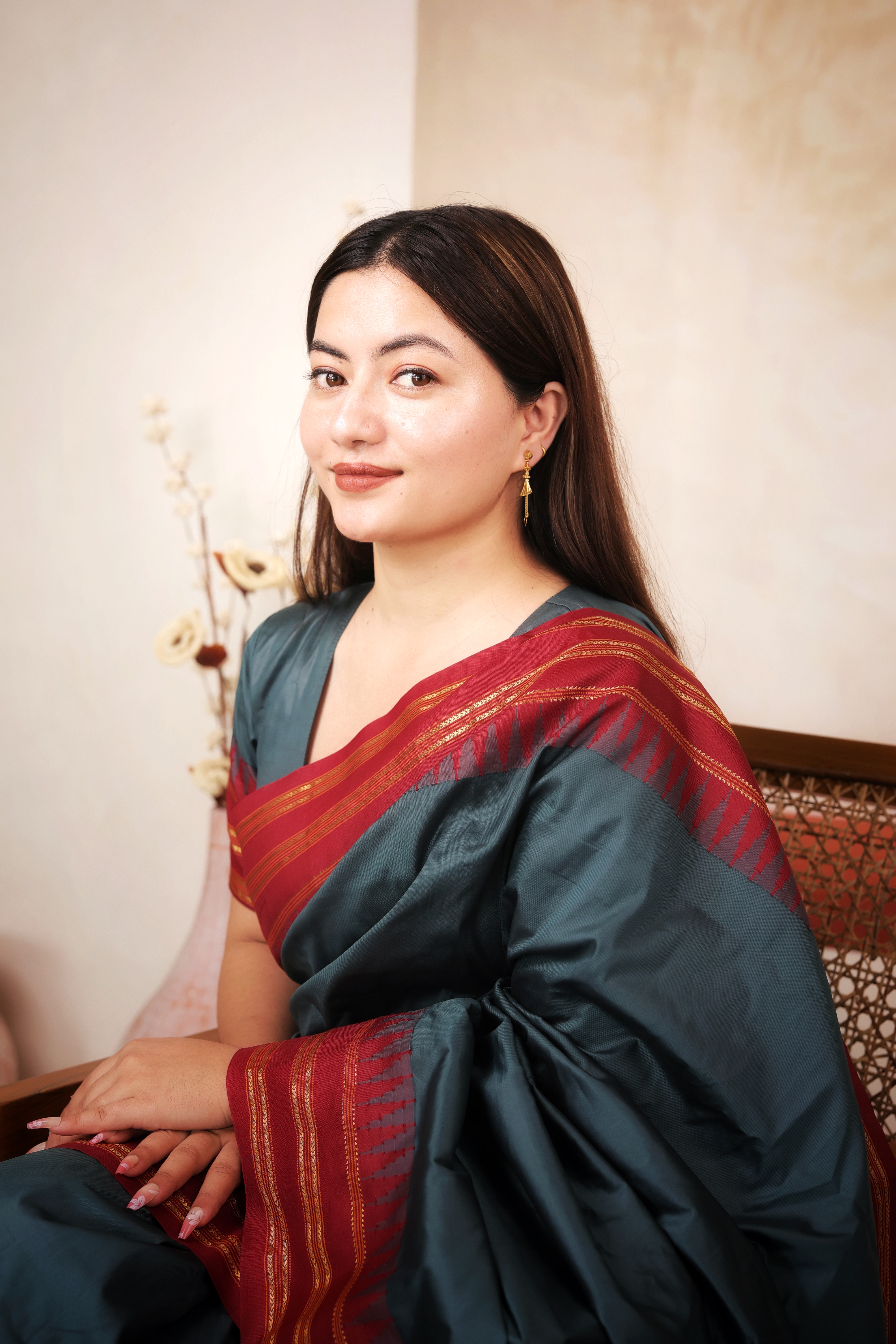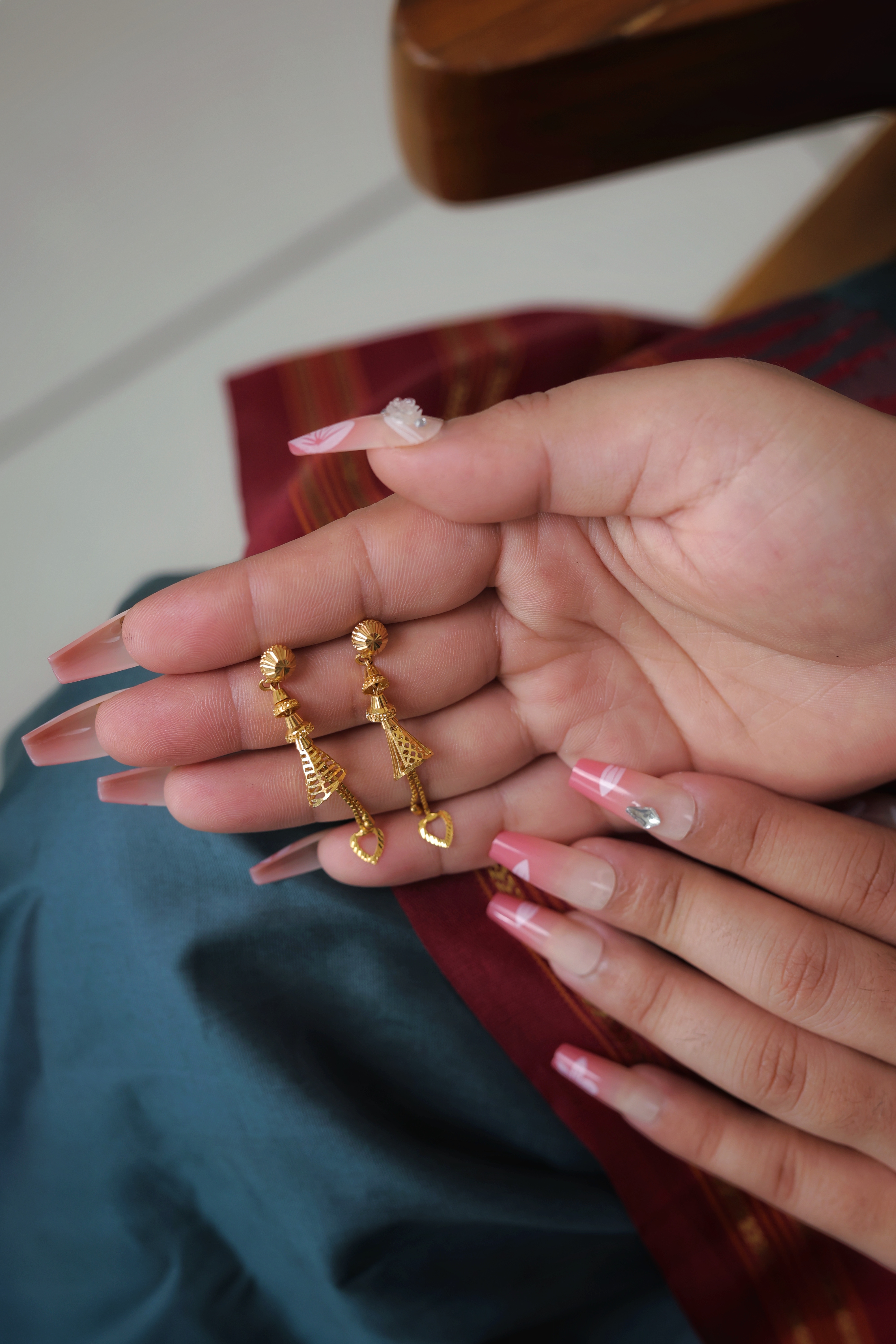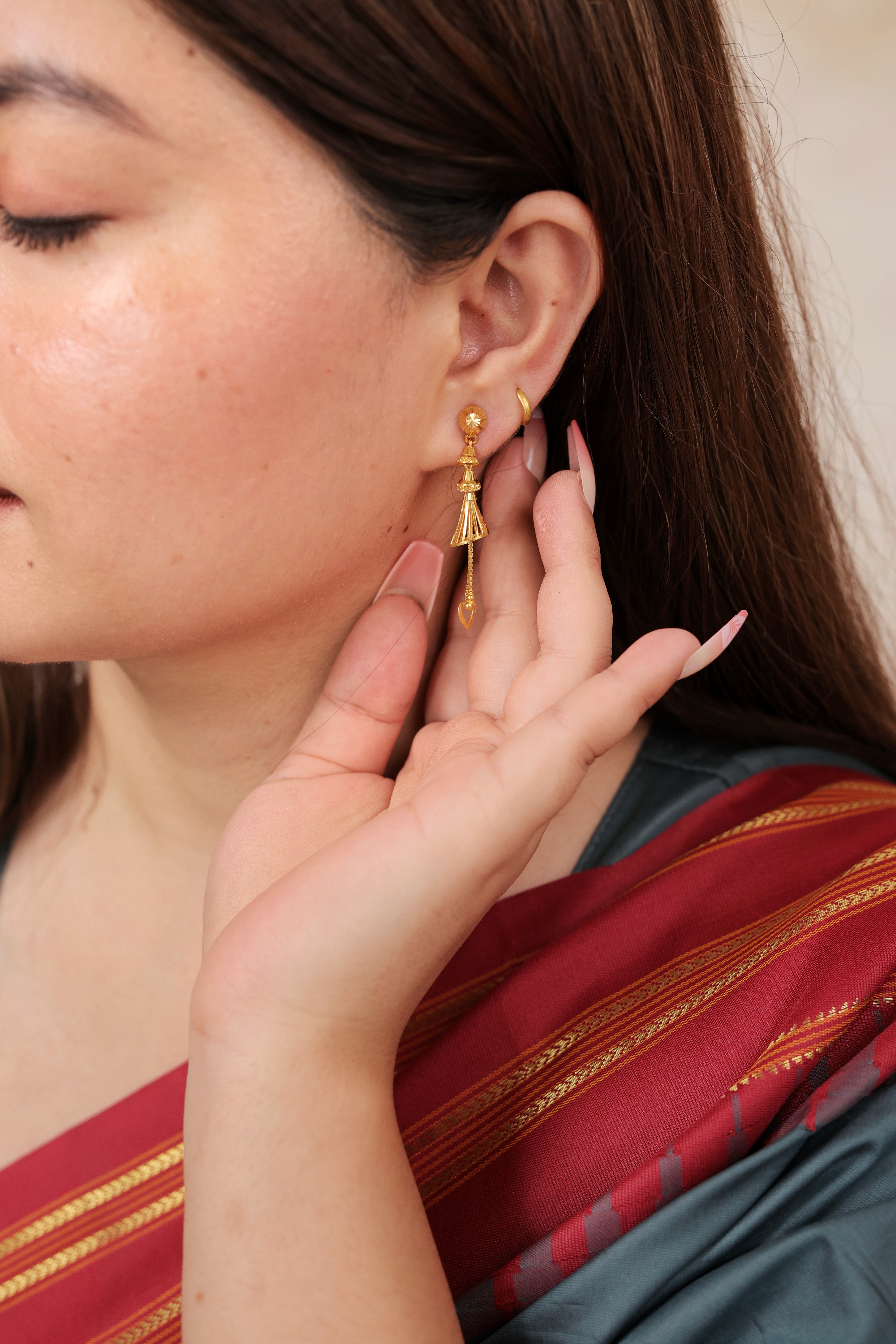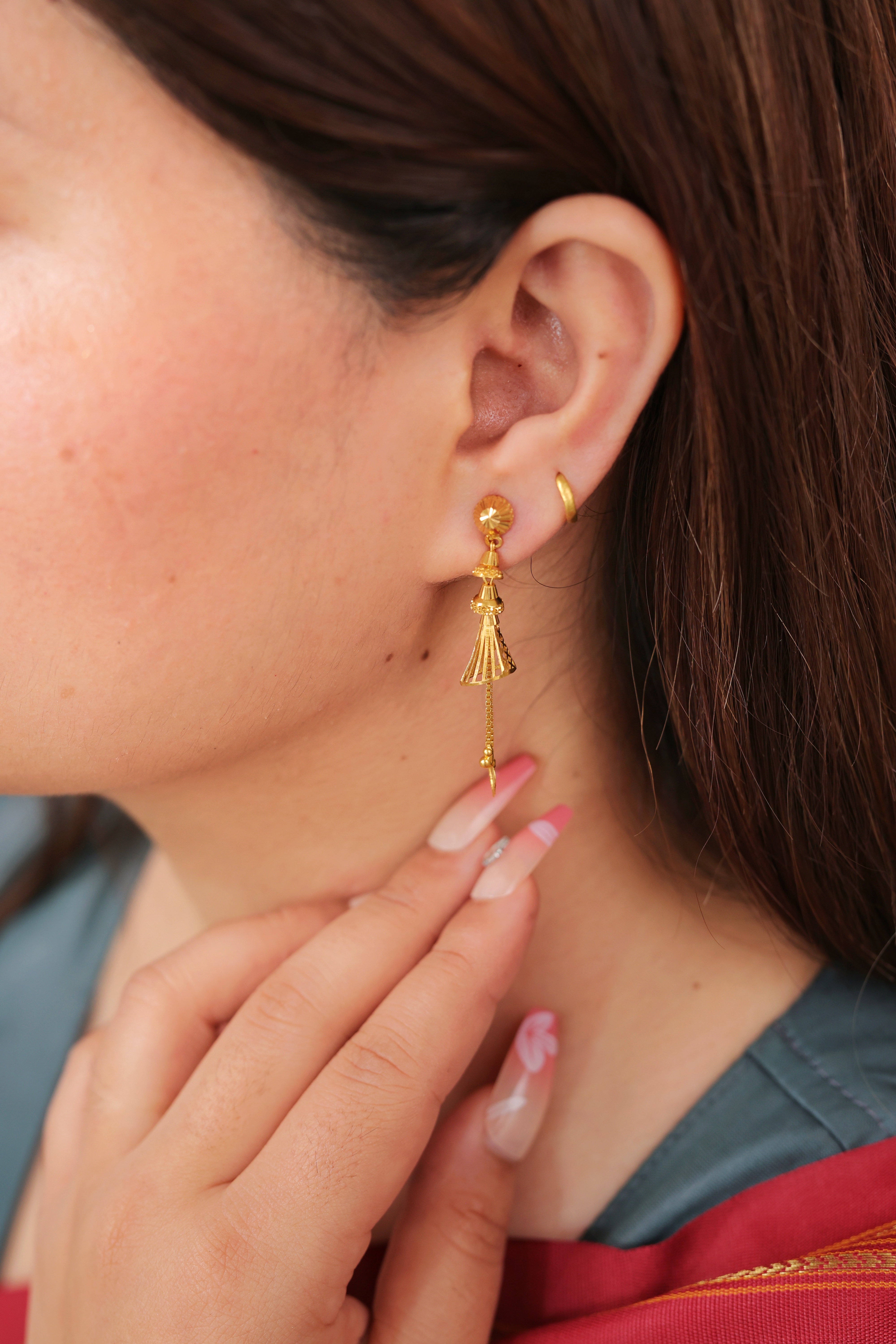 Key Features:Design: Long, articulated drop earrings with a dimensional basket or cage motif. Embellishments: Features highly textured goldwork and layered, architectural elements. Craftsmanship: Detailed traditional metalwork ensuring a volumetric and kinetic look. Metal Purity: 22 Carat Yellow Gold (916 purity). Usage: Ideal for semi-formal to formal events, festivals, or adding a sophisticated traditional statement.