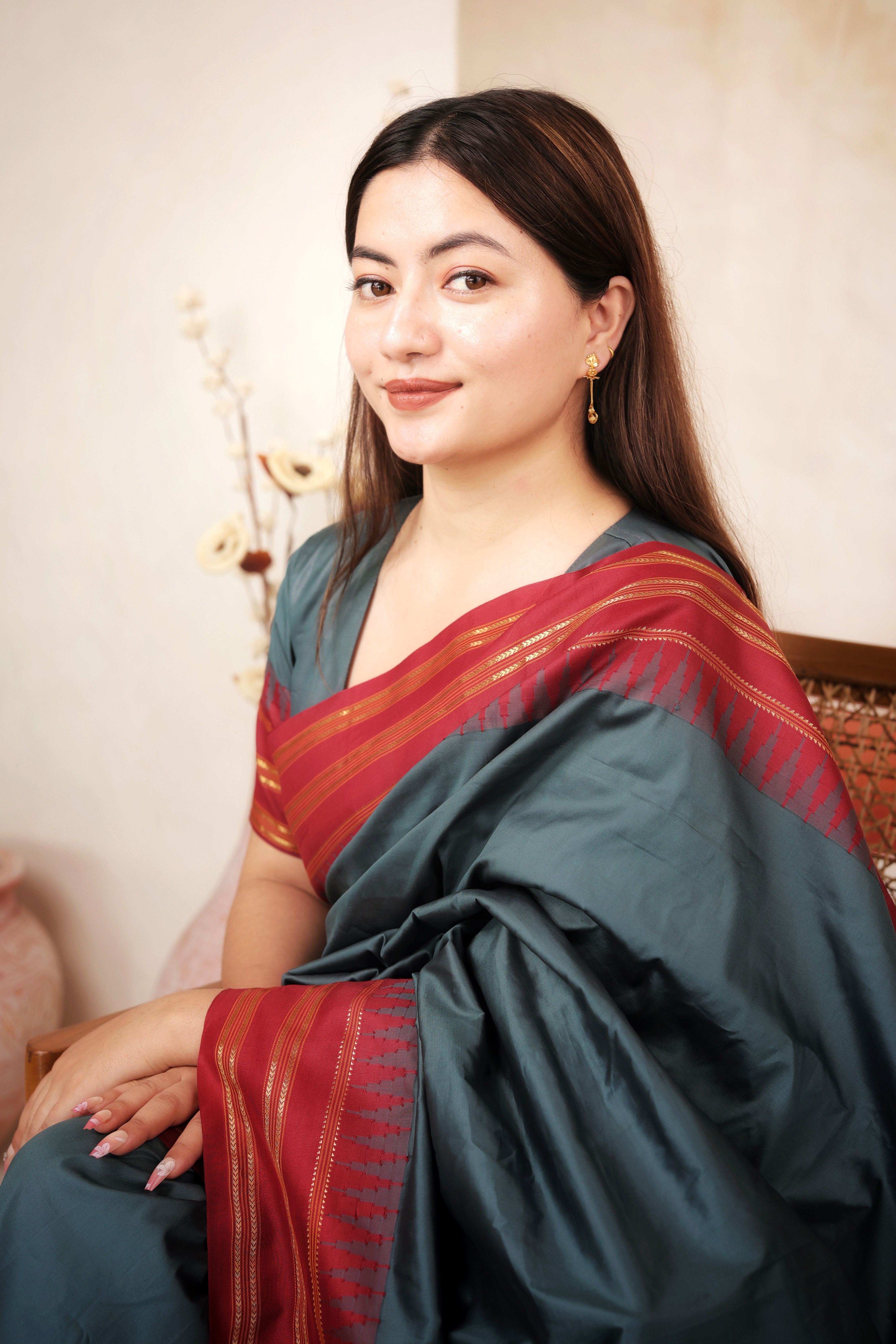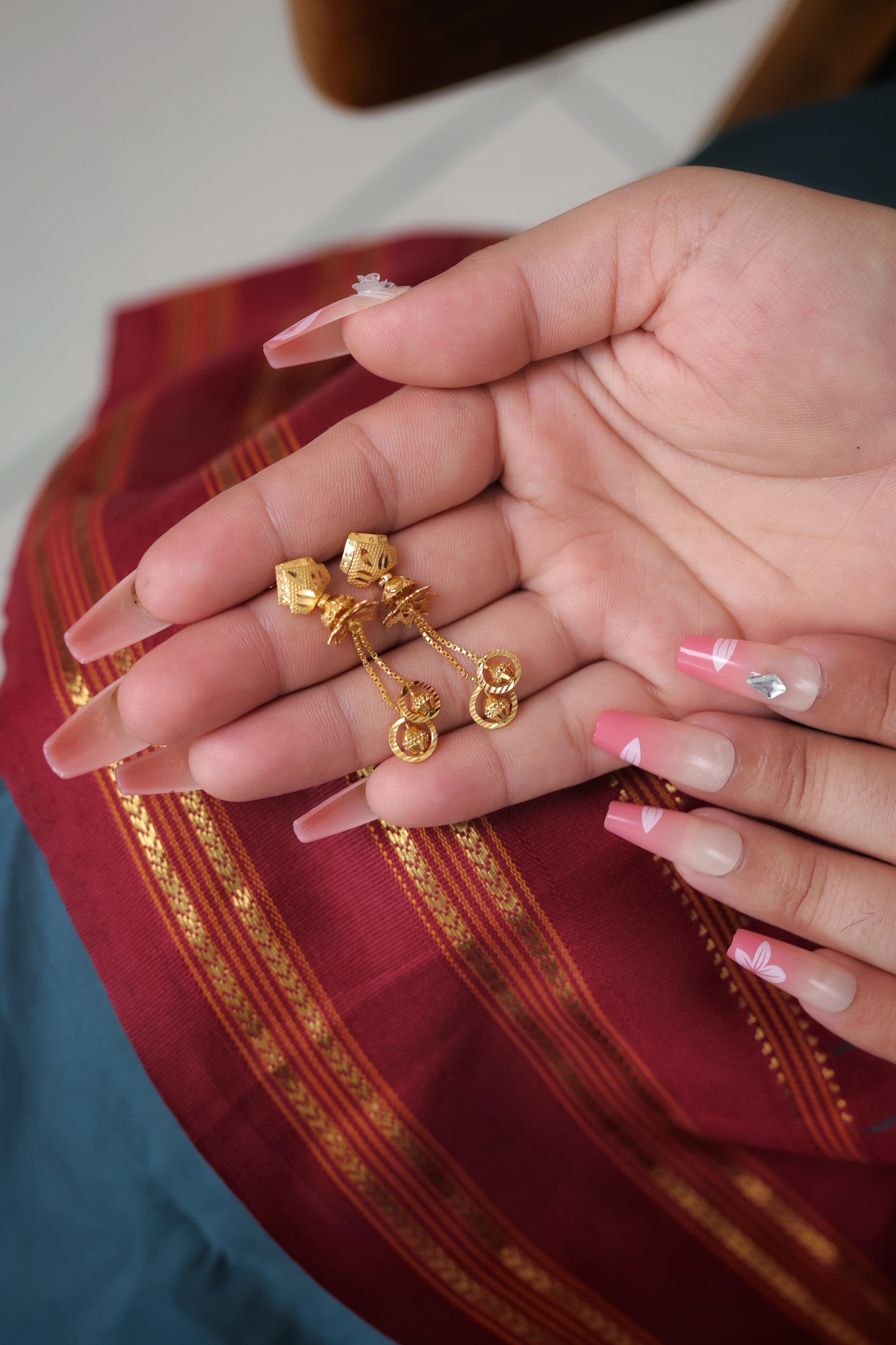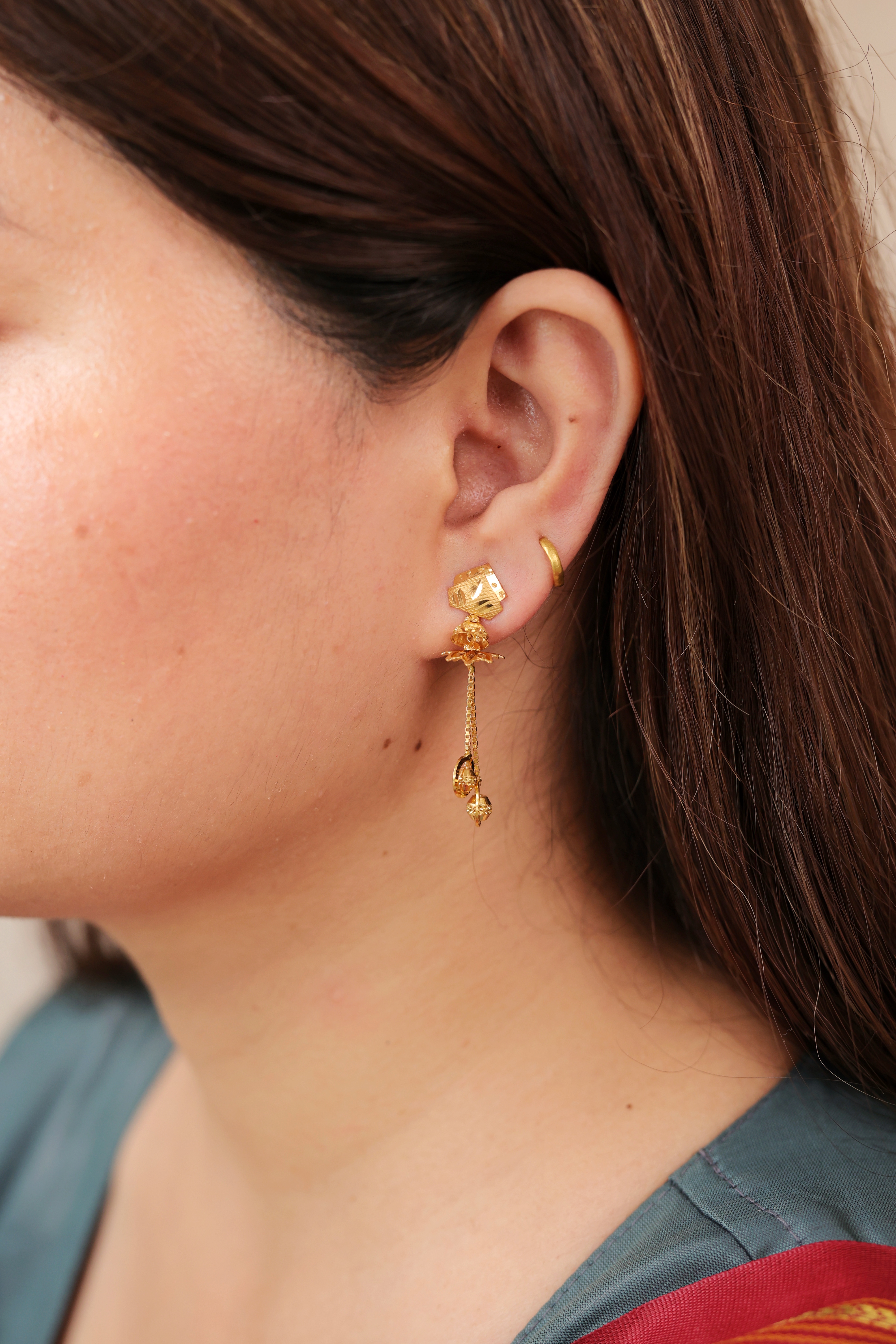 Key Features:Design: Geometric stud connected to an articulated drop featuring two concentric circular units. Embellishments: Features intricate goldwork on the stud and textured, articulated drops. Craftsmanship: Fine, polished traditional gold metalwork emphasizing geometric shape and movement. Metal Purity: 22 Carat Yellow Gold (916 purity). Usage: Ideal for daily wear, semi-formal events, or as a sophisticated traditional accessory.