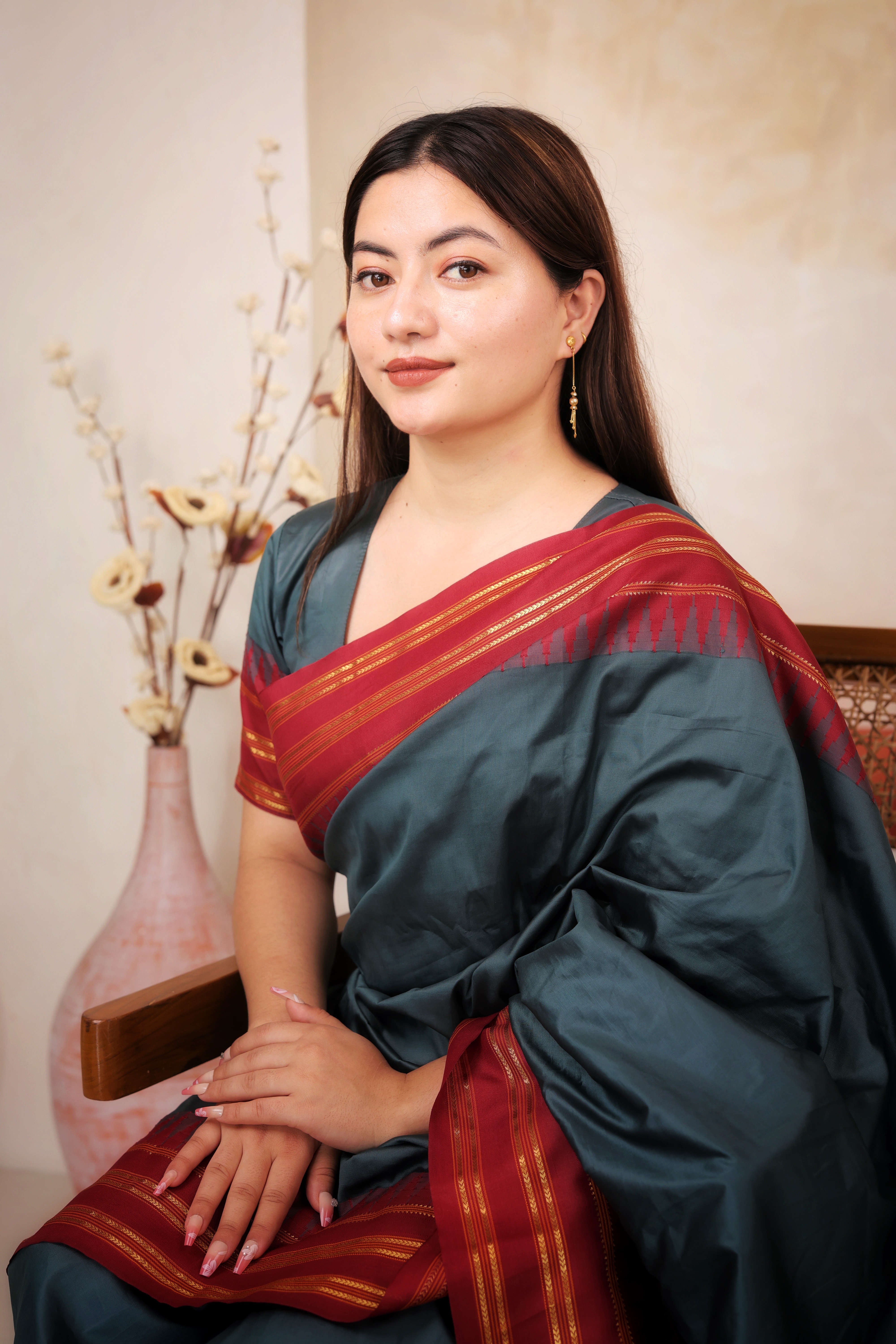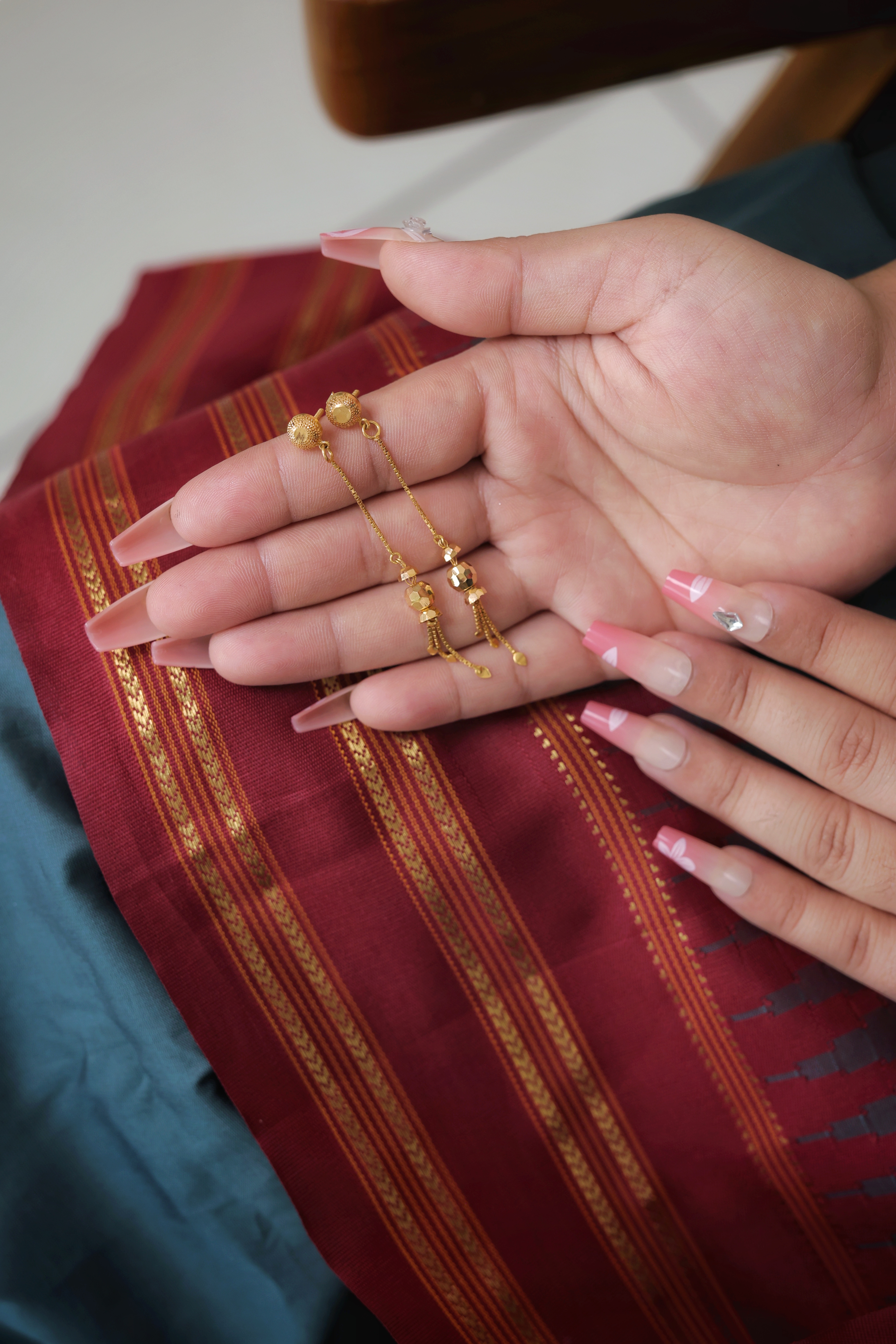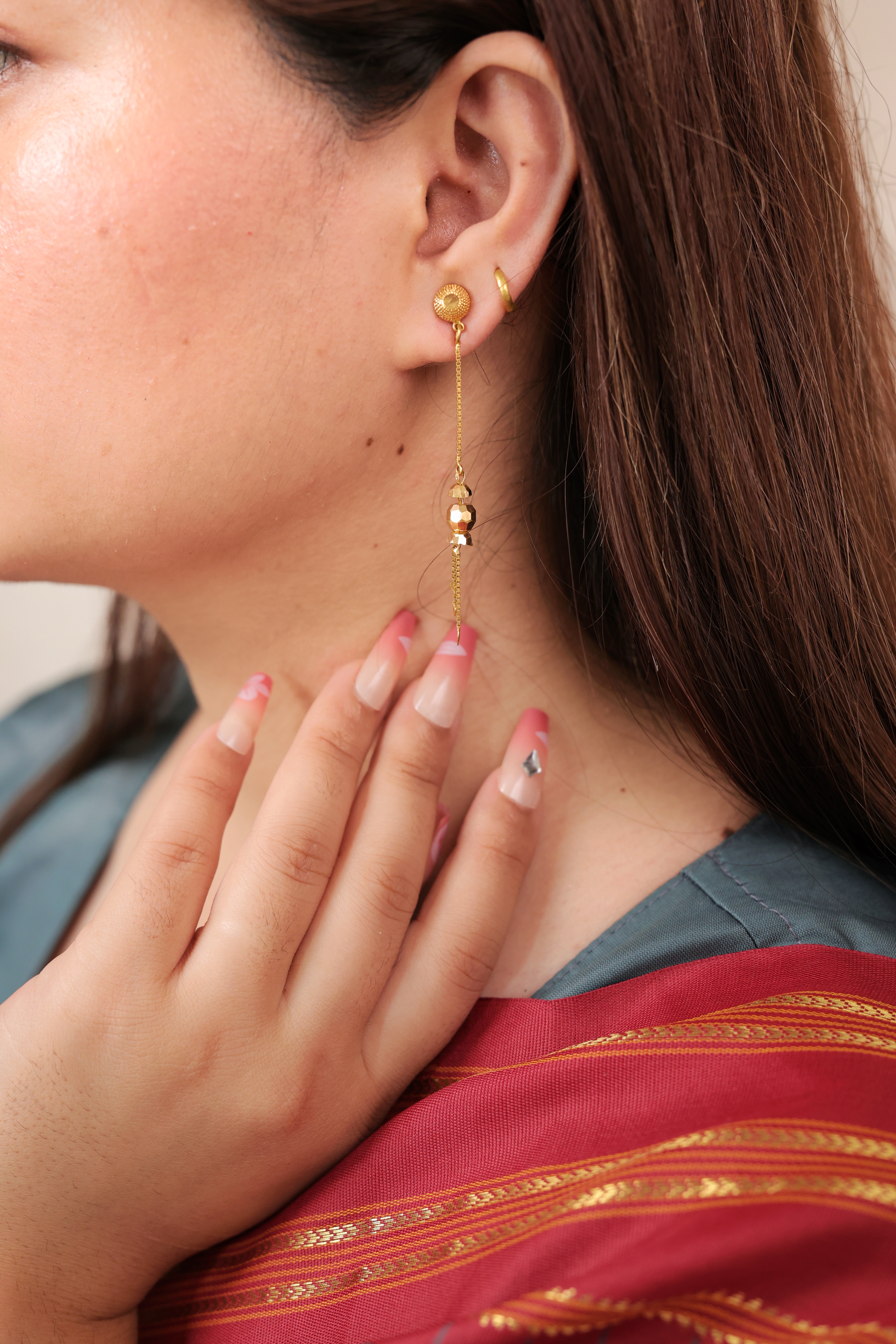 Key Features:Design: Long, linear drop earrings featuring a ball stud, chain, and a single drop. Embellishments: Features a textured gold ball stud and a small, faceted gold drop. Craftsmanship: Fine, polished gold metalwork emphasizing length and subtle kinetic energy. Metal Purity: 22 Carat Yellow Gold (916 purity). Usage: Ideal for daily wear, or for adding subtle length and elegance to any look.