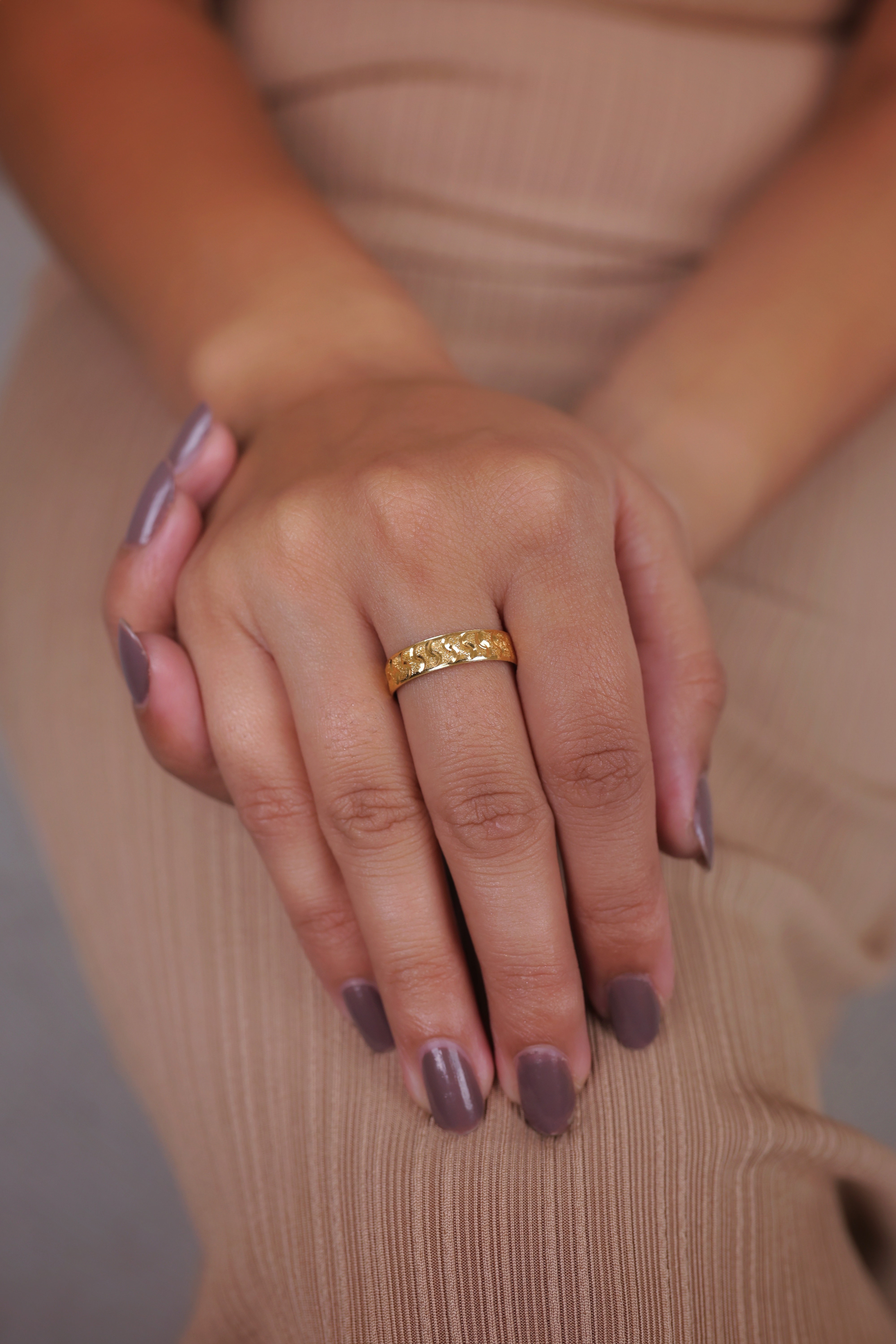 Key Features:Design: Medium-width band ring with a detailed, continuous surface pattern. Embellishments: Features an intricate textured (hammered/leaf) finish and soft, scalloped edges. Craftsmanship: Traditional gold metalwork emphasizing detailed surface patterning. Metal Purity: 22 Carat Yellow Gold (916 purity). Usage: Ideal for daily wear, pairing with other rings, or as a classic yet detailed gold band.