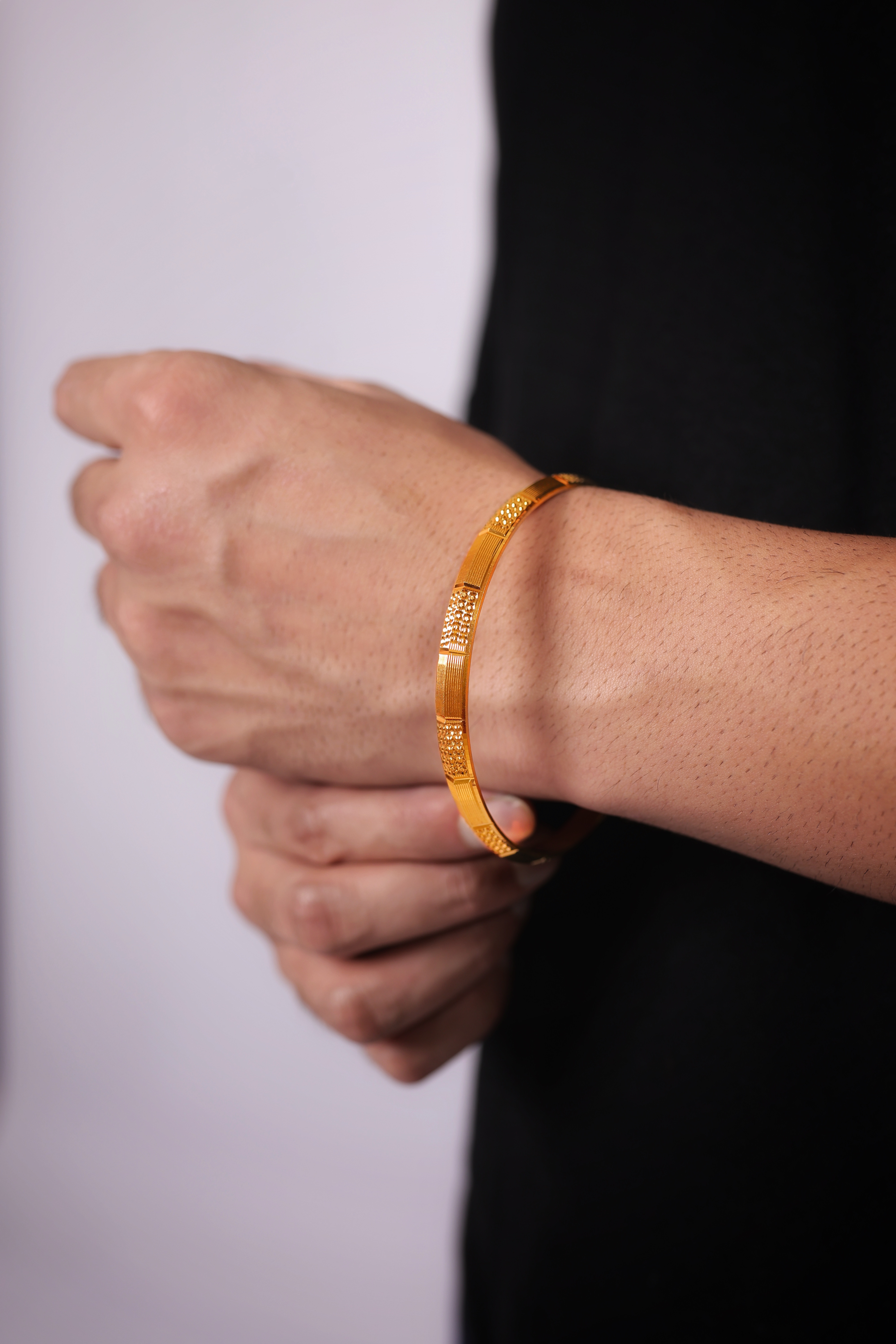 Presenting our 22 Carat Gold Textured Block-Pattern Men’s Kada, designed for men who appreciate simplicity blended with sophistication. This kada features a clean, flat structure with evenly spaced engraved block patterns that give it a unique geometric appeal. The polished finish adds a premium shine, while the textured detailing enhances its bold and masculine character.