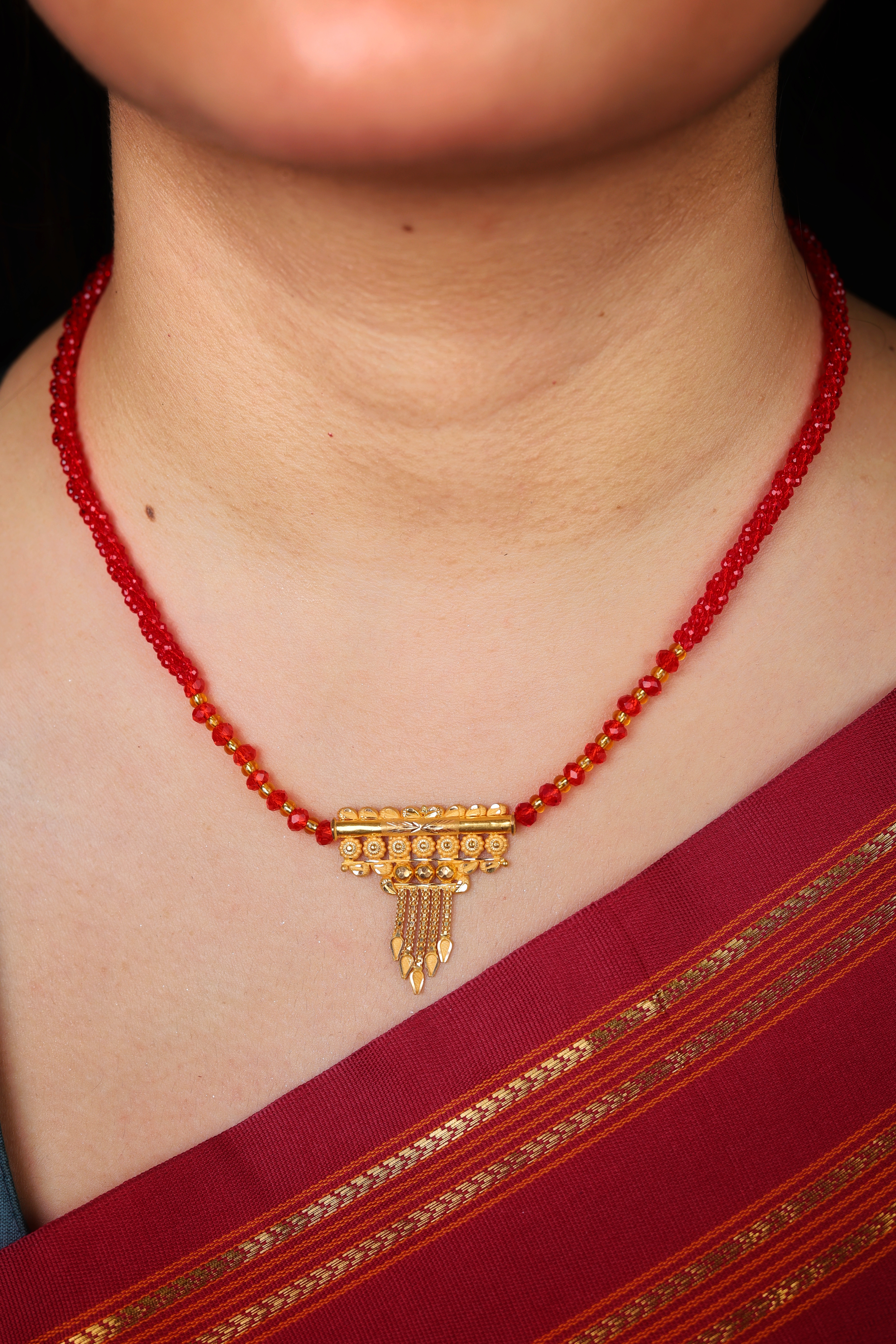 The necklace is constructed from a traditional single strand of small, deep red beads, often used as an alternative or accent to the traditional black beads in some regional styles. The centerpiece is a prominent, multi-tiered gold pendant reminiscent of traditional temple jewelry or a small royal roof structure. The top section is rectangular and ornate, supporting a lower tier from which several polished gold drops or tassels (the jhallar) gracefully hang. The pendant's surface is detailed with fine texture and subtle cutout work.