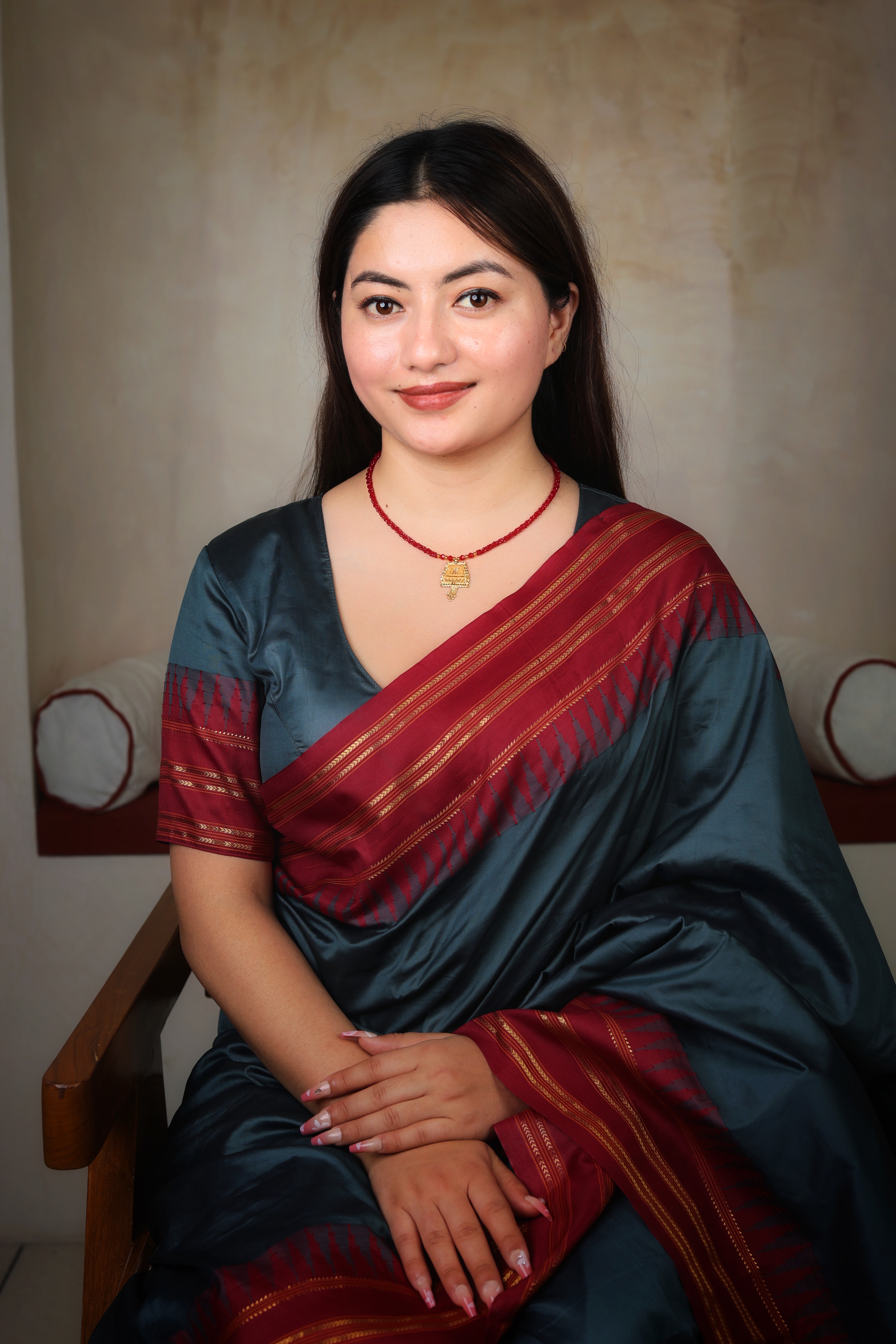 A distinctive, short-length mangal sutra featuring a traditional, square-shaped gold pendant with a tiered, temple-like structure and a single long drop, suspended from a single strand of deep red beads.