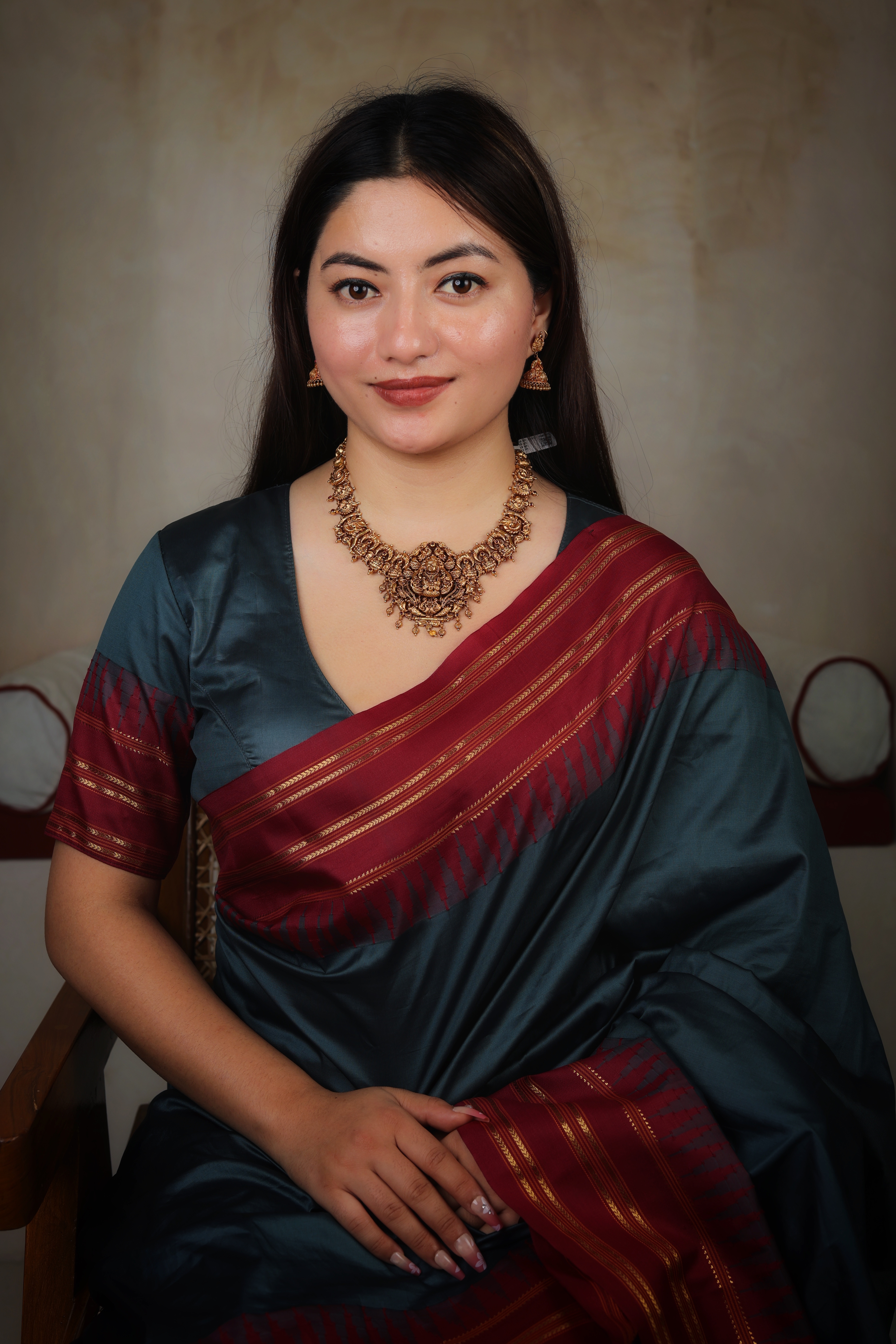 Key Features:Design: Broad, collar-style statement necklace with traditional South Indian Temple design. Centerpiece: Deeply sculpted motif of a Hindu Goddess (likely Lakshmi). Chain/Links: Continuous, detailed links featuring floral, vine, and possibly mythical creature motifs. Metal Finish: Antique Gold Finish (often over 22 Carat Gold or high-quality plating). Usage: Ceremonial wear, traditional weddings, classical dance performances, and high-impact festive occasions.