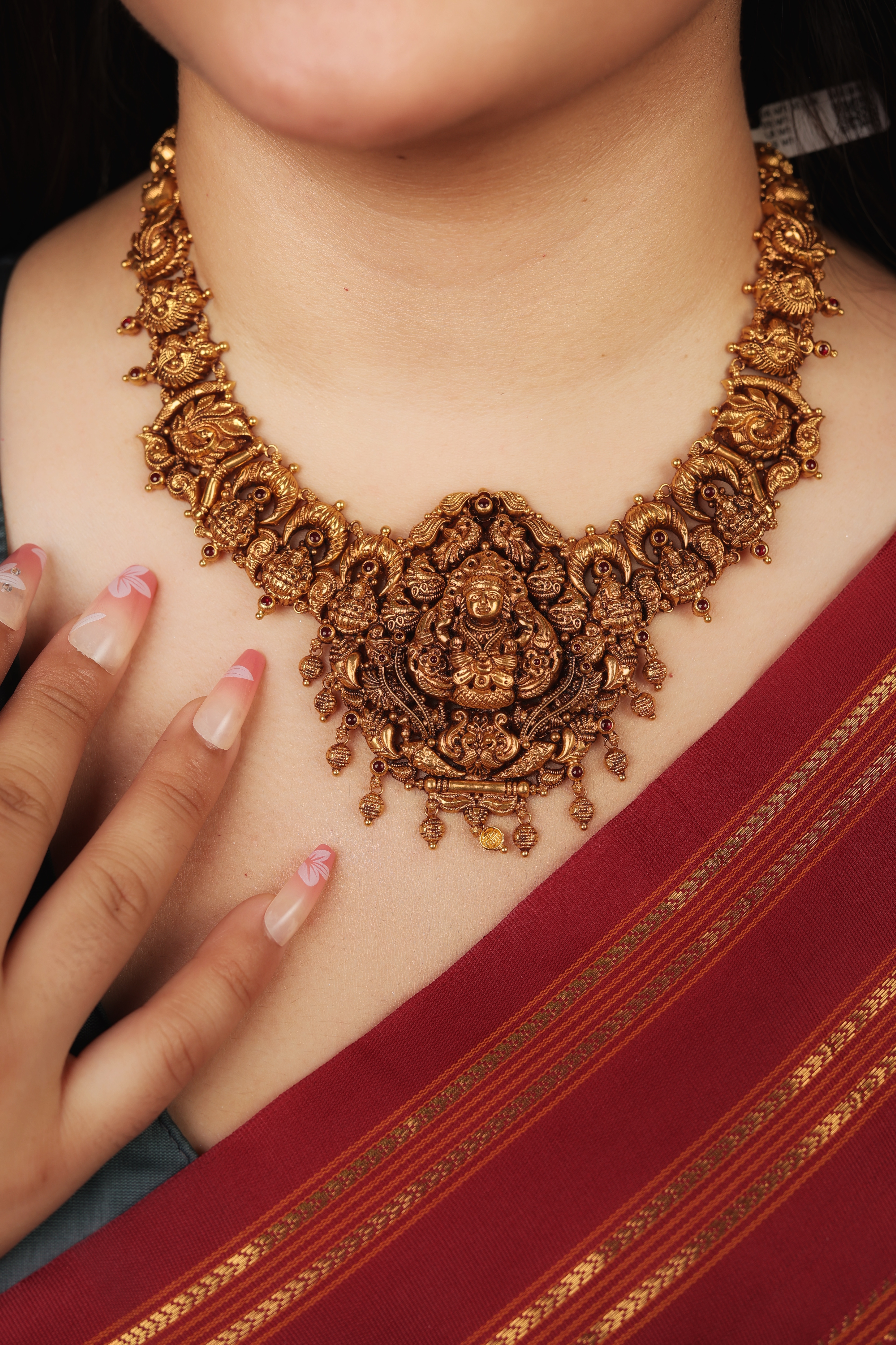 A breathtaking, broad statement necklace featuring intricate traditional South Indian temple artistry, centered with a finely sculpted representation of Goddess Lakshmi.