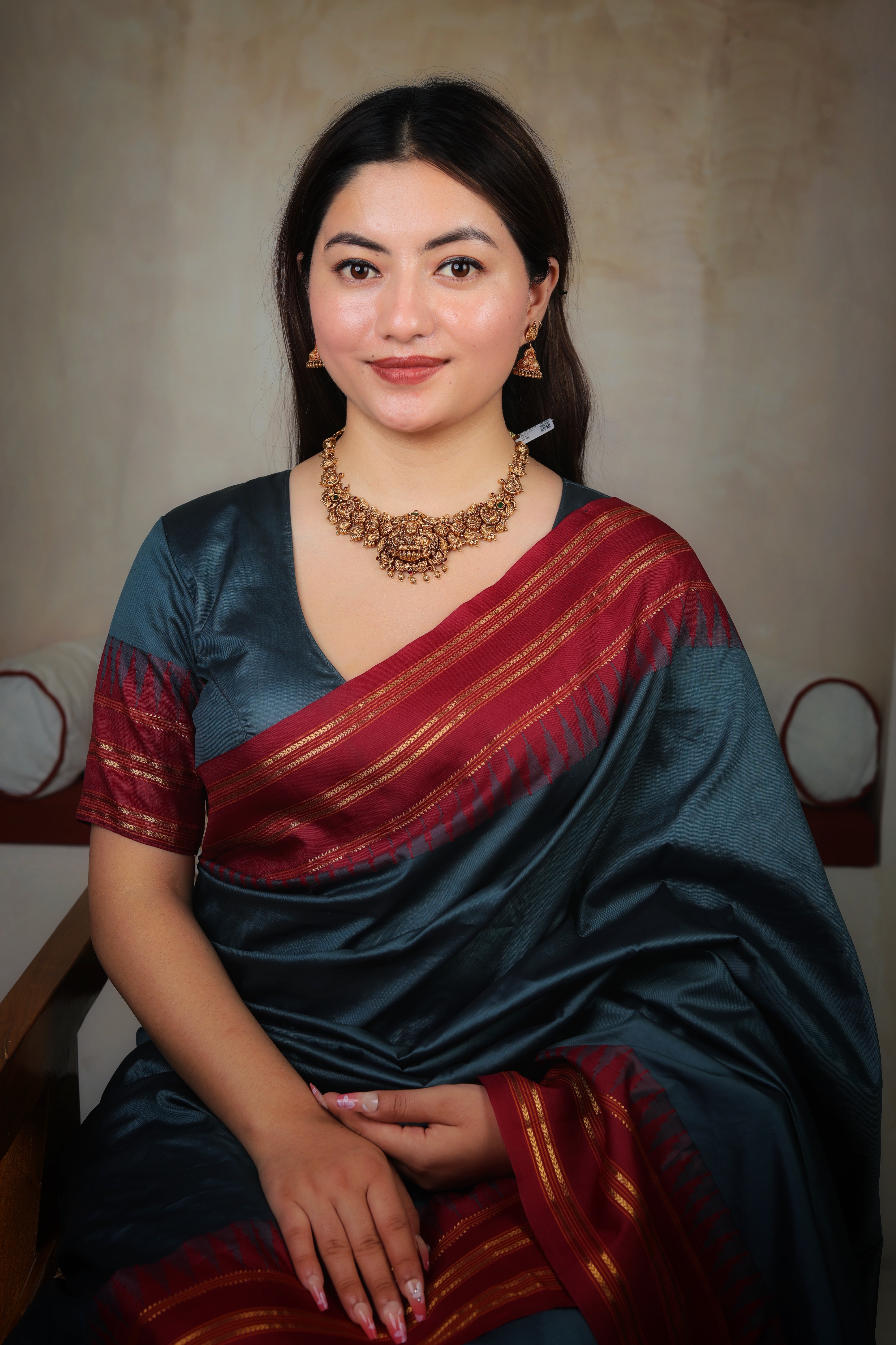Key Features:Design: Broad, choker-style statement necklace with traditional South Indian Temple design. Centerpiece: Deeply sculpted motif of a Hindu Goddess (likely Lakshmi) and surrounding ornate elements. Chain/Links: Continuous, detailed links incorporating traditional motifs and accented with small red and green stones. Metal Finish: Antique Gold Finish (often over 22 Carat Gold or high-quality plating). Usage: Ceremonial wear, traditional weddings, classical dance performances, and high-impact festive occasions.